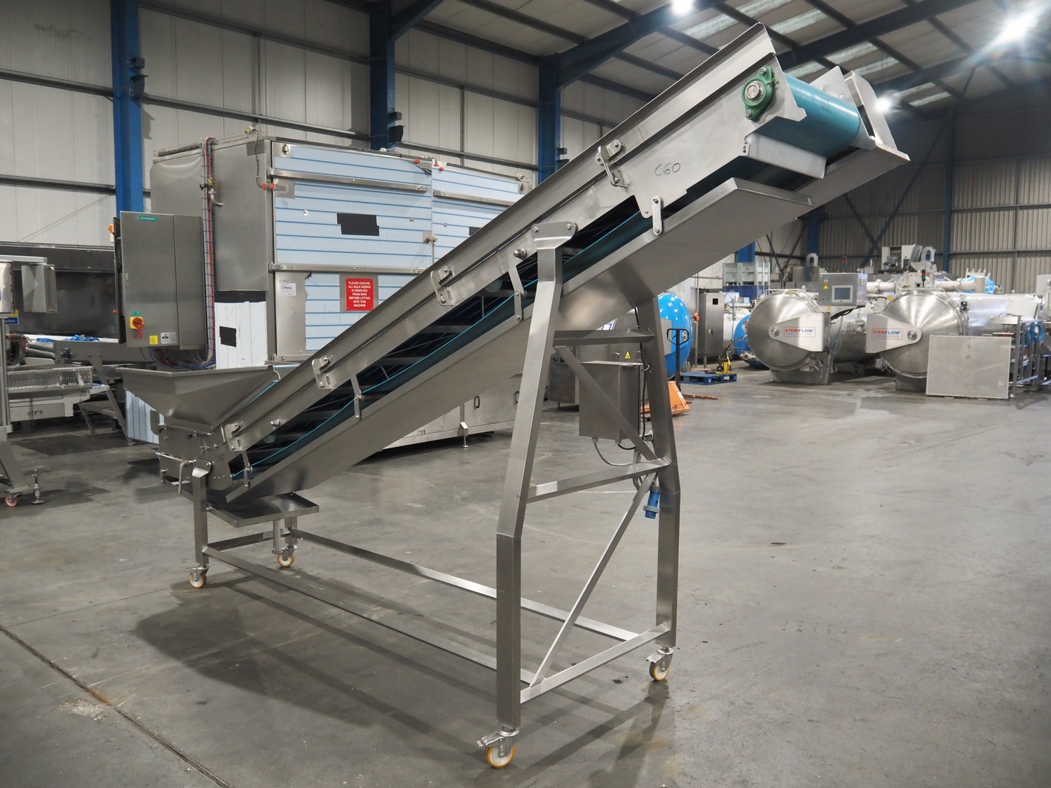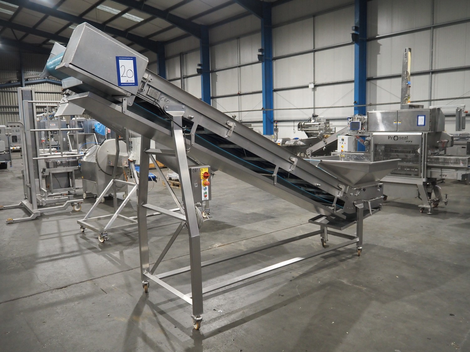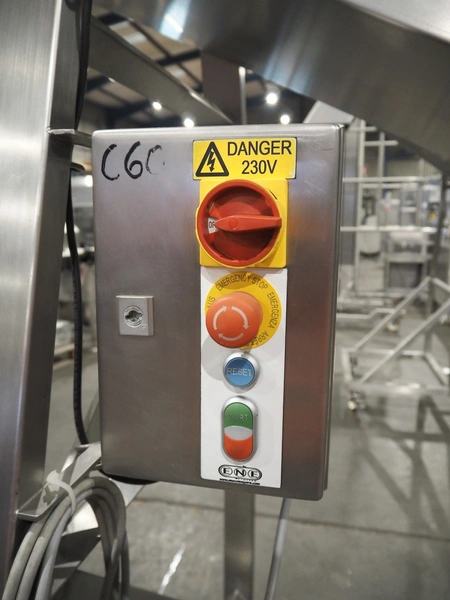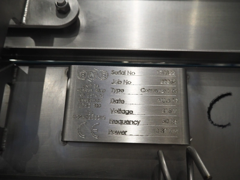 ENE mobile elevating belt, type: Conveyor 1 05, serial number: 170822, year of construction: AUG 17, 415 V, 50 Hz, 0.37 kW, s/s frame, plastic belt, belt width: 500 mm, elevating height: 2300 mm, total dimensions: 4200 mm x 1100 mm x 2400 mm.