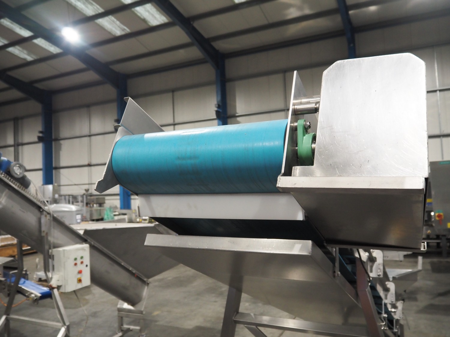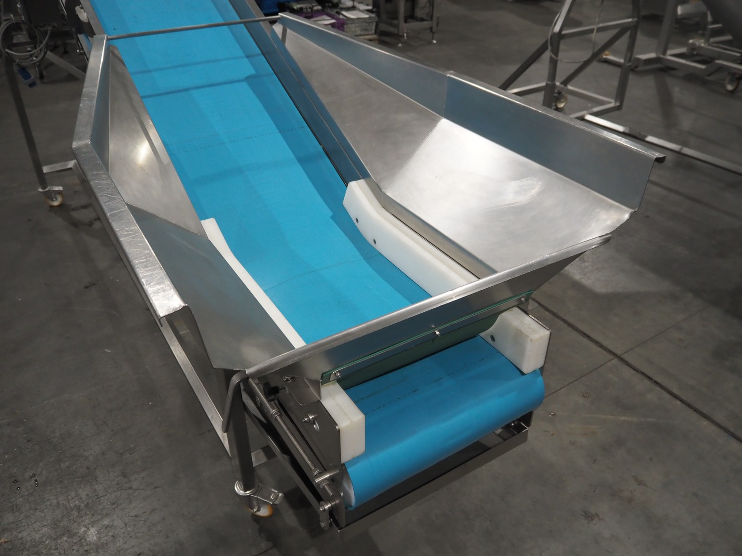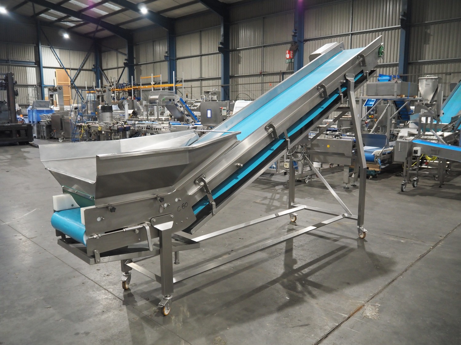ENE mobile elevating belt, type: Conveyor 1 05, serial number: 170822, year of construction: AUG 17, 415 V, 50 Hz, 0.37 kW, s/s frame, plastic belt, belt width: 500 mm, elevating height: 2300 mm, total dimensions: 4200 mm x 1100 mm x 2400 mm.