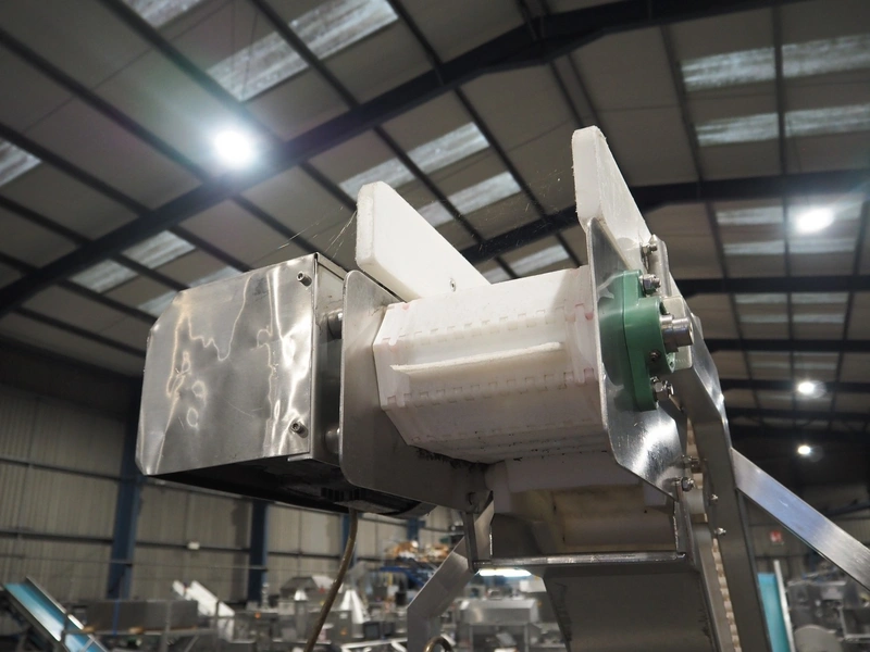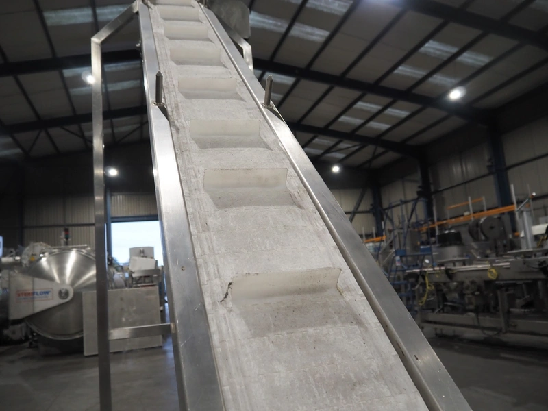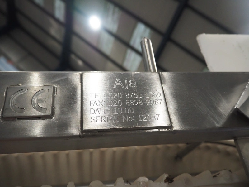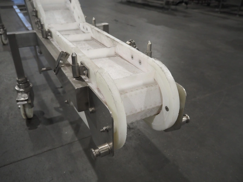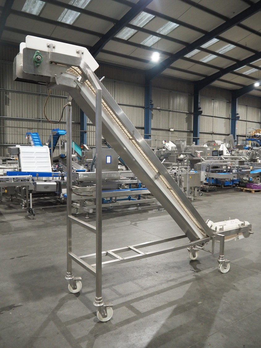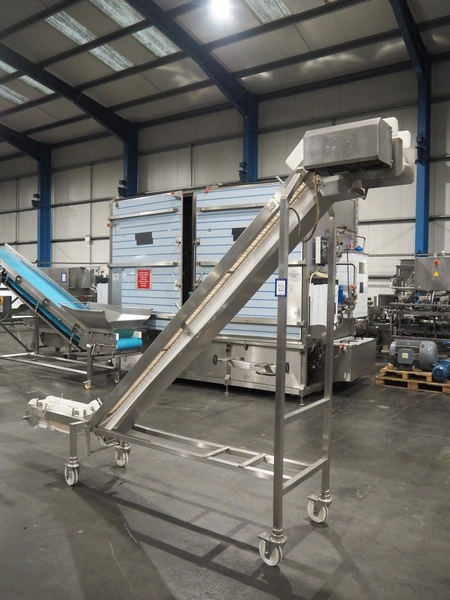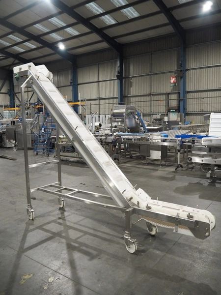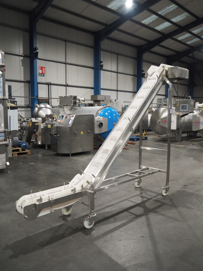 Aja mobile elevating belt, serial number: 12647, year of construction: 10.00, plastic belt with dividers, belt width: 220 mm, dividers height: 35 mm, distance between dividers: 250 mm, elevating height: 2350 mm, total dimensions: 3300 mm x 800 mm x 2520 mm.