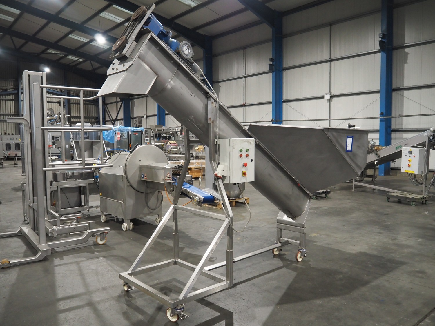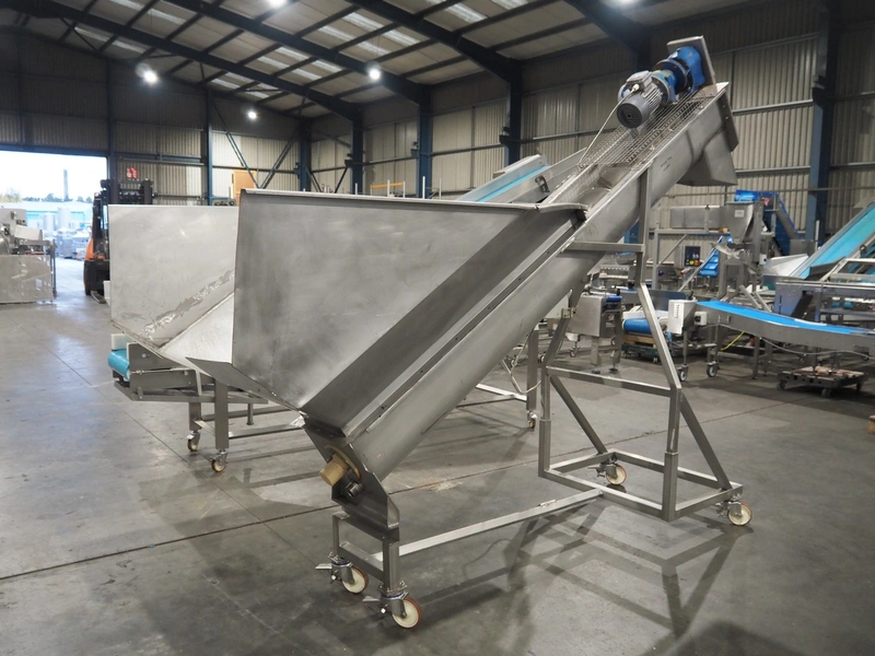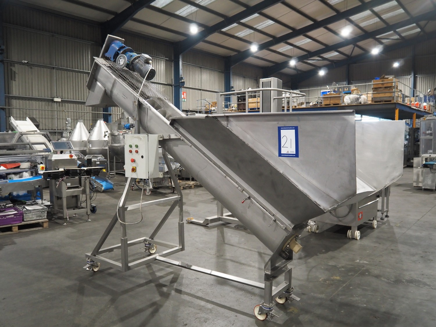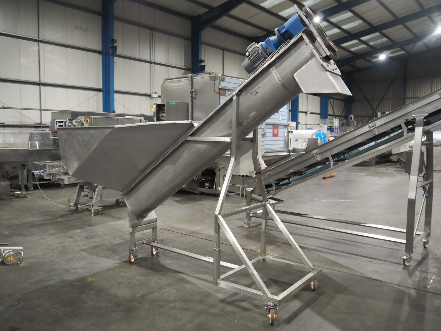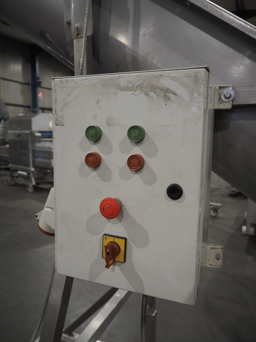 Mobile s/s elevating screw with infeed bunker, bunker clearance: 1240 mm x 1150 mm, diameter screw: 300 mm, tier: 200 mm, outfeed height: 1890 mm, total dimensions: 3350 mm x 1380 mm x 2660 mm.