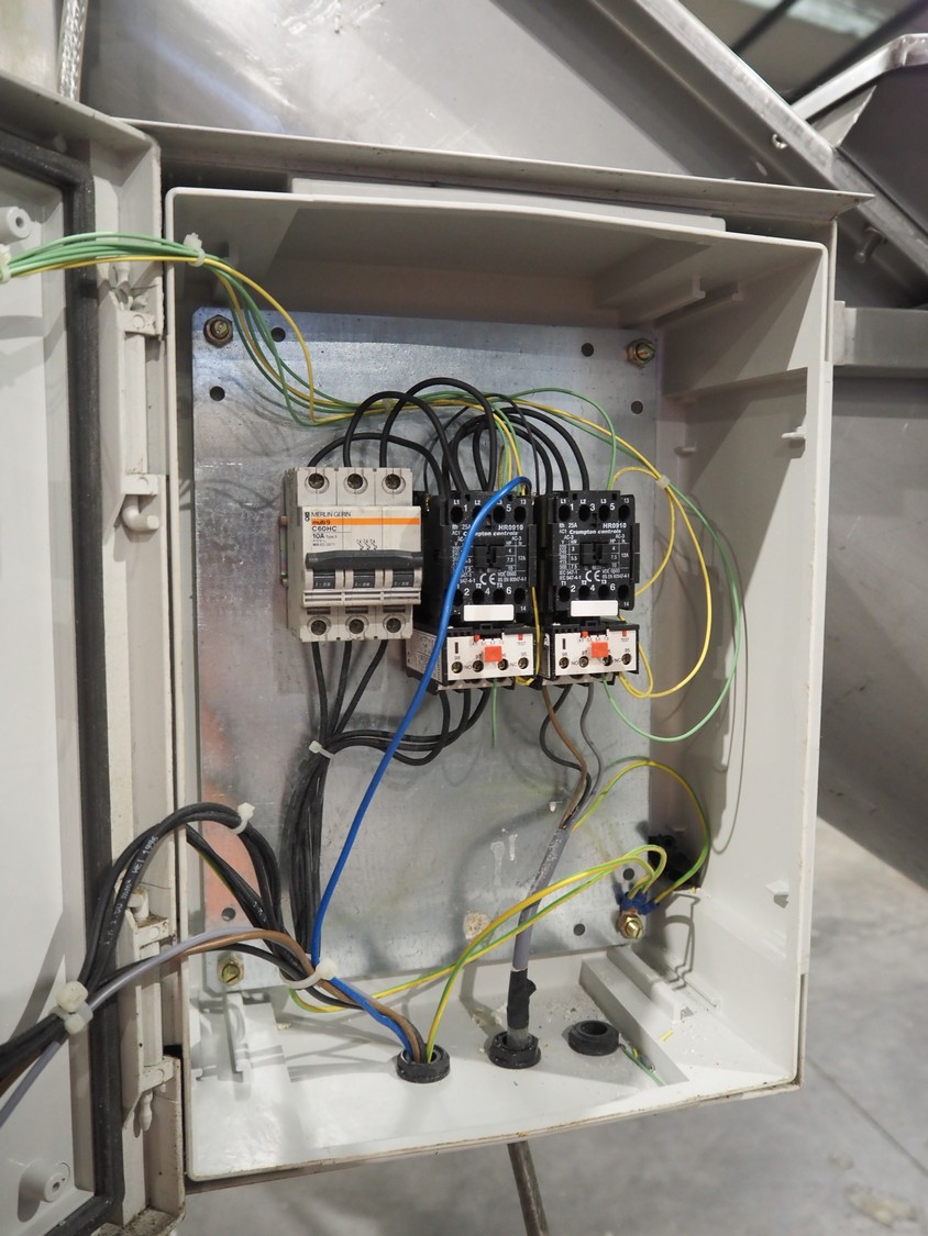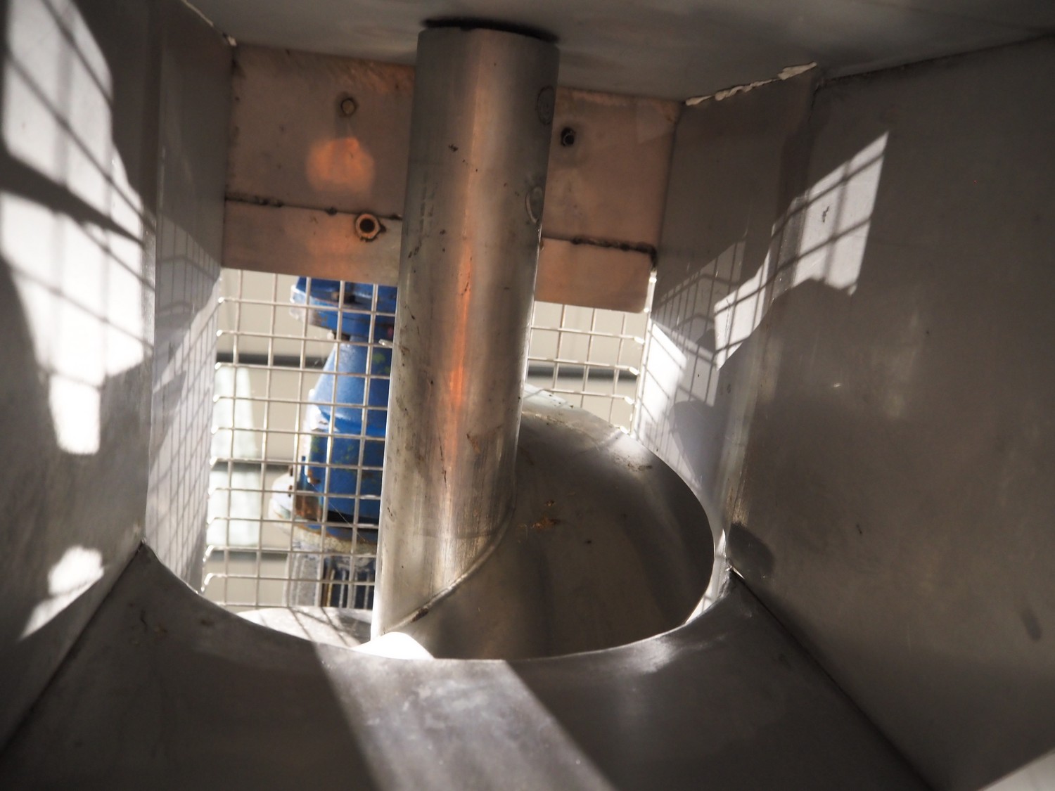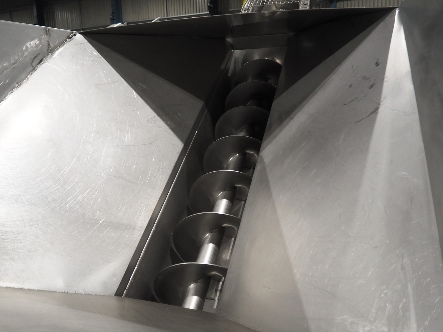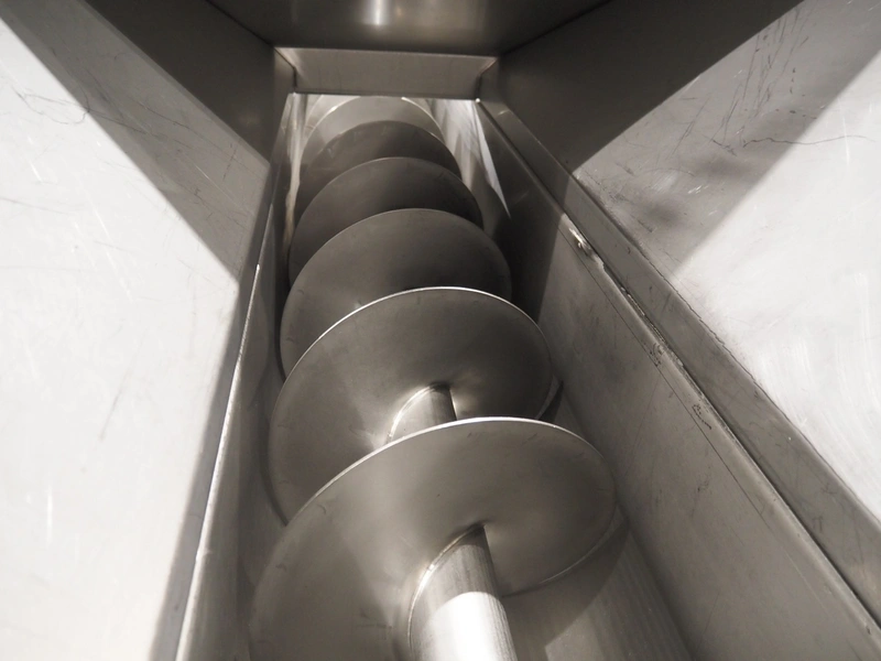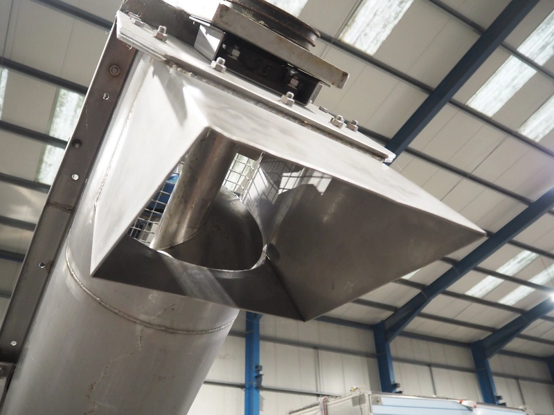 Mobile s/s elevating screw with infeed bunker, bunker clearance: 1240 mm x 1150 mm, diameter screw: 300 mm, tier: 200 mm, outfeed height: 1890 mm, total dimensions: 3350 mm x 1380 mm x 2660 mm.