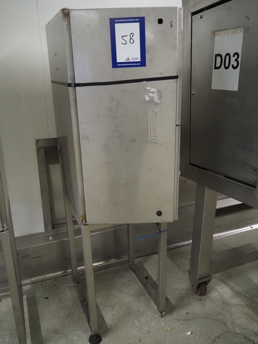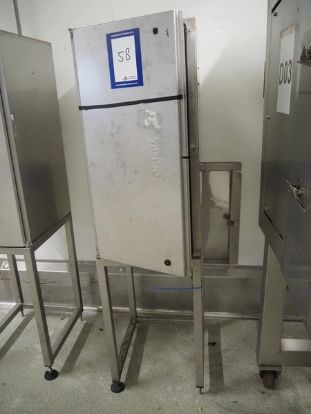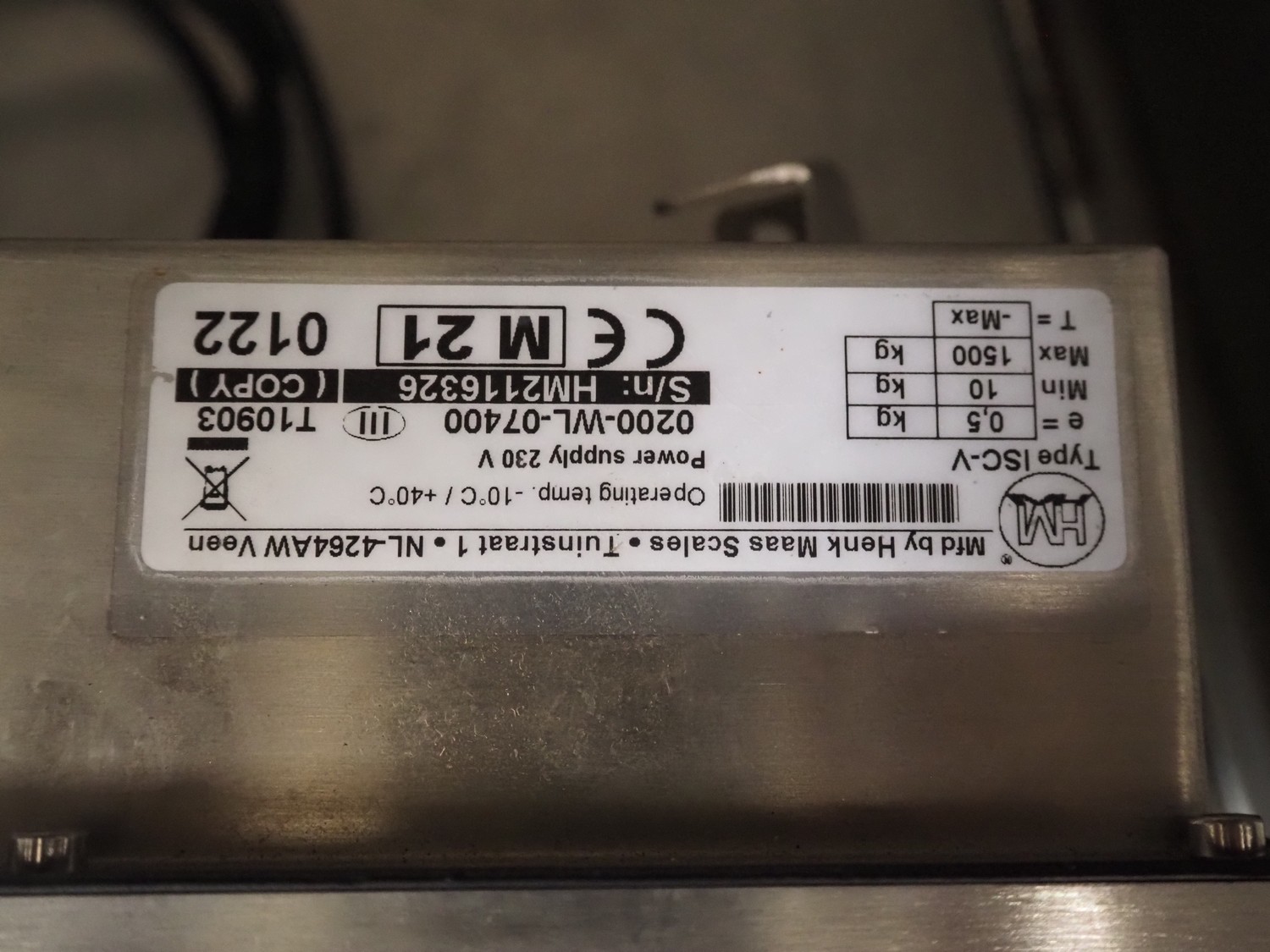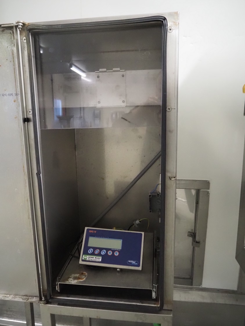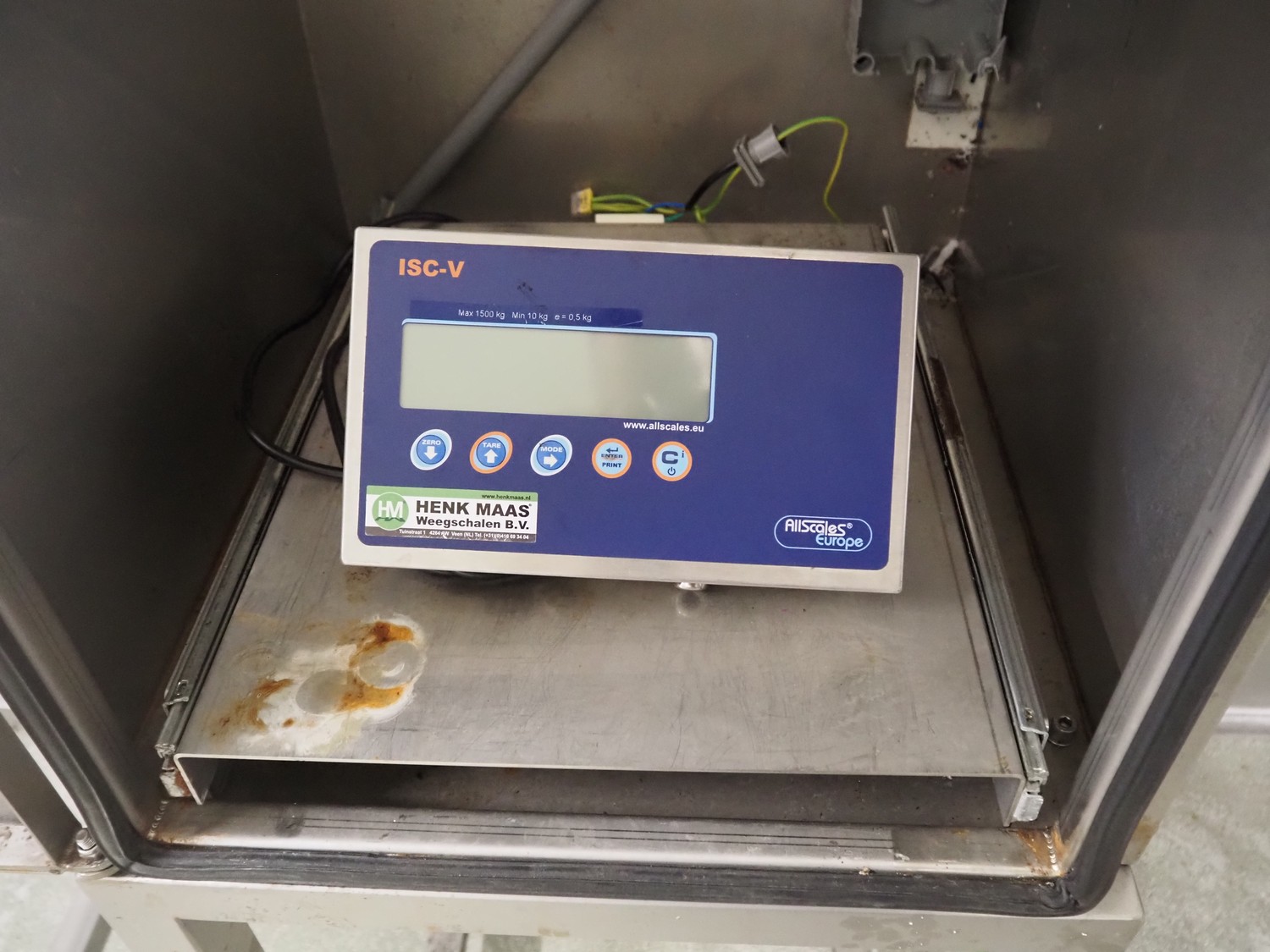 Trabo s/s computer cabinet with Henk Maas Scales indicator, type: ISC-V, maximum: 1500 kg, minimum: 10 kg, e - 0.5 kg, dimensions: 500 mm x 530 mm x 1820 mm.