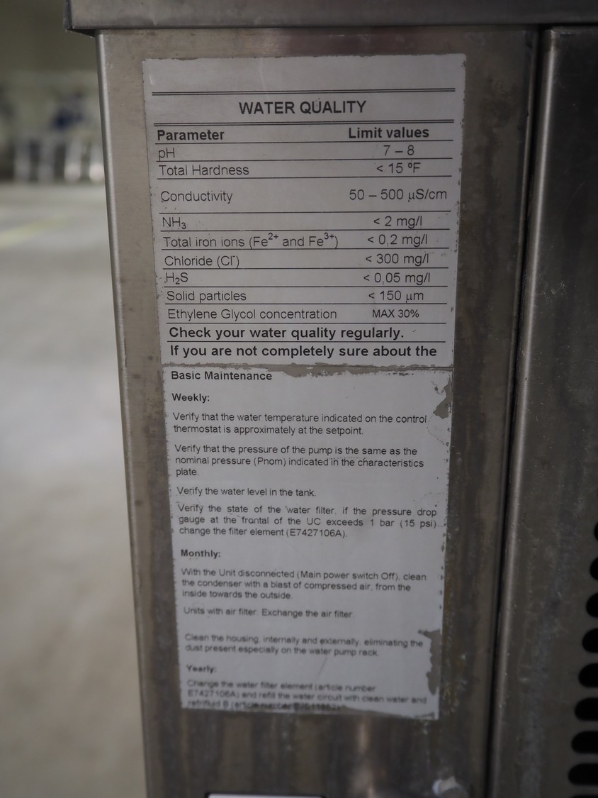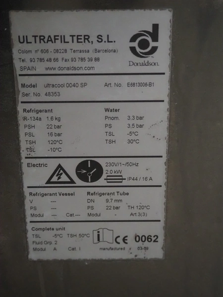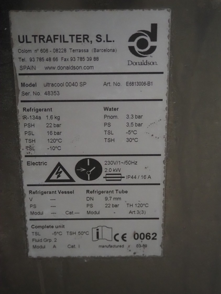 Donaldson / ULTRAFILTER S.L. water chiller, model: ultracool 0040 SP, serial number: 48353, refrigerant: R-134a / 1.6 kg, dimensions: 620 mm x 750 mm x 1170 mm.