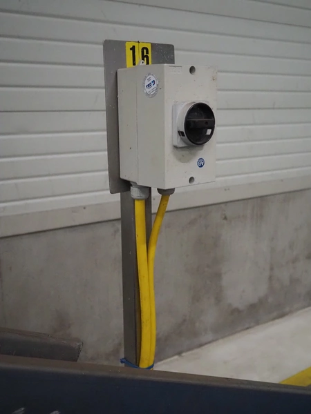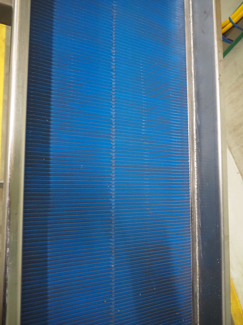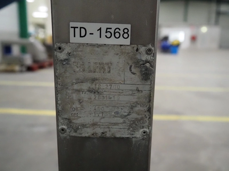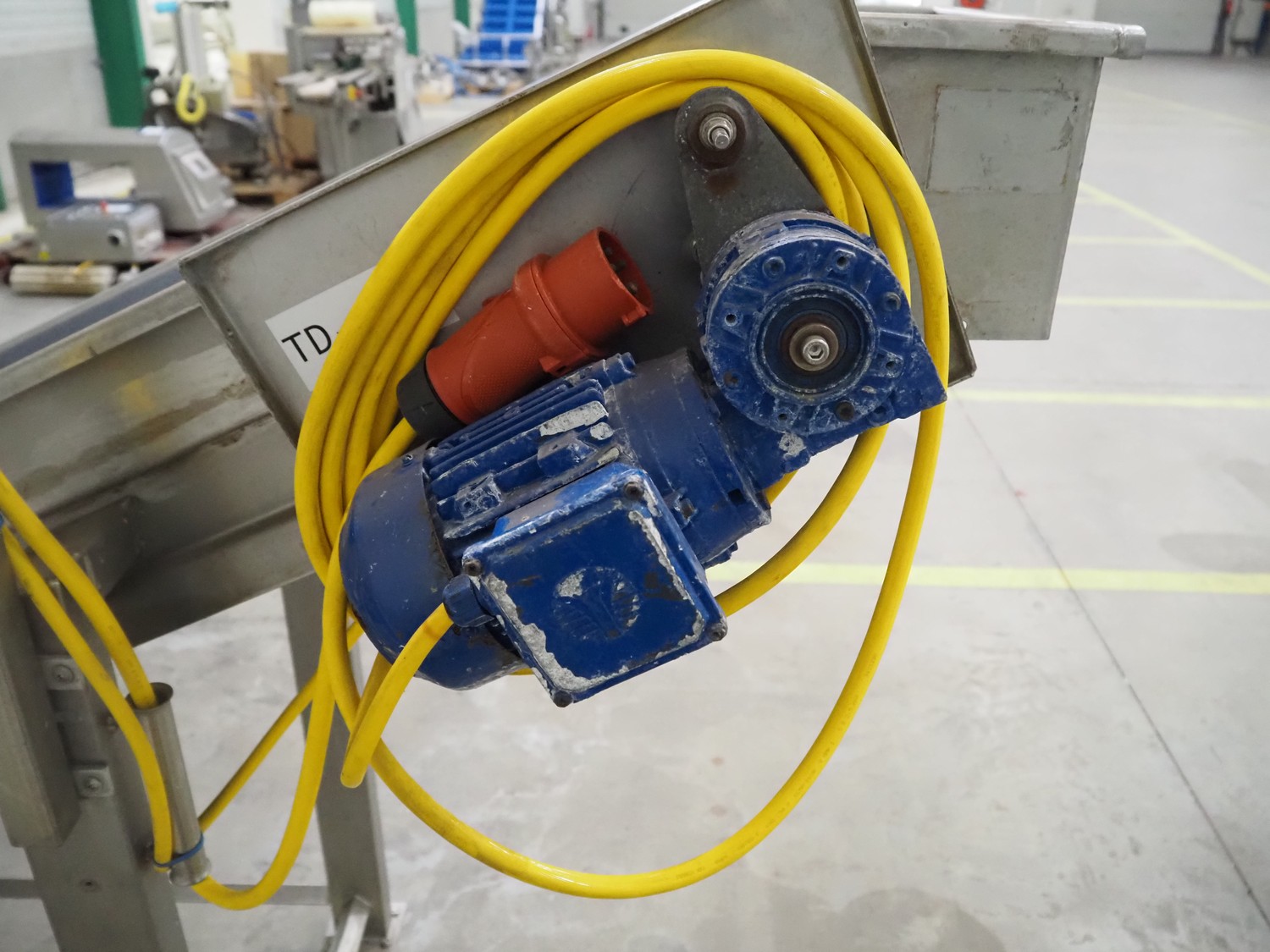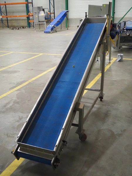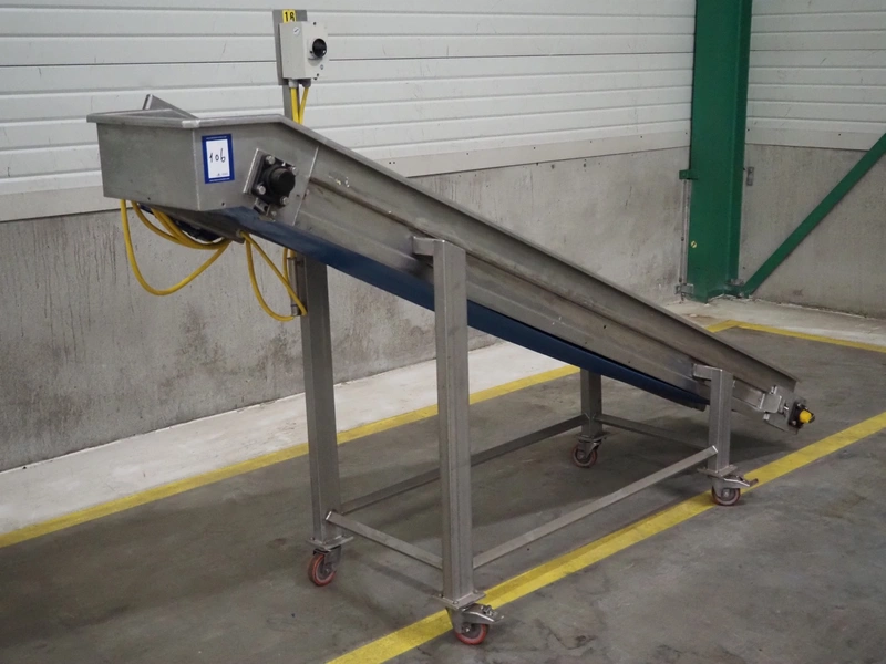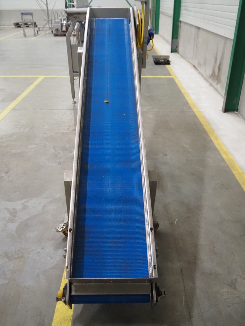 Eillert mobile elevating belt, type: TR 2700, machine number: 2001-19, s/s frame, plastic belt, belt width: 400 mm, elevating height: 1350 mm, total dimensions: 2680 mm x 850 mm x 1680 mm.