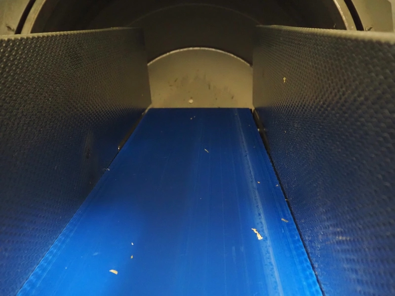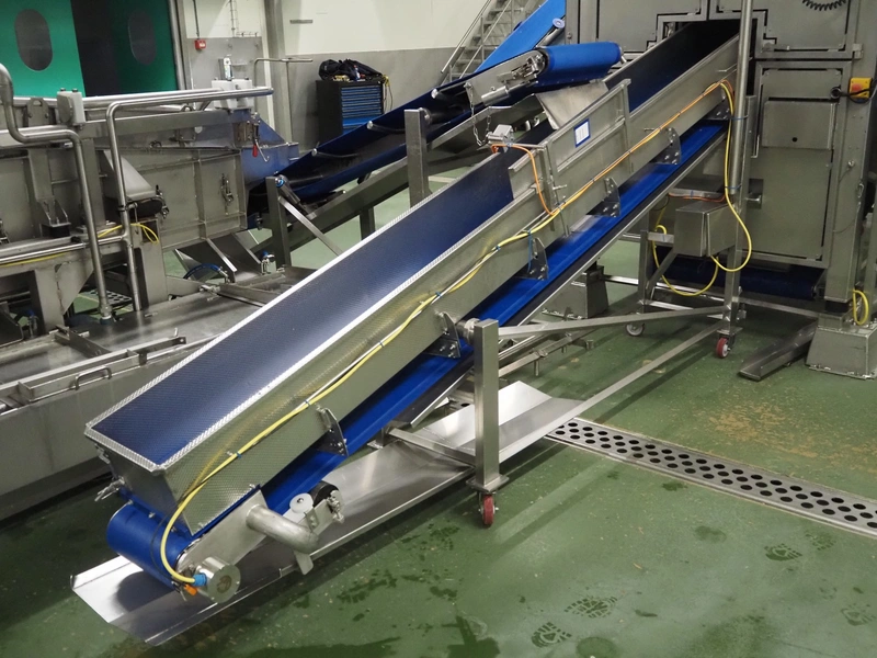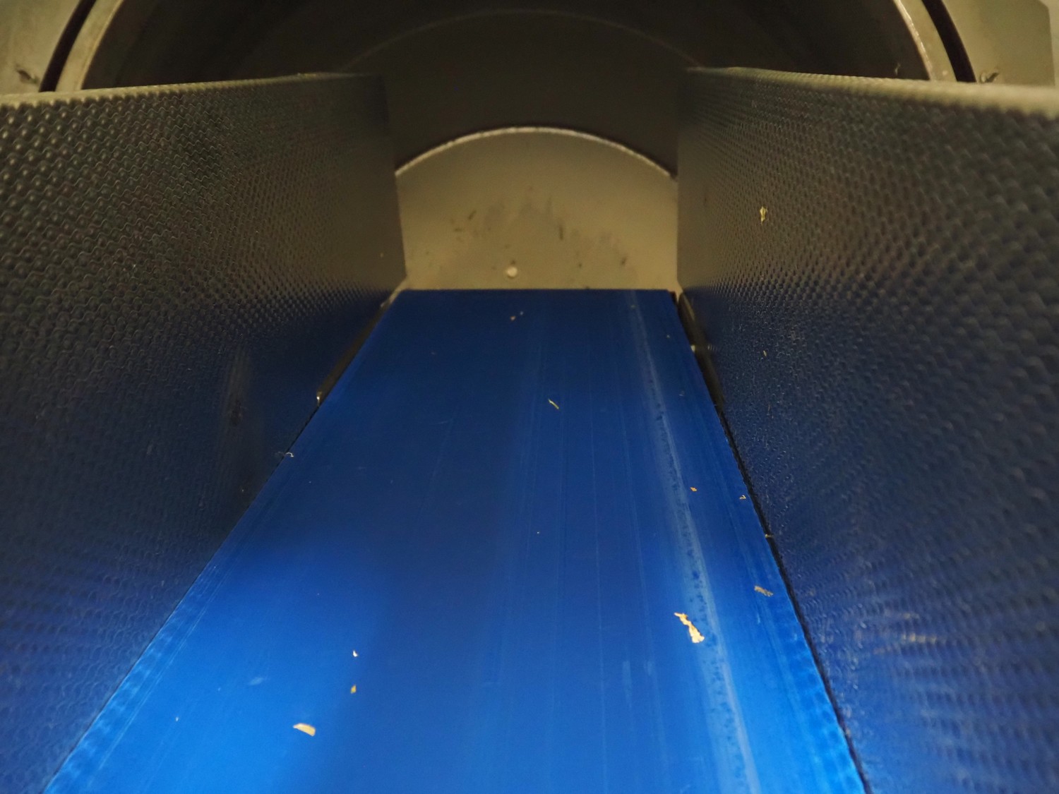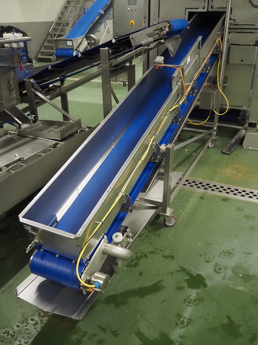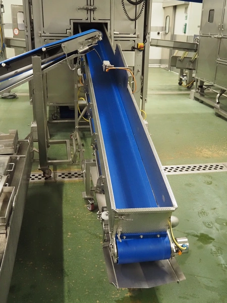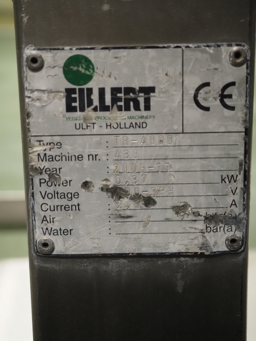 Eillert retractable elevating buffer belt, type: TR-4000, machine number: 438, year of construction: 2006, 230 V, 3 Ph, 2.6 A, 0.37 kW, s/s frame, plastic belt, belt width: 300 mm, elevating height: 1600 mm, total dimensions: 4000 mm x 600 mm x 1900 mm.
