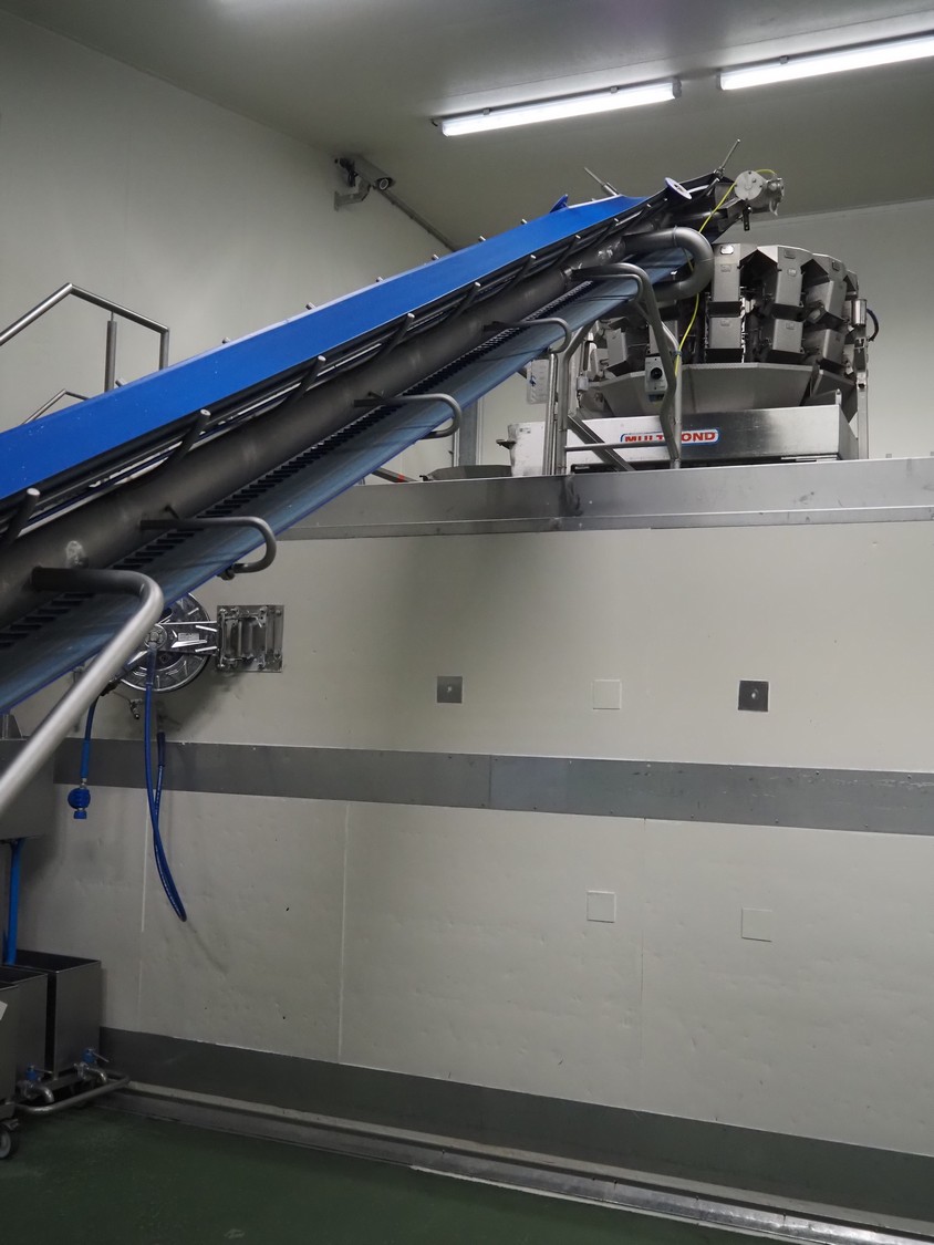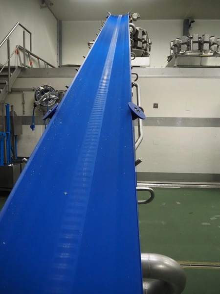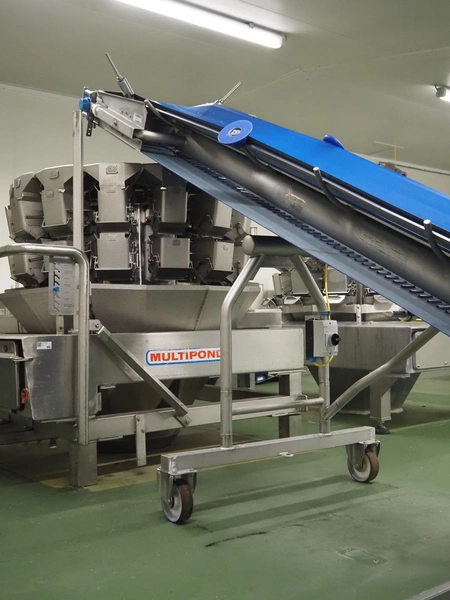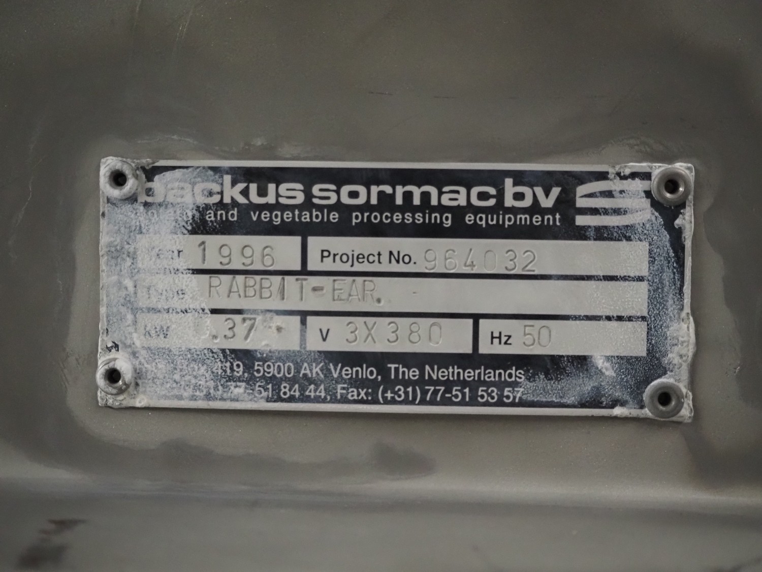 Backus Sormac BV mobile V-elevating belt, type: RABBIT-EAR, year of construction: 1996, 3 x 380 V, 50 Hz, 0.37 kW, s/s frame, plastic belt, belt width: 565 mm, elevating from 600 mm to 4800 mm, total dimensions: 8000 mm x 1200 mm x 4800 mm.