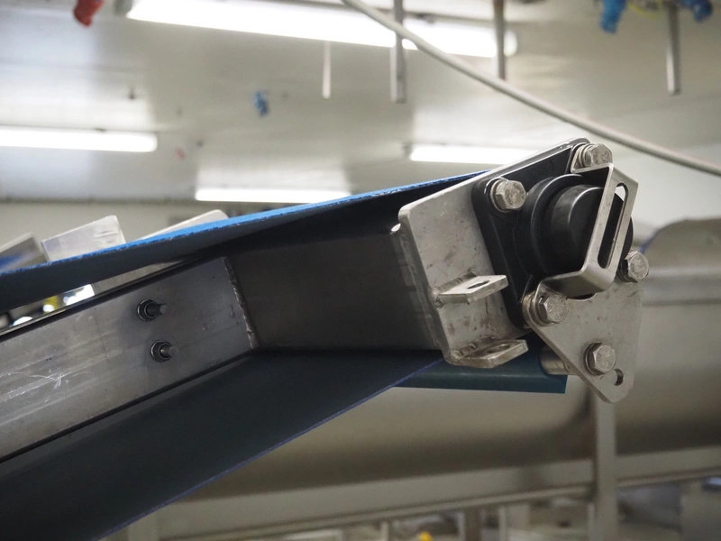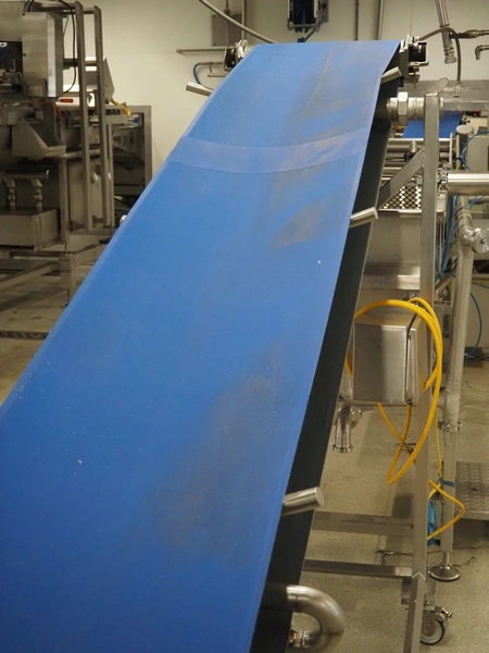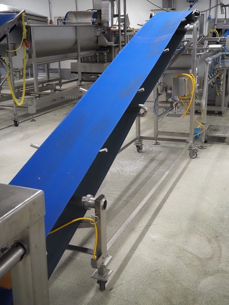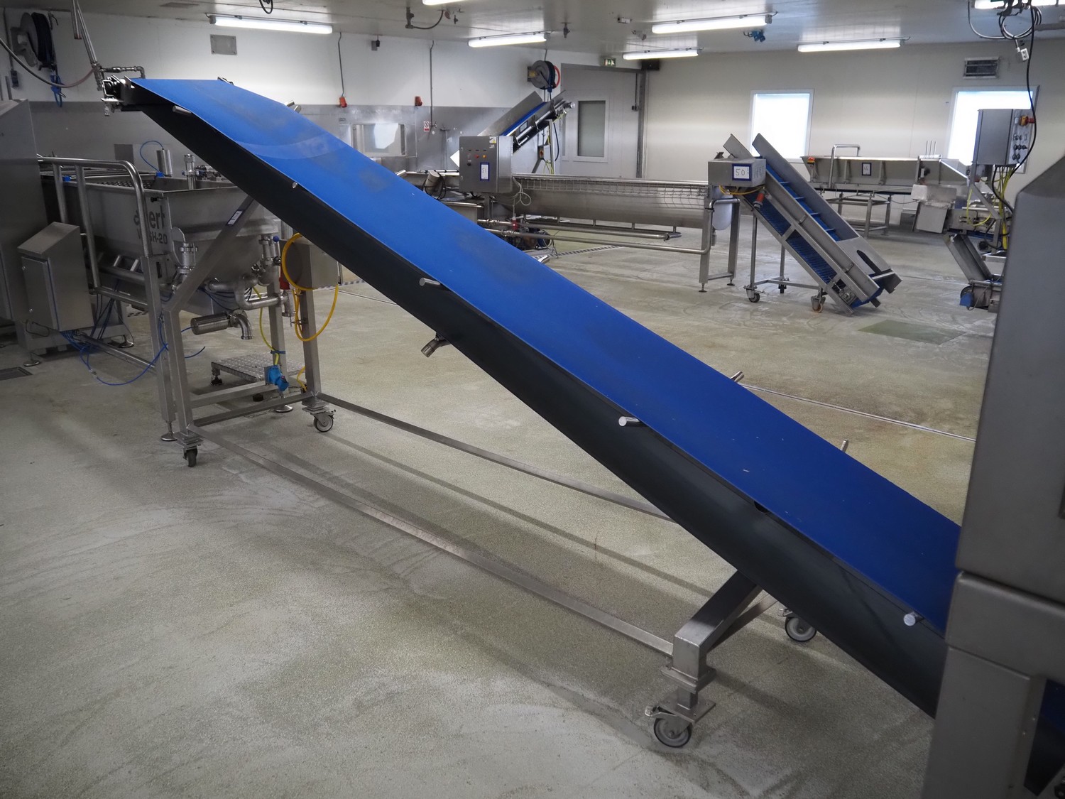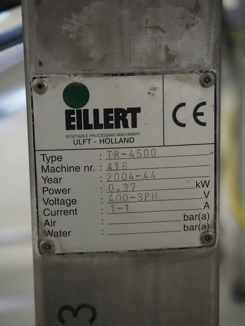 Eillert mobile V-elevating belt, type: TR-4500, machine number: 416, year of construction: 2004, 400 V, 3 Ph, 1 A, 0.37 kW, s/s frame, plastic belt, belt width: 460 mm, elevating height: 1800 mm, total dimensions: 4800 mm x 800 mm x 1800 mm.