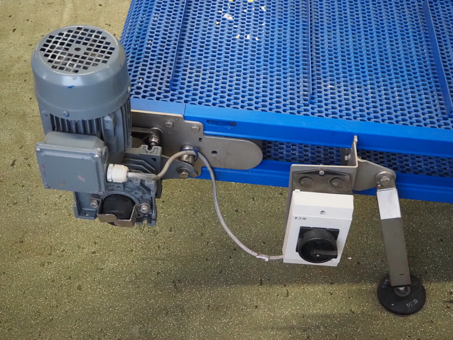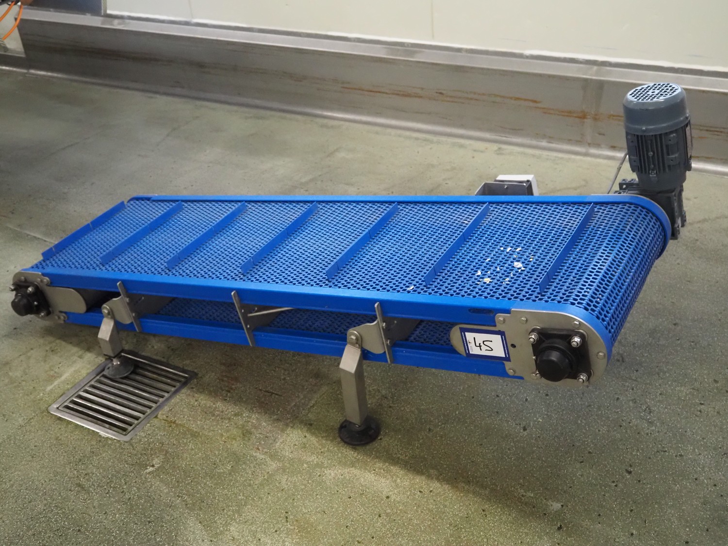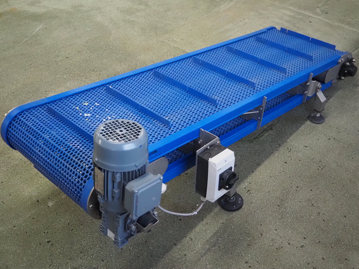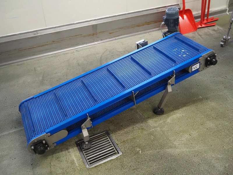 Elevating belt with dividers, s/s frame, plastic mesh belt, belt width: 460 mm, divider height: 25 mm, distance between dividers: 250 mm, elevating height: 520 mm, total dimensions: 1800 mm x 800 mm x 800 mm.