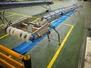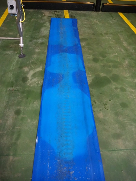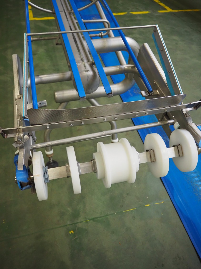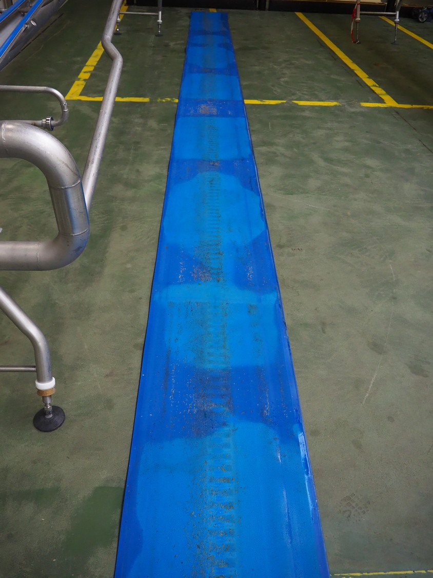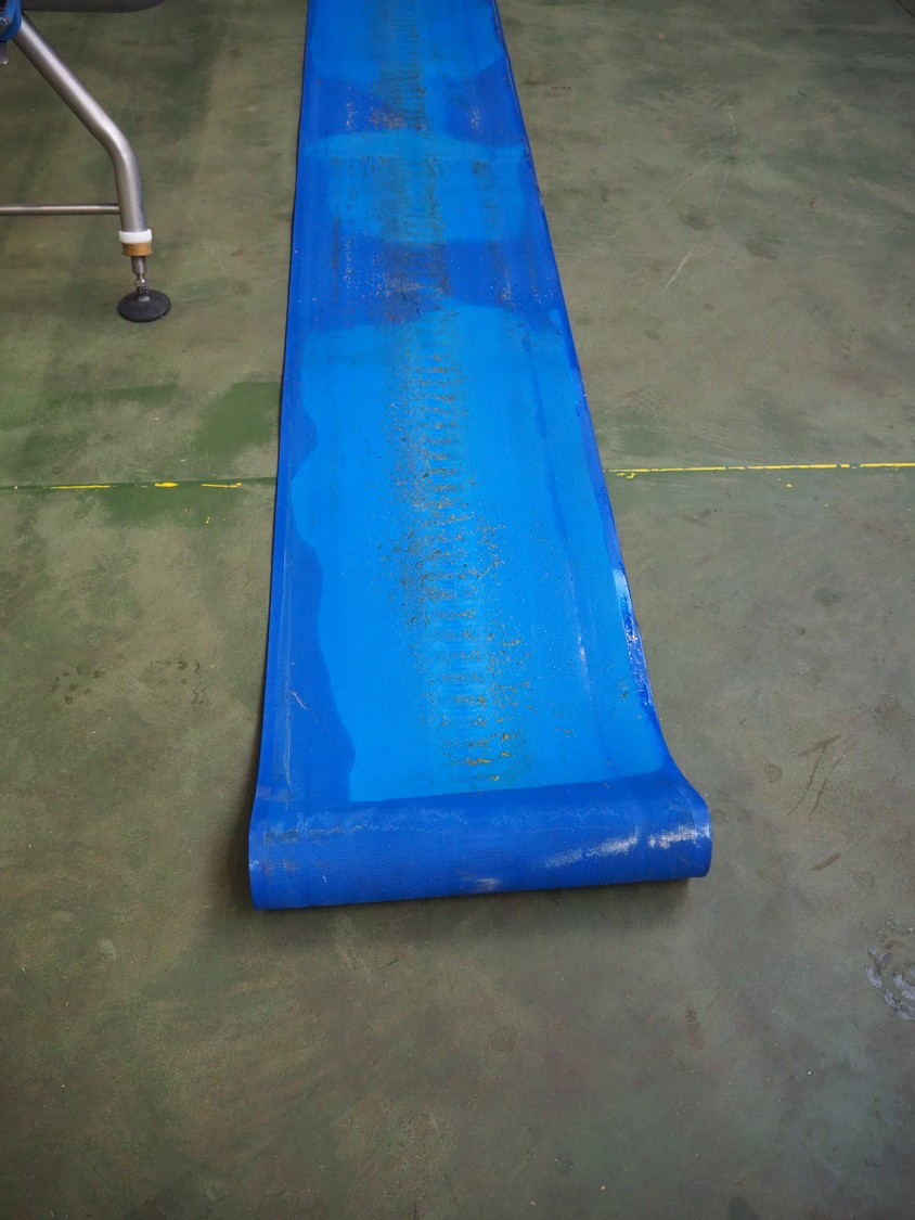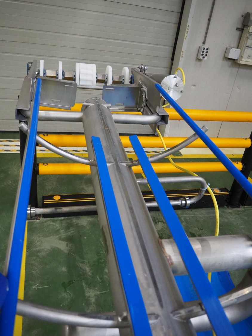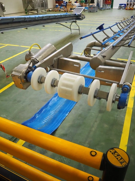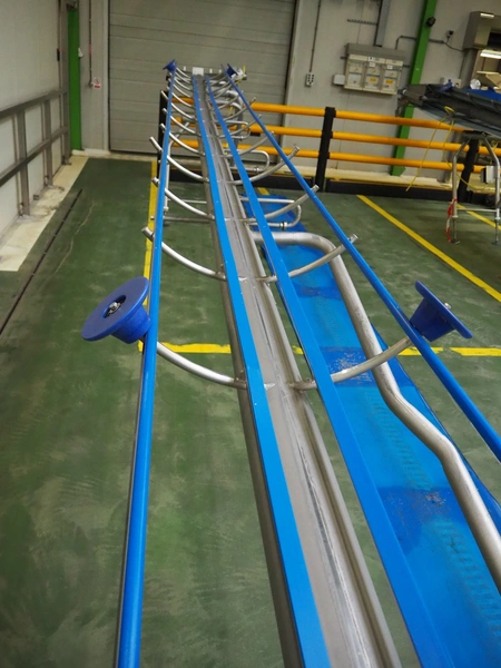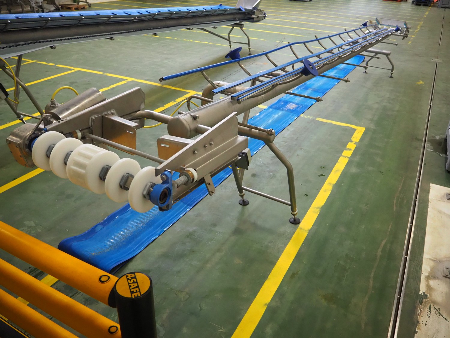 V-elevating belt, s/s frame, plastic belt with grippers, belt width: 600 mm, total dimensions: 9000 mm x 1000 mm x 1700 mm.