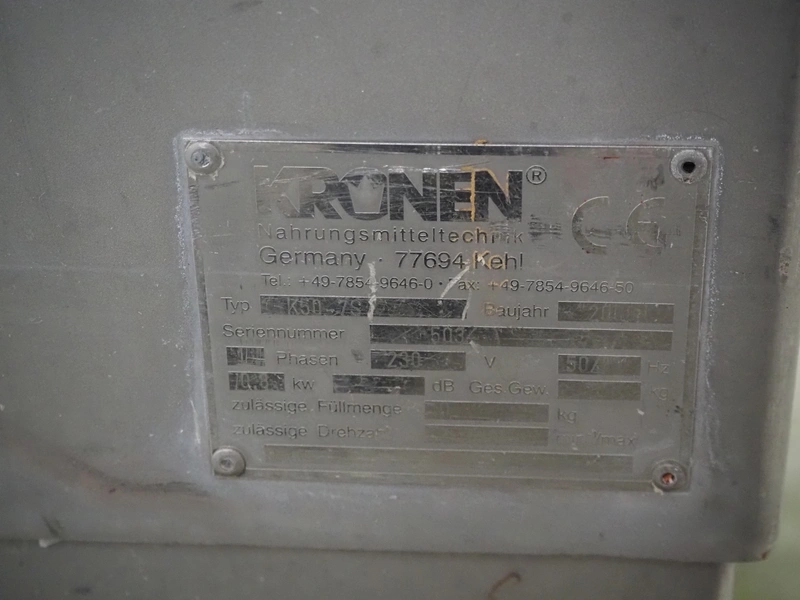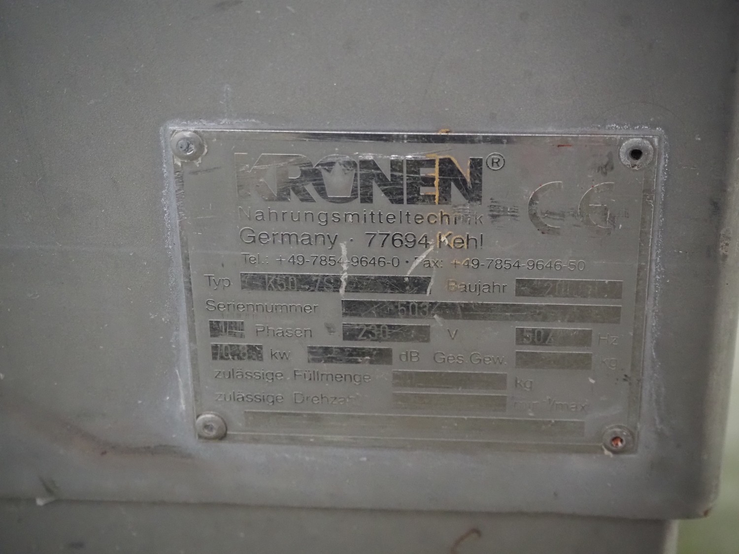 Kronen vegetable centrifuge, type: K50-7S, serial number: 5034, year of construction: 2008, 230 V, 1 Ph, 50/60 Hz, 0.8 kW, dimensions: 600 mm x 900 mm x 950 mm.