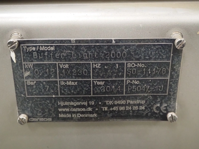 Carsoe buffer belt, type: Buffer Light 2000, serial number: SO-11178, year of construction: 2014, 230 V, 1 Ph, 0.12 kW, 7 bar, plastic belt, belt width: 340 mm, total dimensions: 2030 mm x 550 mm x 1720 mm.