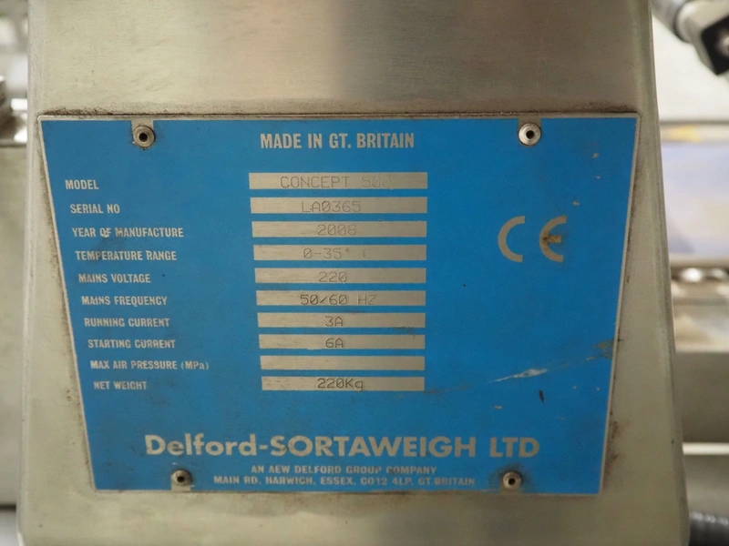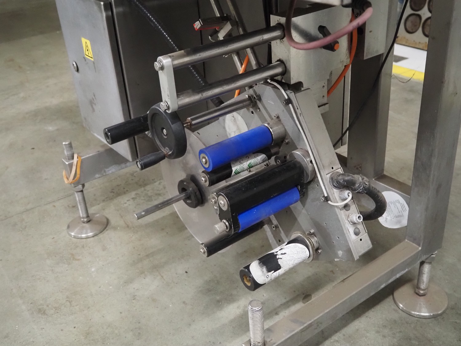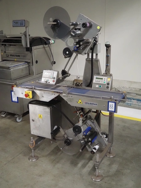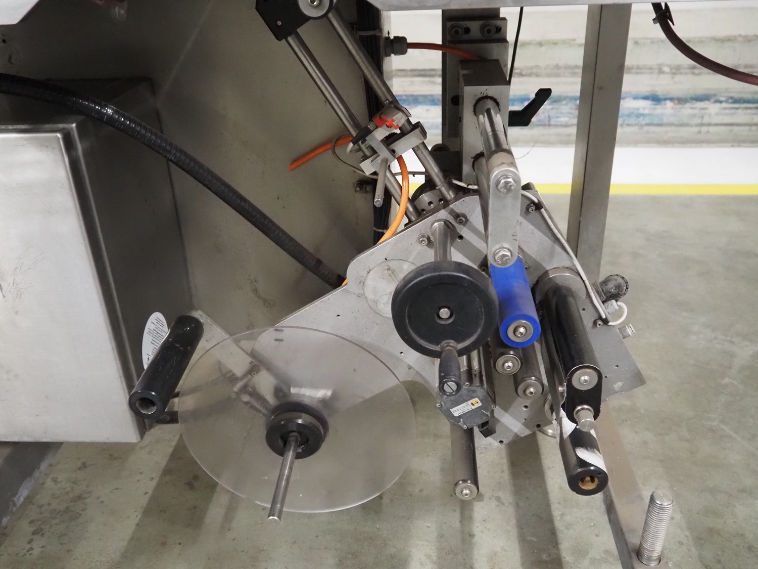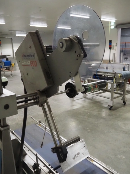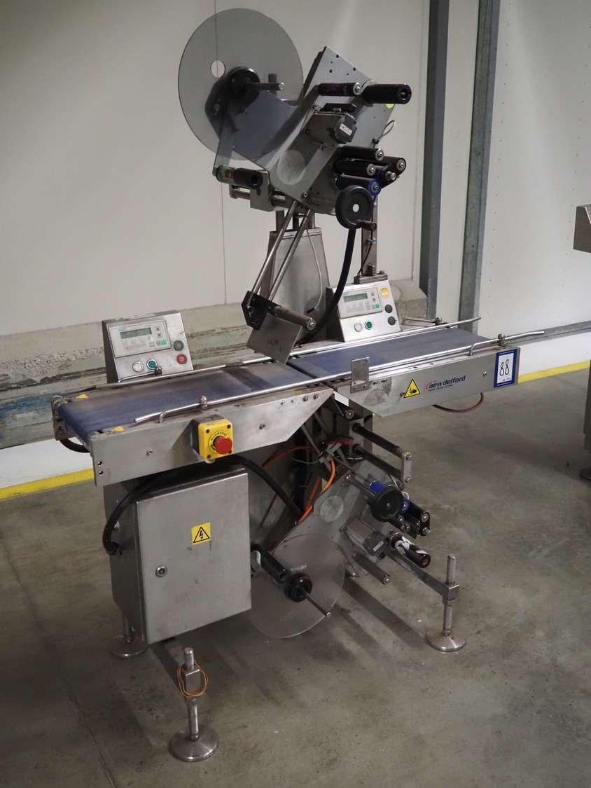 AEW Delford top and bottom labeller, model: Concept 500, serial number: LA0365, year of construction: 2008, 220 V, 50/60 Hz, 3/6 A, weight: 220 kg, plastic belts, belt width: (2x) 200 mm, total dimensions: 1320 mm x 700 mm x 1740 mm.