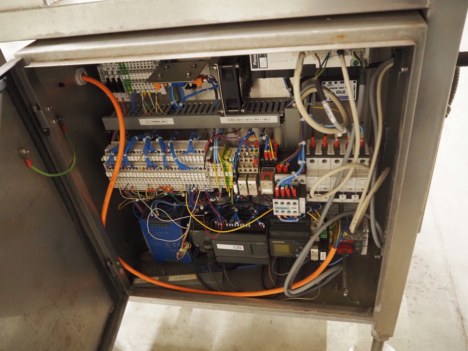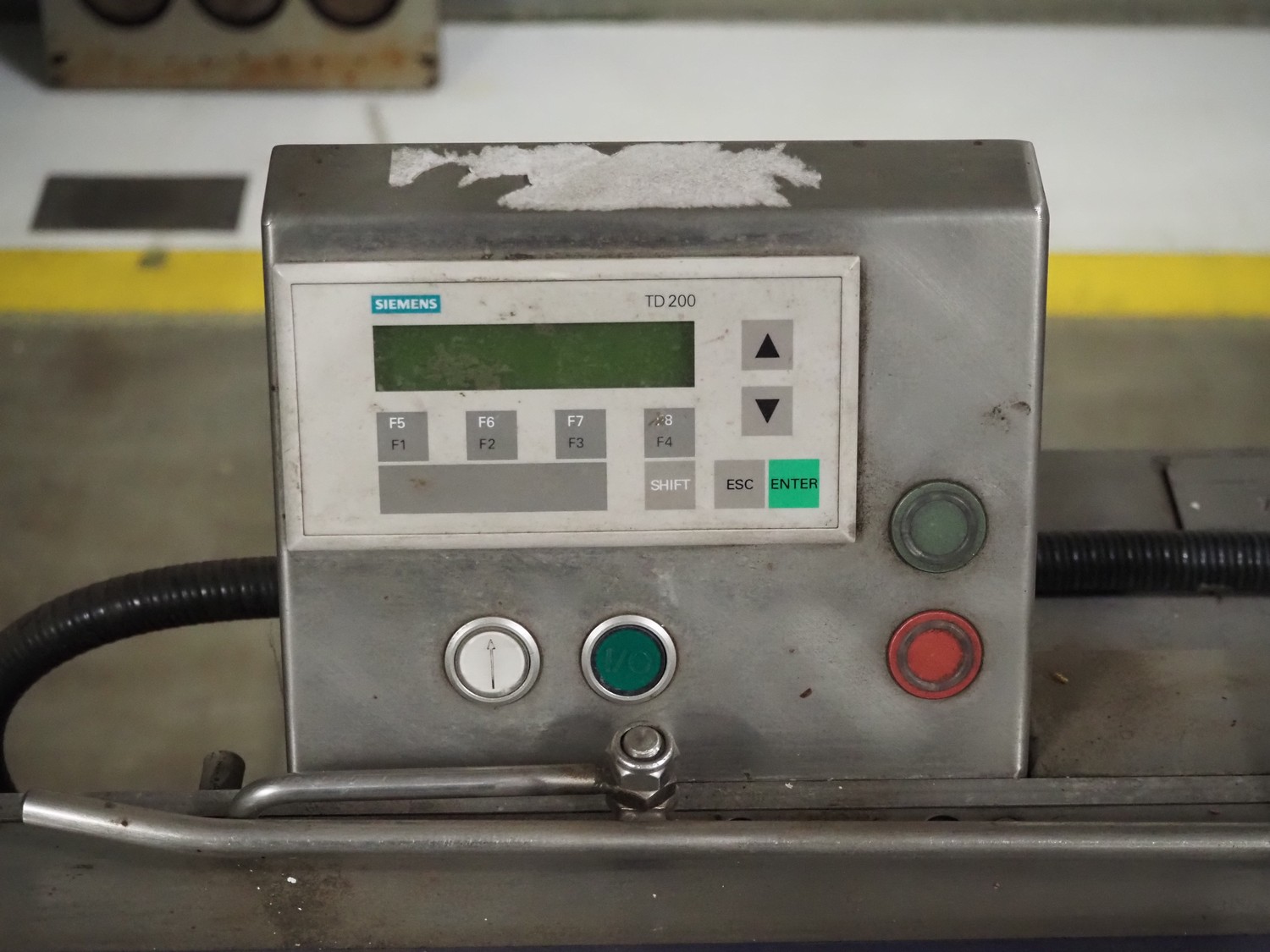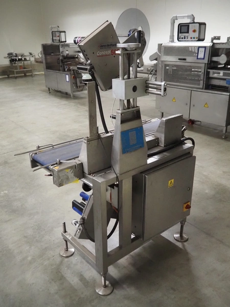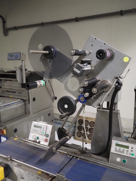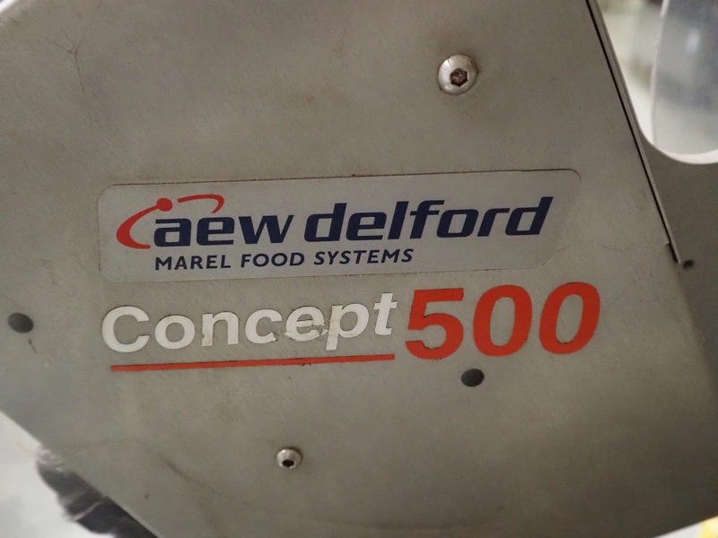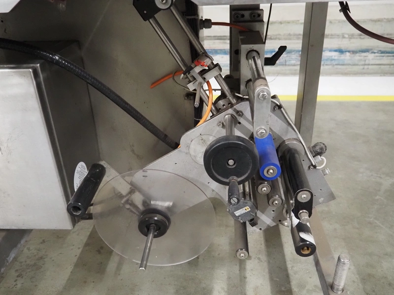 AEW Delford top and bottom labeller, model: Concept 500, serial number: LA0365, year of construction: 2008, 220 V, 50/60 Hz, 3/6 A, weight: 220 kg, plastic belts, belt width: (2x) 200 mm, total dimensions: 1320 mm x 700 mm x 1740 mm.