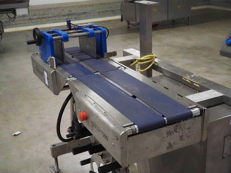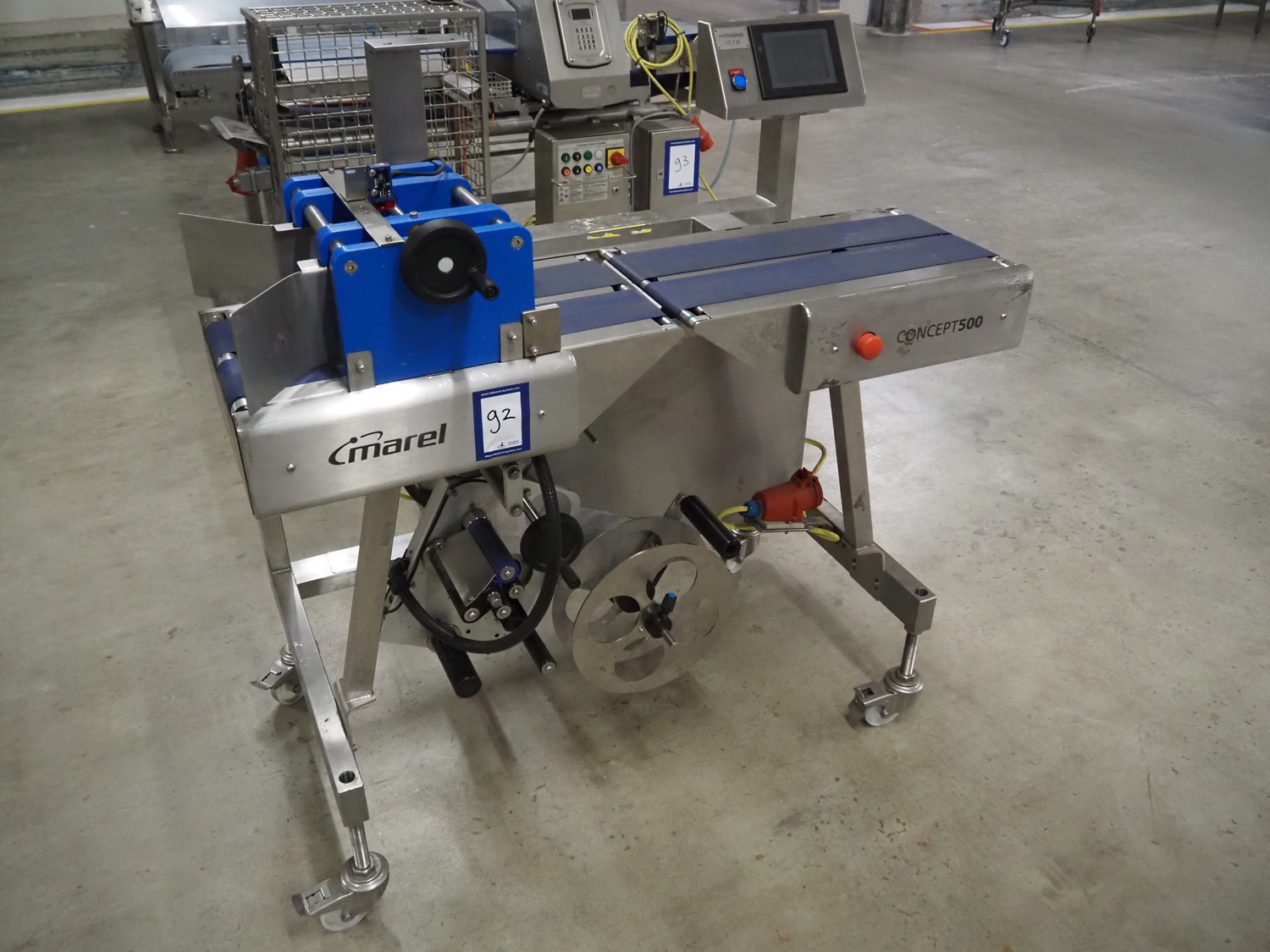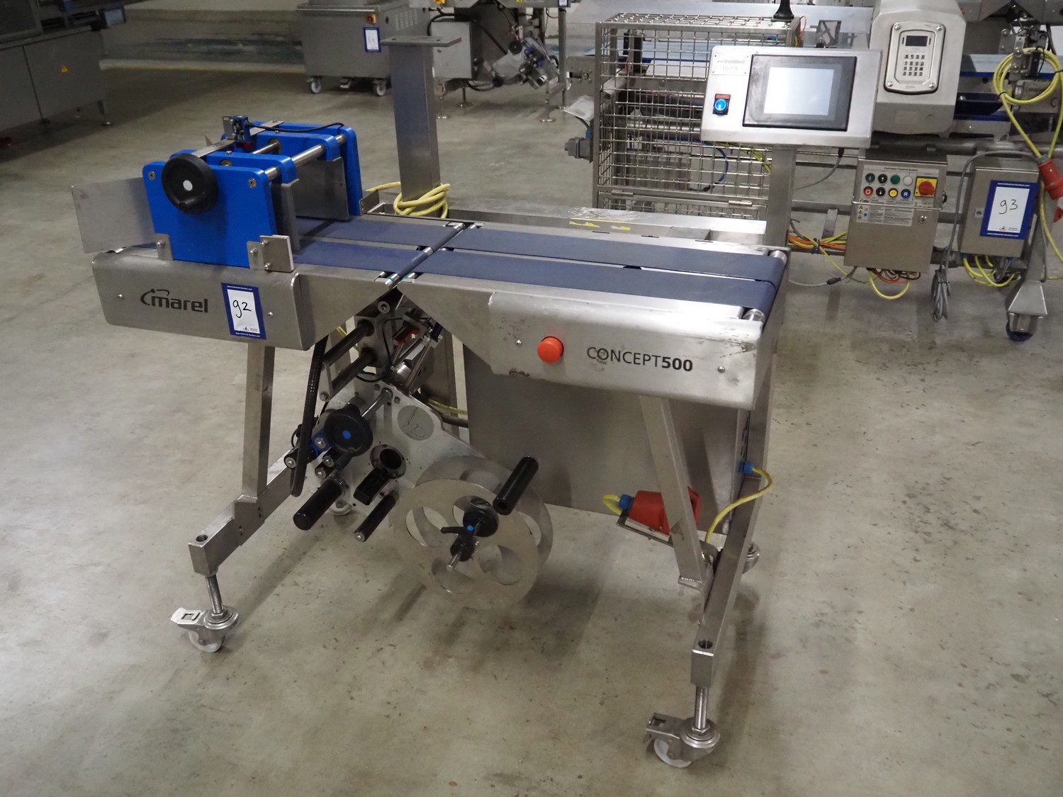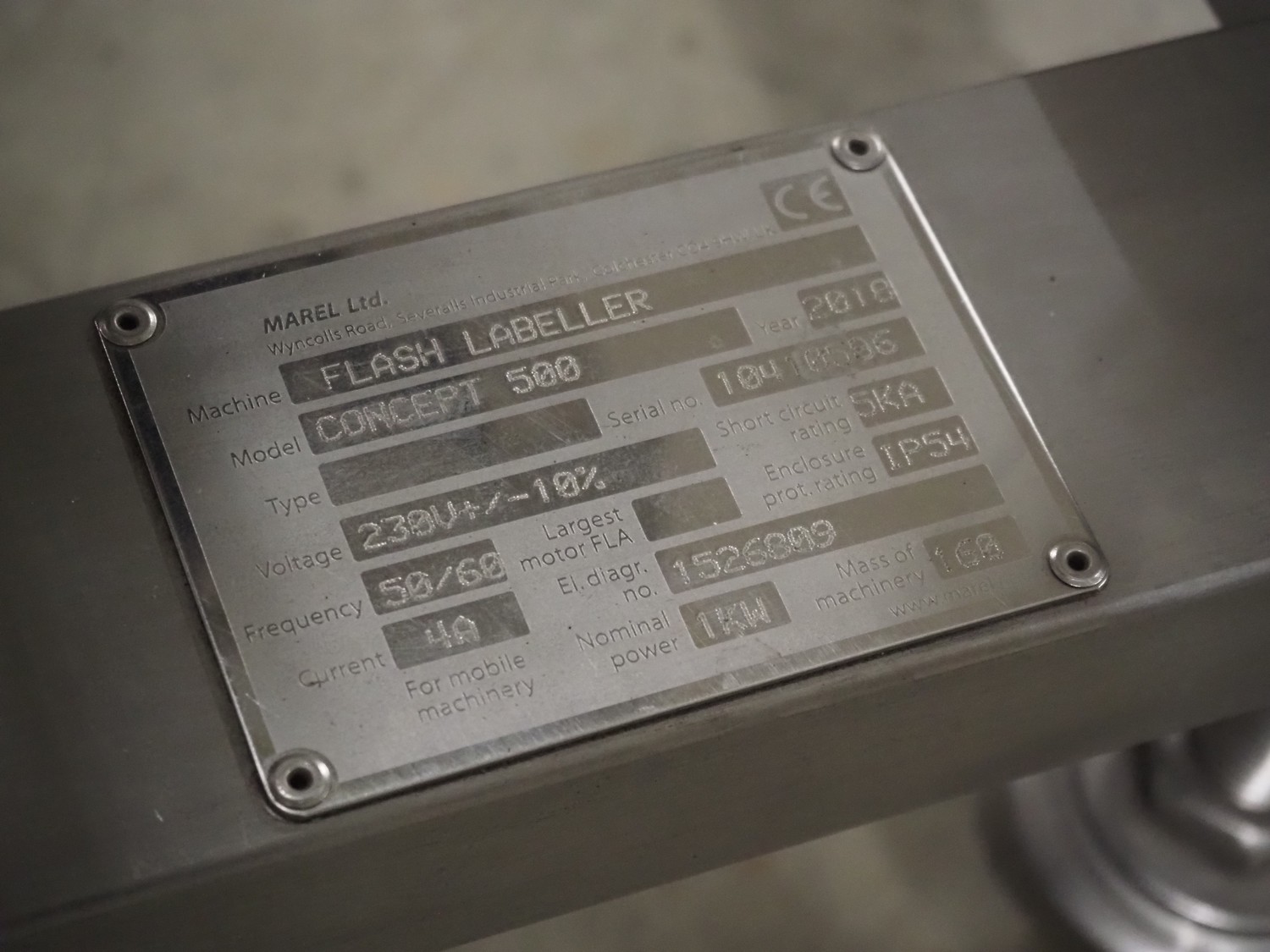 Marel bottom labeller, model: Concept 500, serial number: 10410586, year of construction: 2018, 230 V, 50/60 Hz, 4 A, plastic belts, belt width: (4x) 110 mm, total dimensions: 1300 mm x 780 mm x 1260 mm.