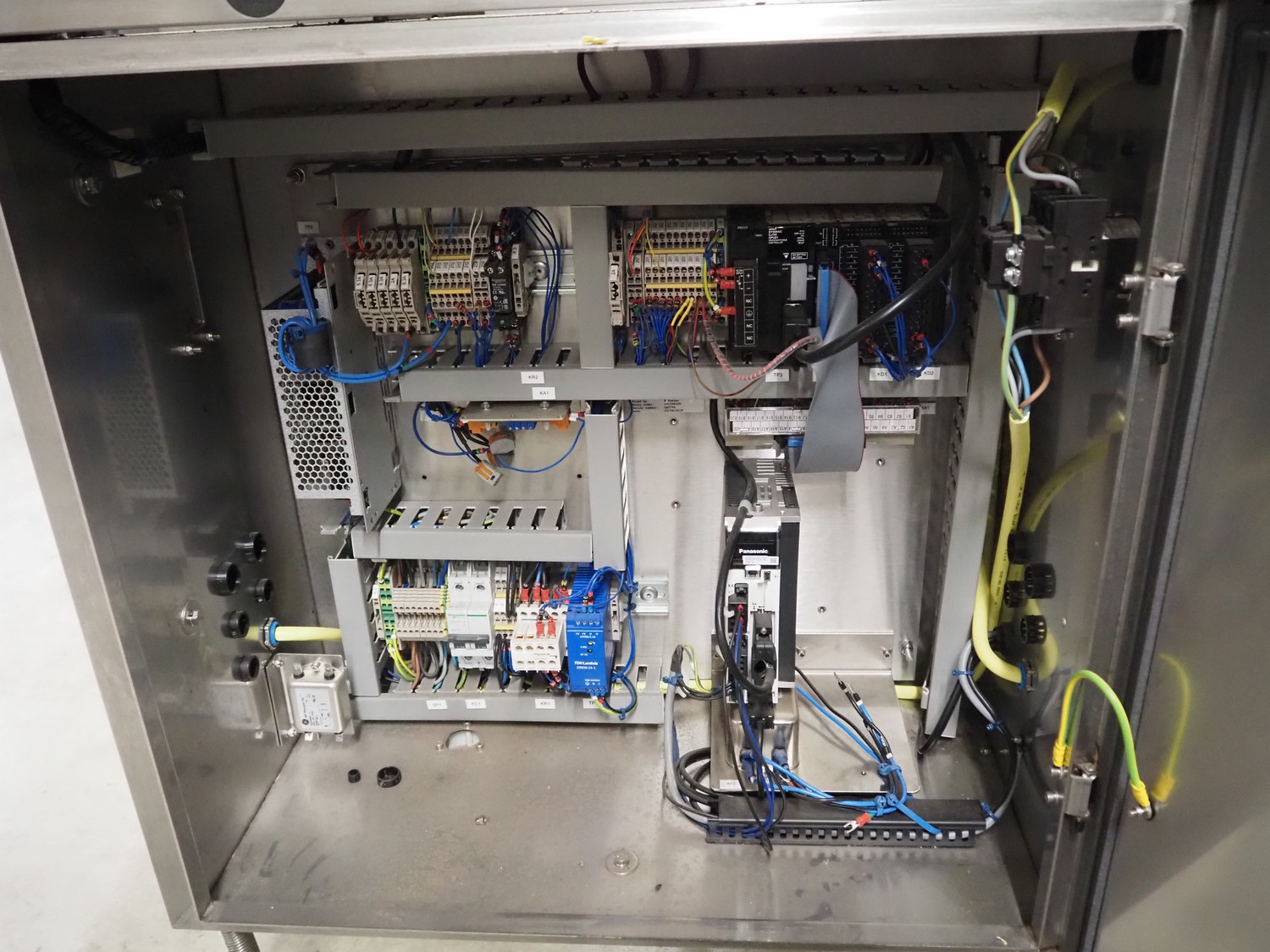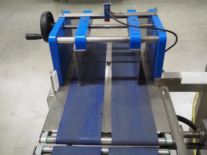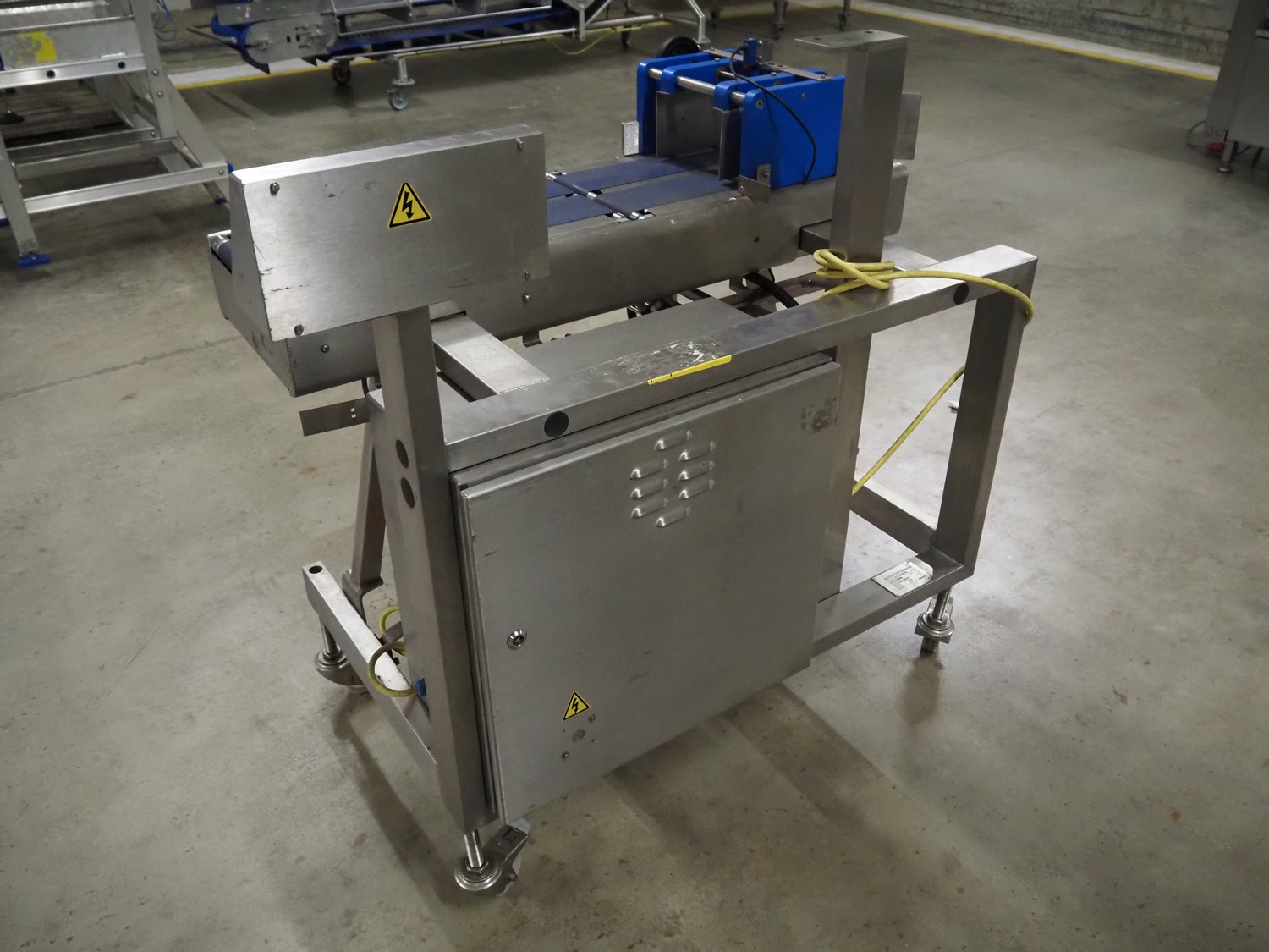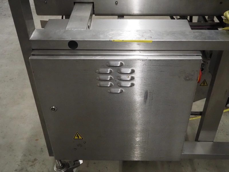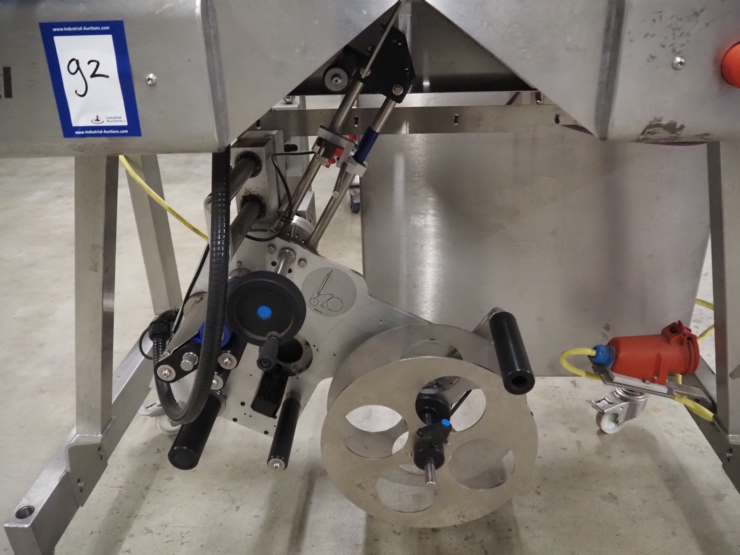 Marel bottom labeller, model: Concept 500, serial number: 10410586, year of construction: 2018, 230 V, 50/60 Hz, 4 A, plastic belts, belt width: (4x) 110 mm, total dimensions: 1300 mm x 780 mm x 1260 mm.
