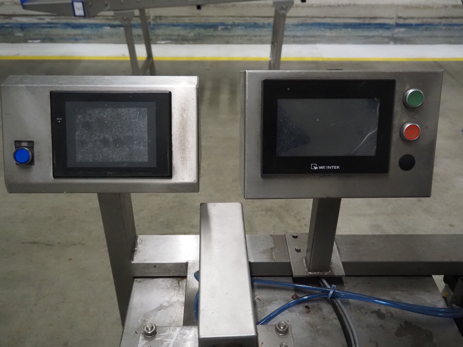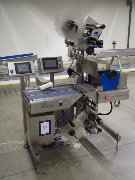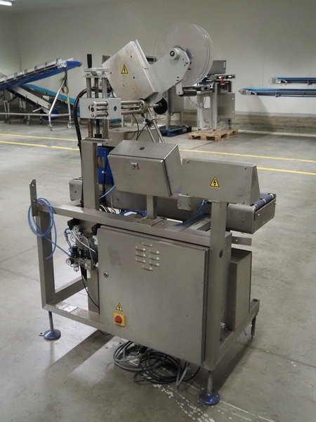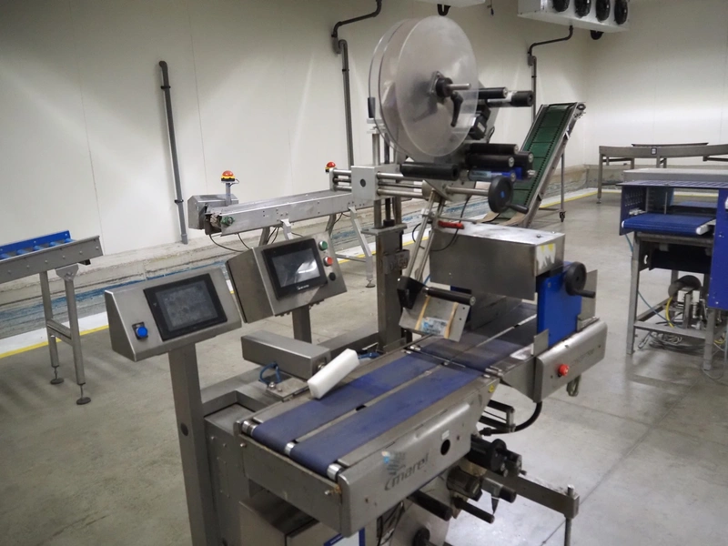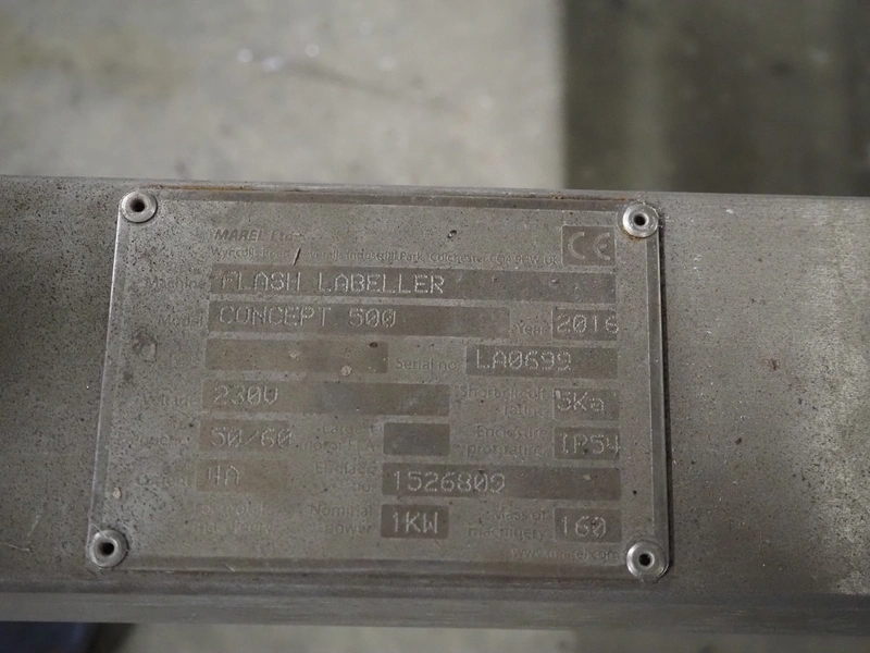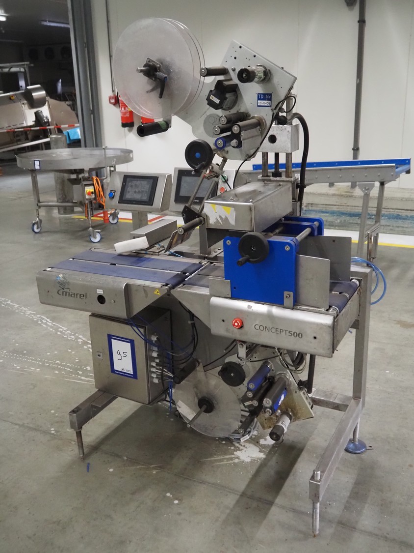 Marel top and bottom labeller with rejector, model: Concept 500, serial number: LA0699, year of construction: 2016, 230 V, 50/60 Hz, 4 A, plastic belts, belt width: (4x) 110 mm, total dimensions: 1300 mm x 800 mm x 1810 mm.