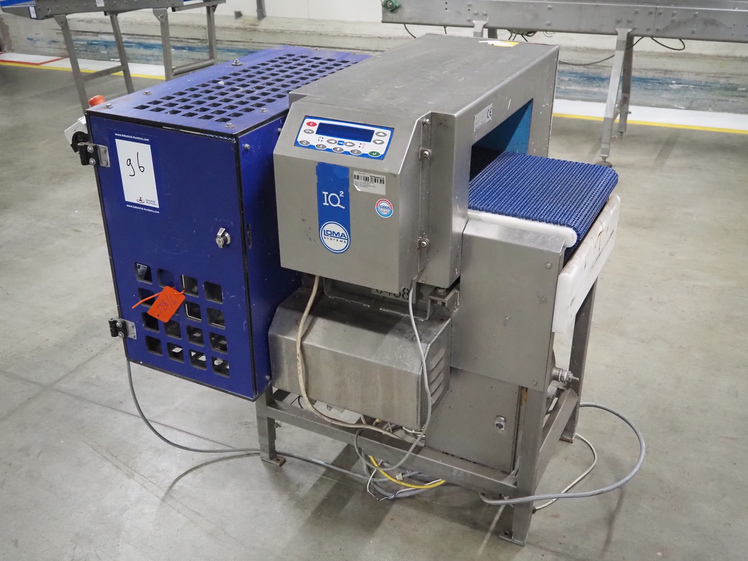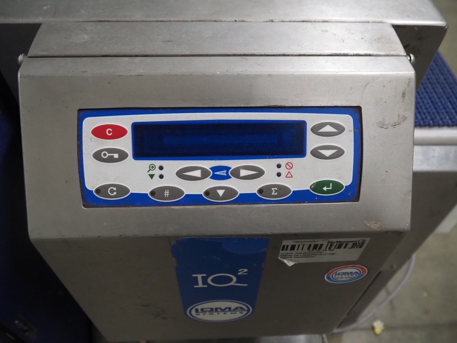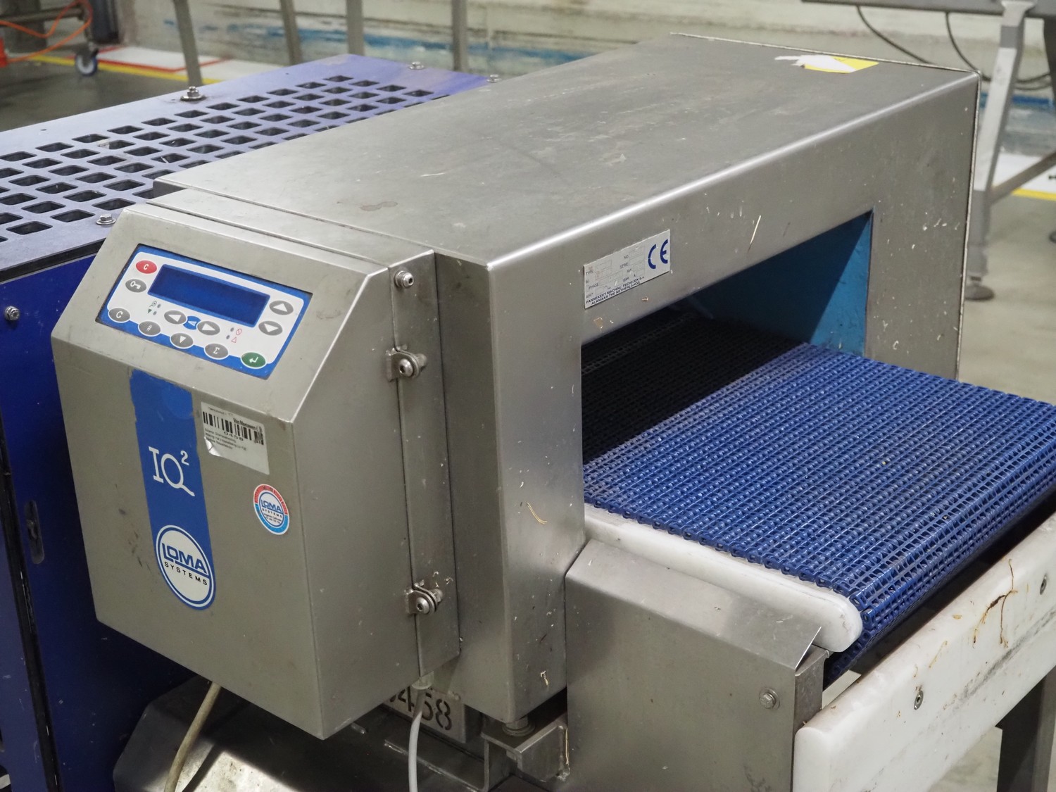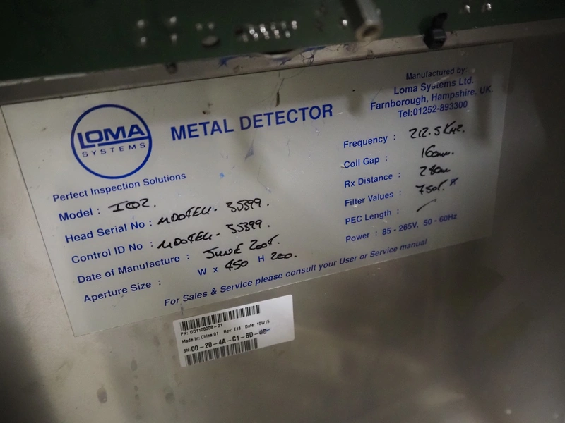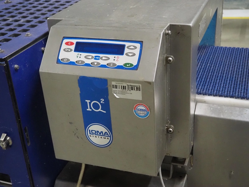 Loma Systems metal detector with rejector, type: IQ², serial number: MDO4EU-35399, year of construction: 2004, plastic mesh belt, belt width: 405 mm, clearance: 450 mm x 150 mm, total dimensions: 1200 mm x 1000 mm x 1150 mm.