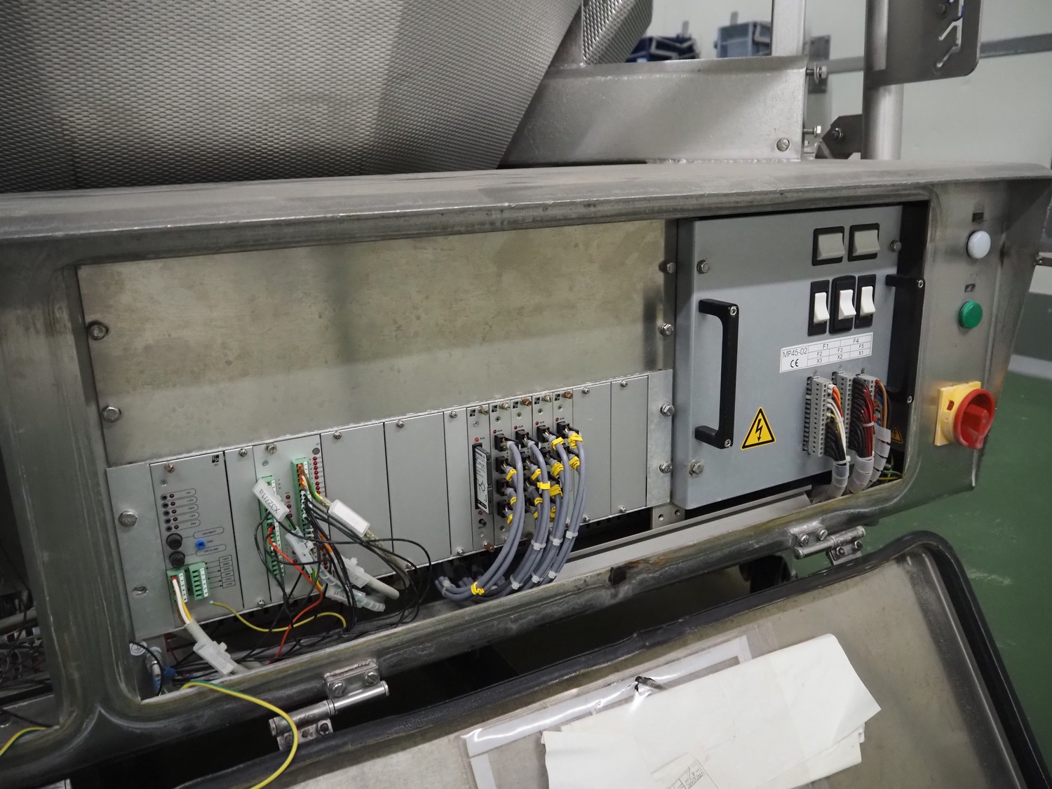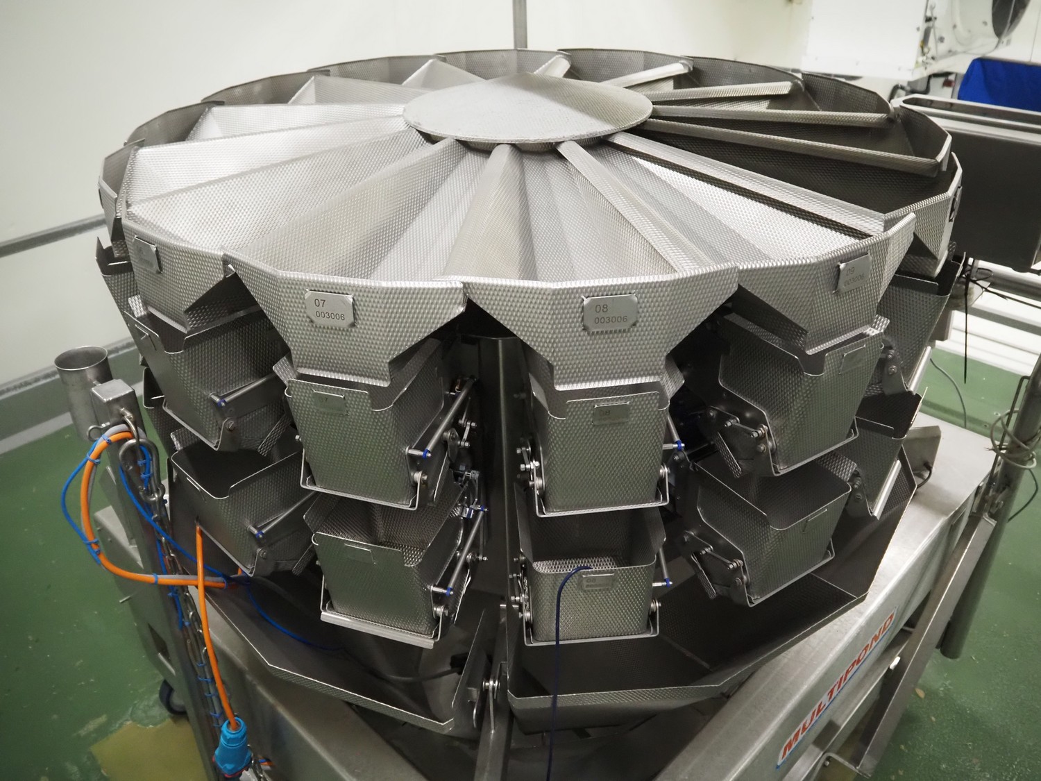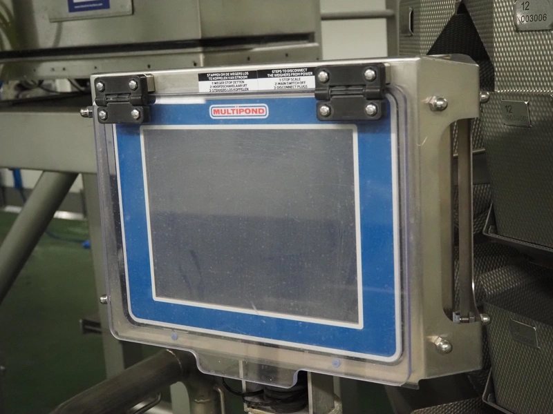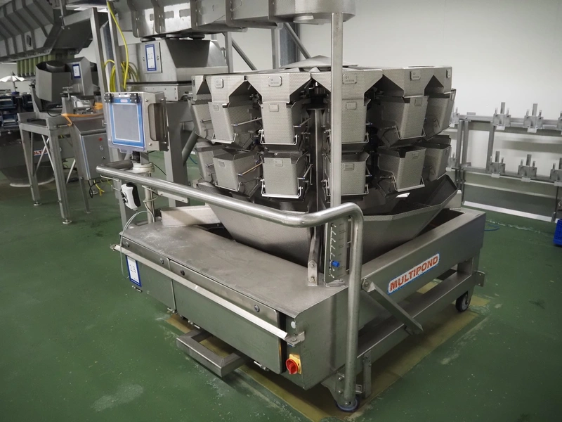 Multipond mobile 14-heads multihead weigher, type: MP 1424-FF, serial number: M1722, year of construction: 2002, 400 V, 3 Ph, 50 Hz, maximum weight: 10 kg, minimum weight: 200 g, d=1/2 g, dimensions: 1950 mm x 1650 mm x 1650 mm. Control panel already disconnected.
