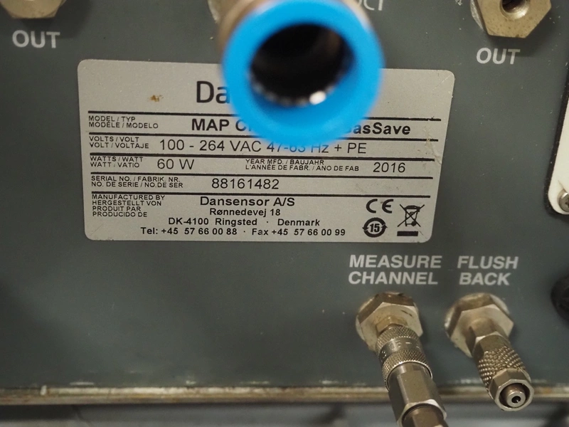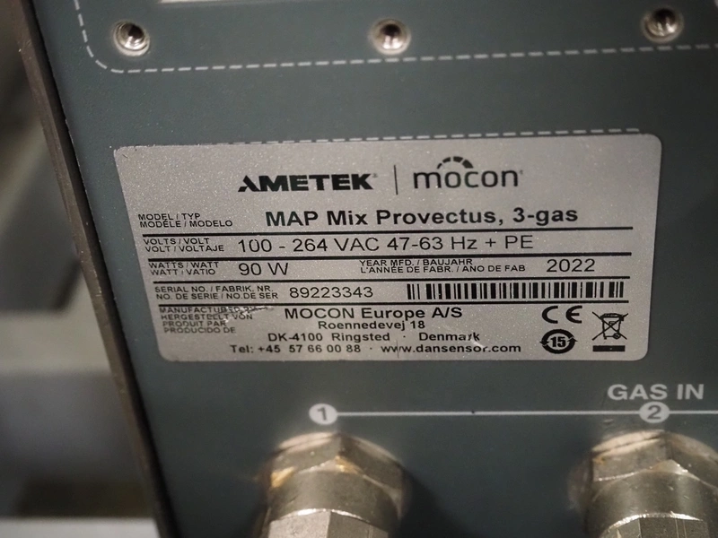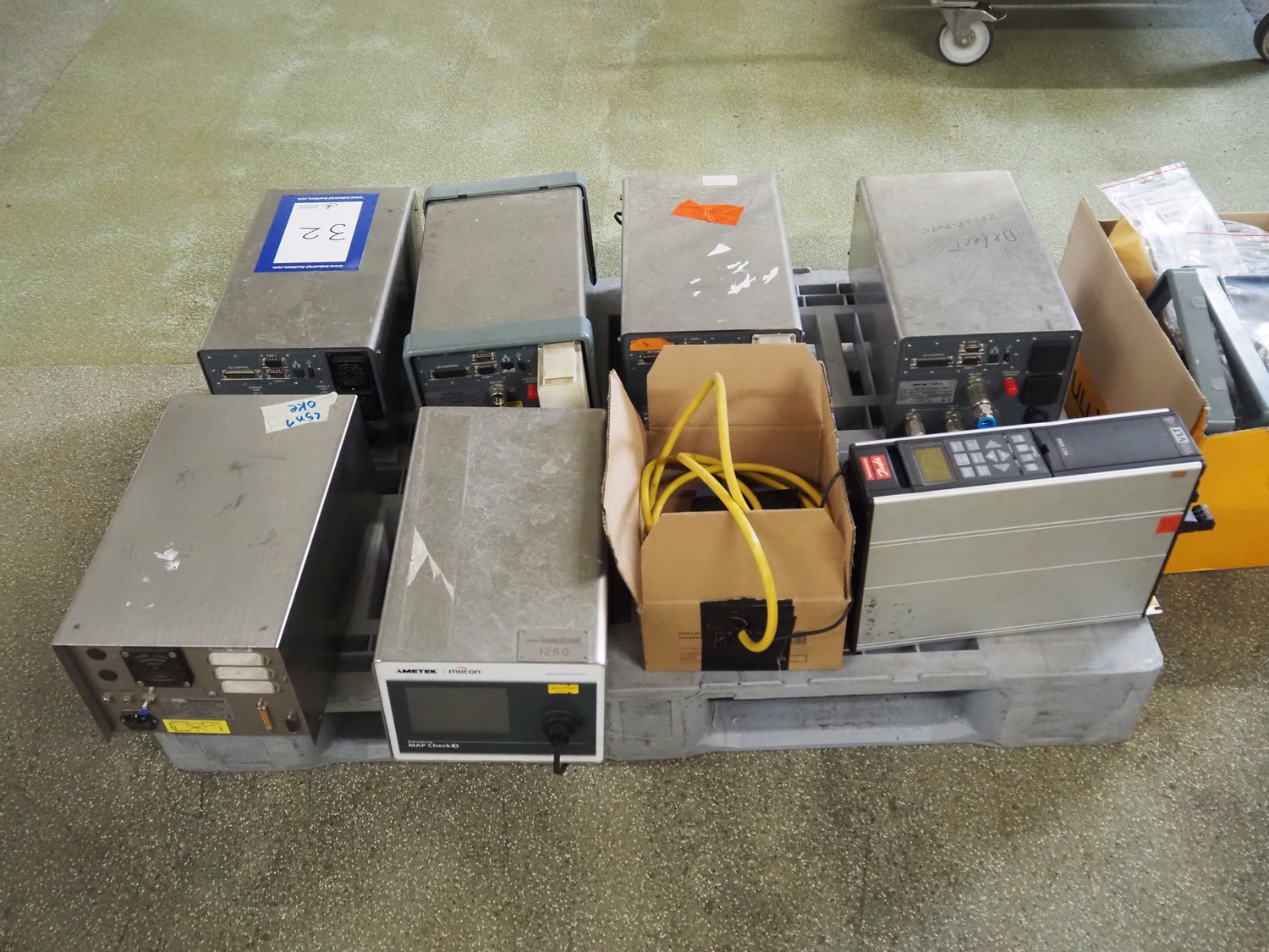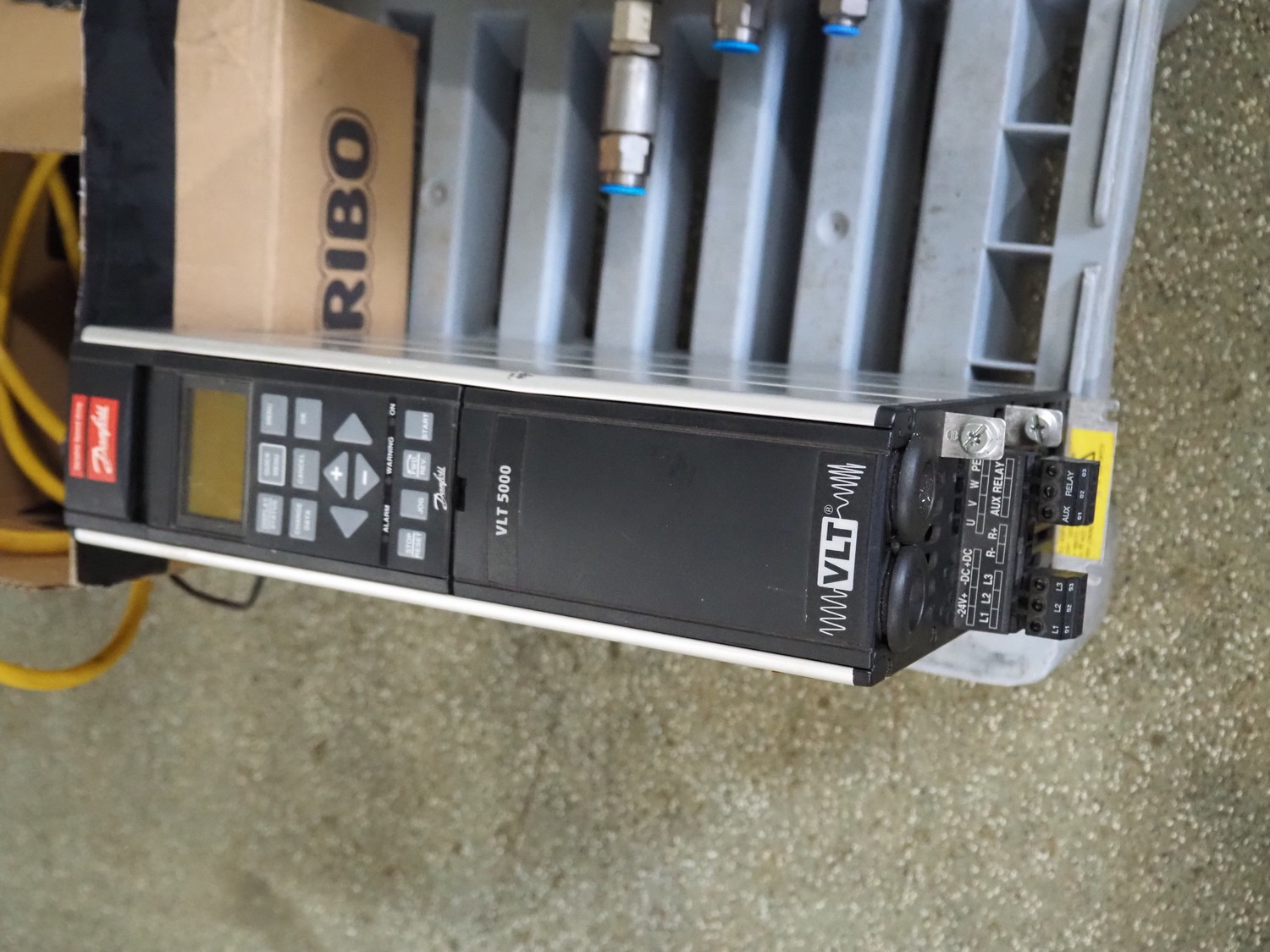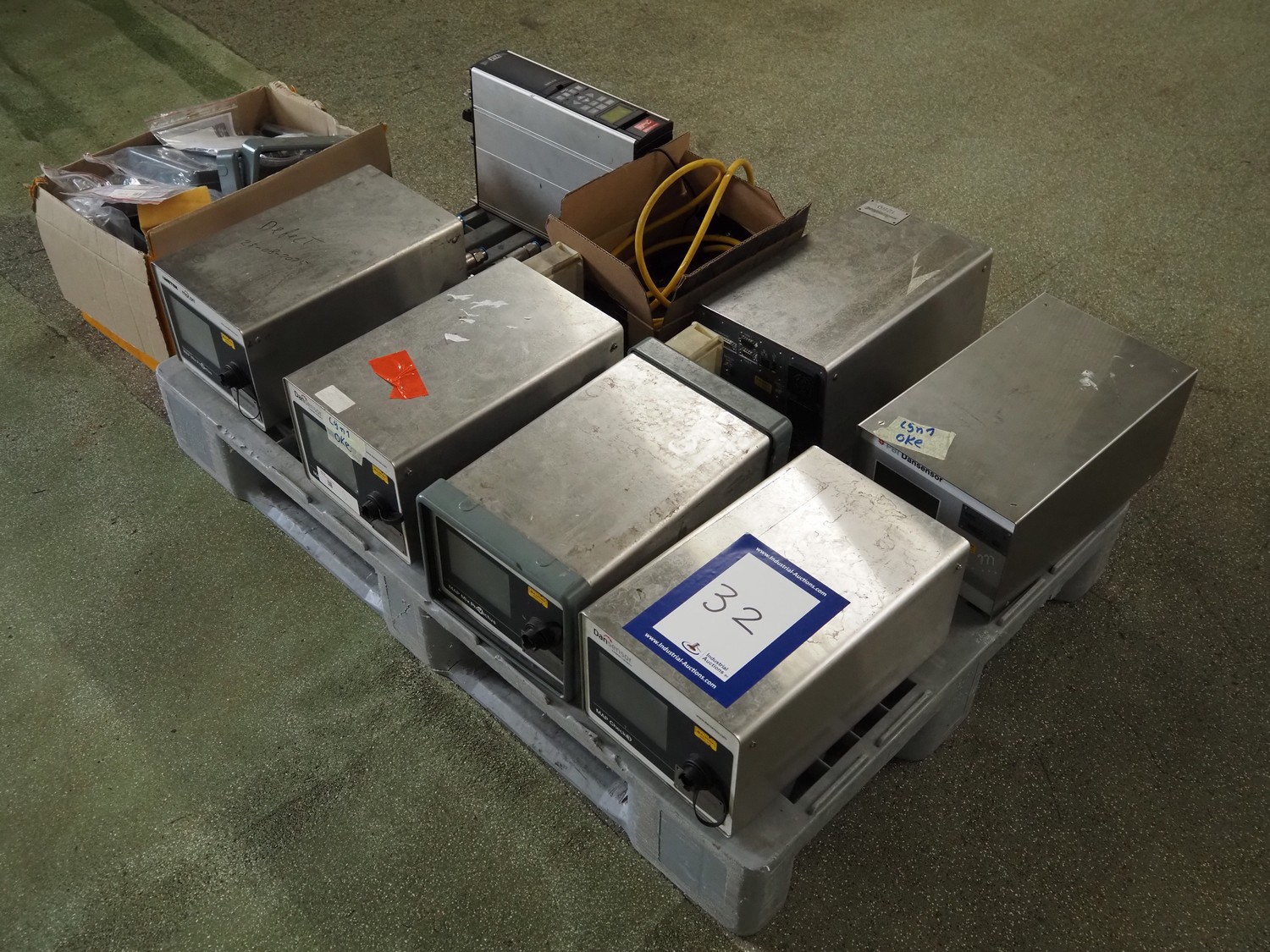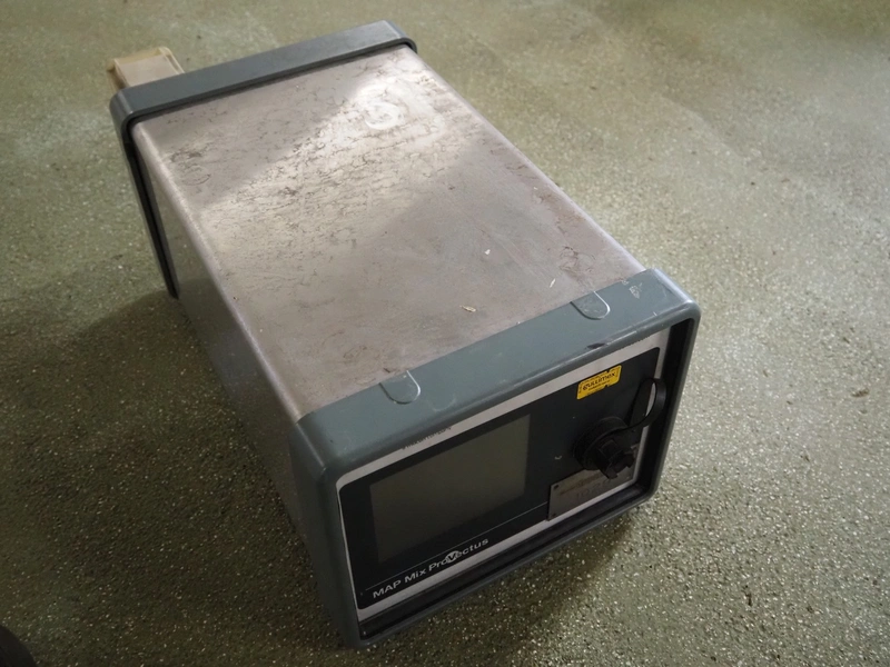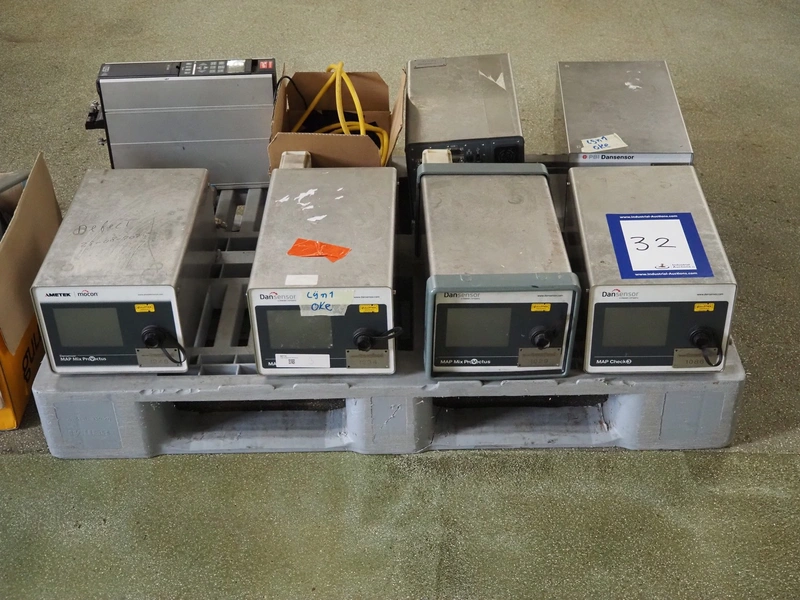 Pallet with 6 PBI Dansensor gas mix stations, models: MAP Mix Provectus and MAP Check, dimensions: (6x) 230 mm x 200 mm x 380 mm, 1 Danfoss frequency convertor. 1 gas mix station defect.