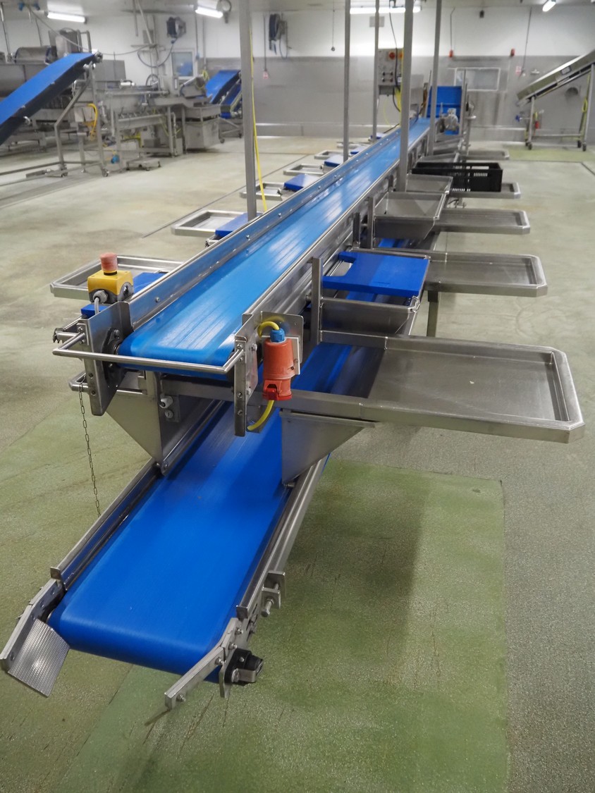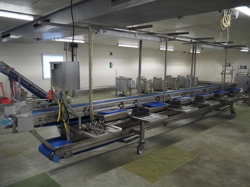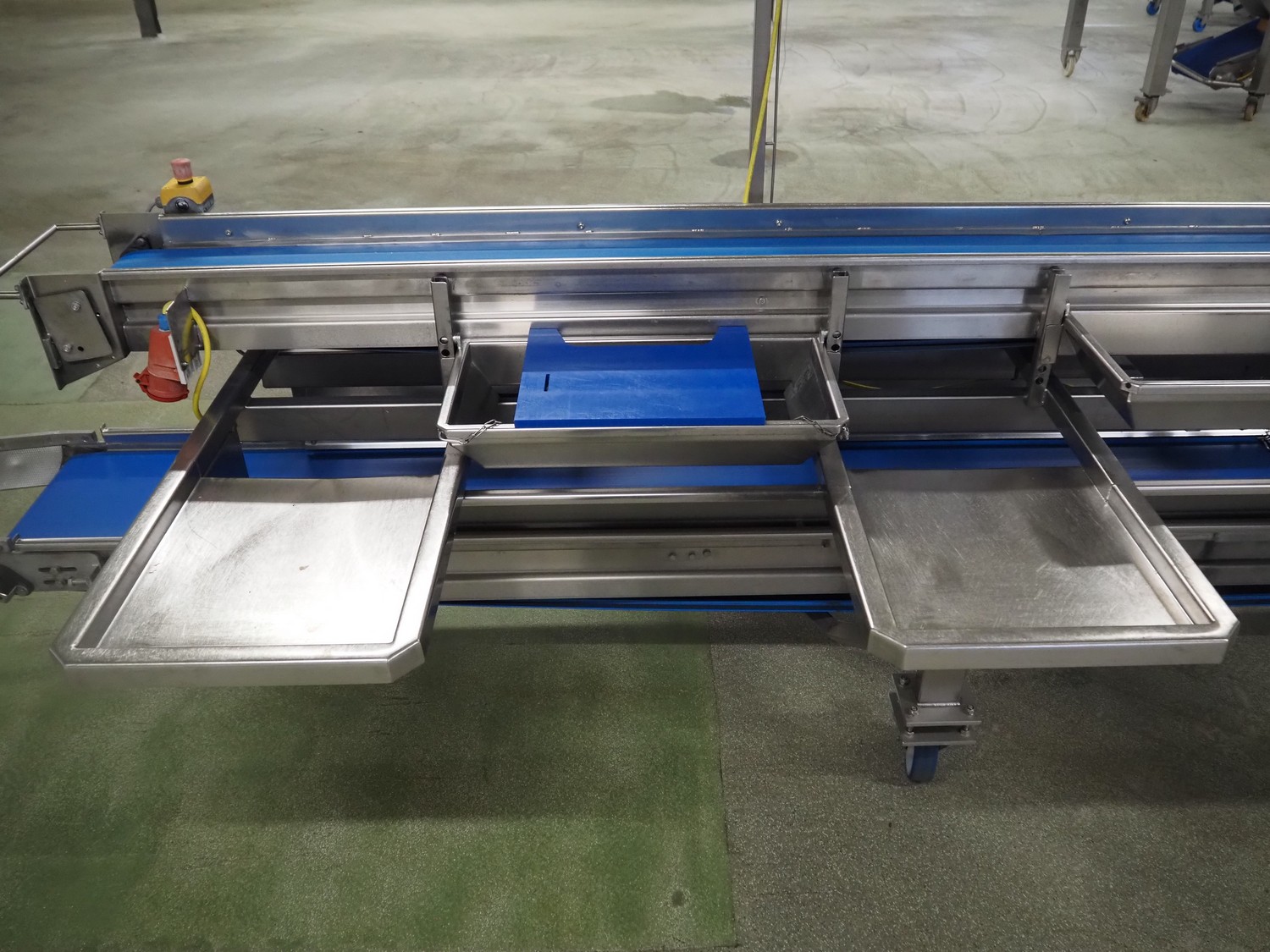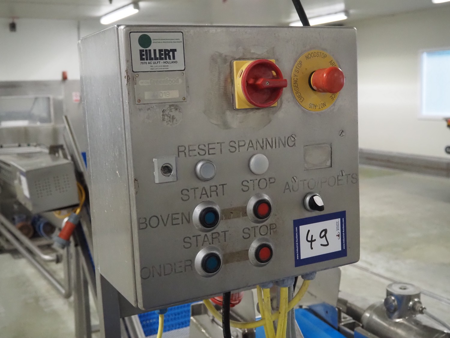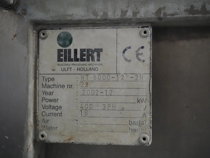 Eillert cutting table with 12 working stations, type: WT 6000 - 12 P - 2 N, machine number: 23, year of construction: 2002, 400 V, 3 Ph, 16 A, upper belt, belt width: 245 mm, lower belt, belt width: 390 mm, total dimensions: 8100 mm x 1900 mm x 2300 mm.