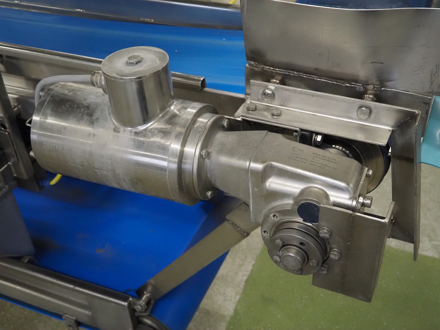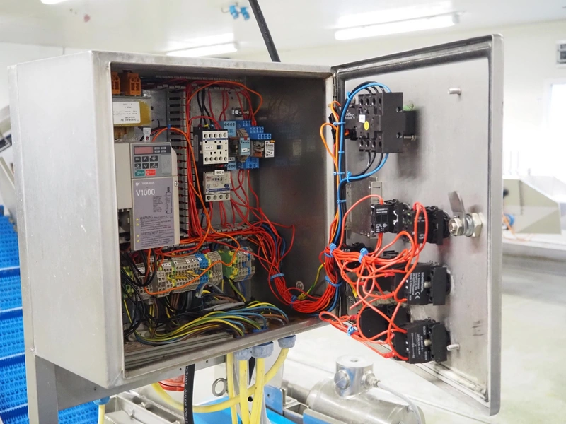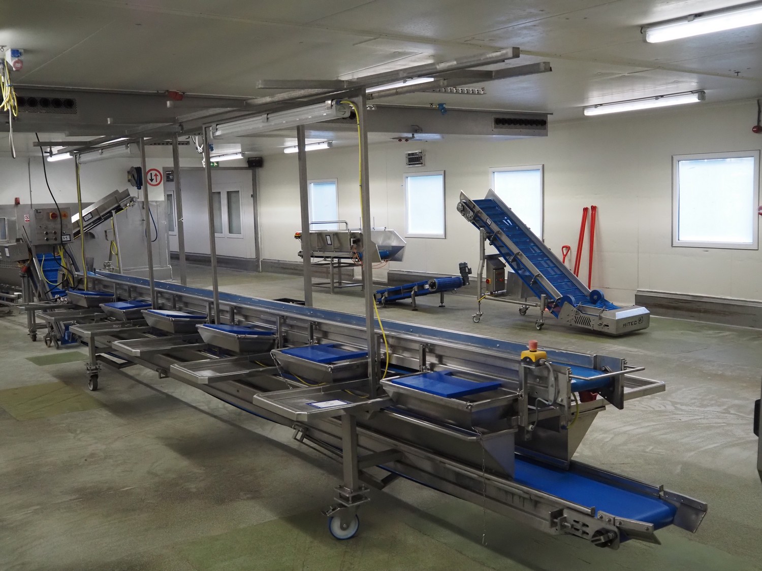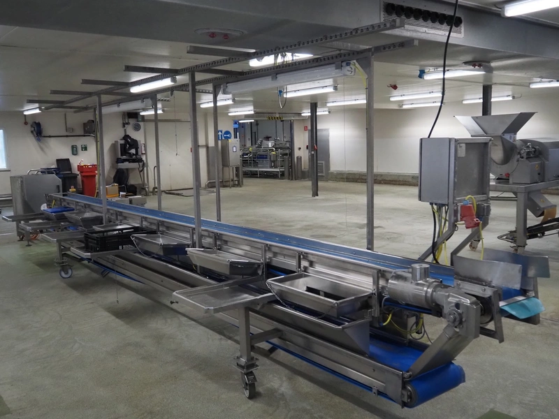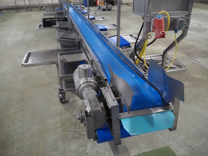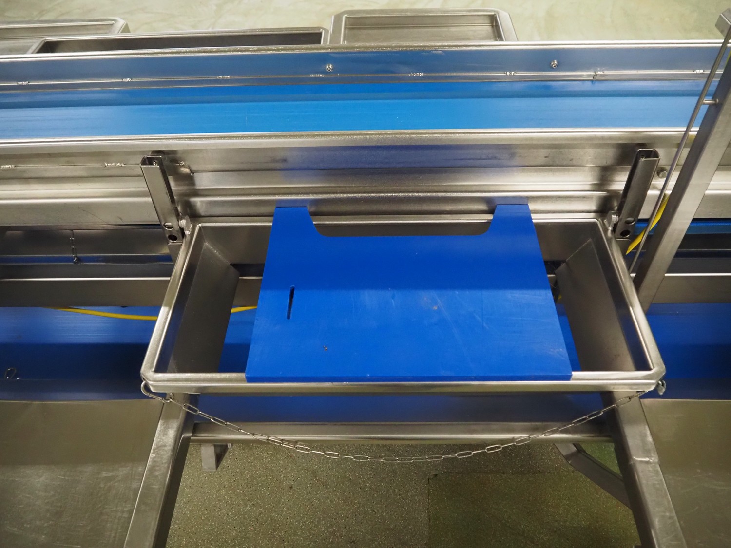Eillert cutting table with 12 working stations, type: WT 6000 - 12 P - 2 N, machine number: 23, year of construction: 2002, 400 V, 3 Ph, 16 A, upper belt, belt width: 245 mm, lower belt, belt width: 390 mm, total dimensions: 8100 mm x 1900 mm x 2300 mm.