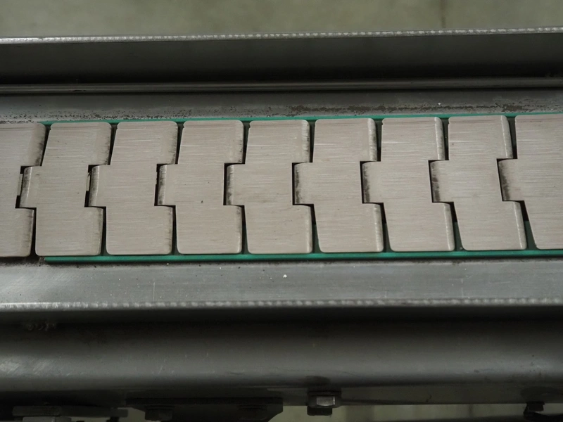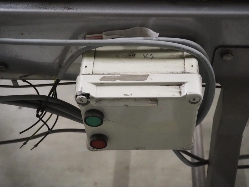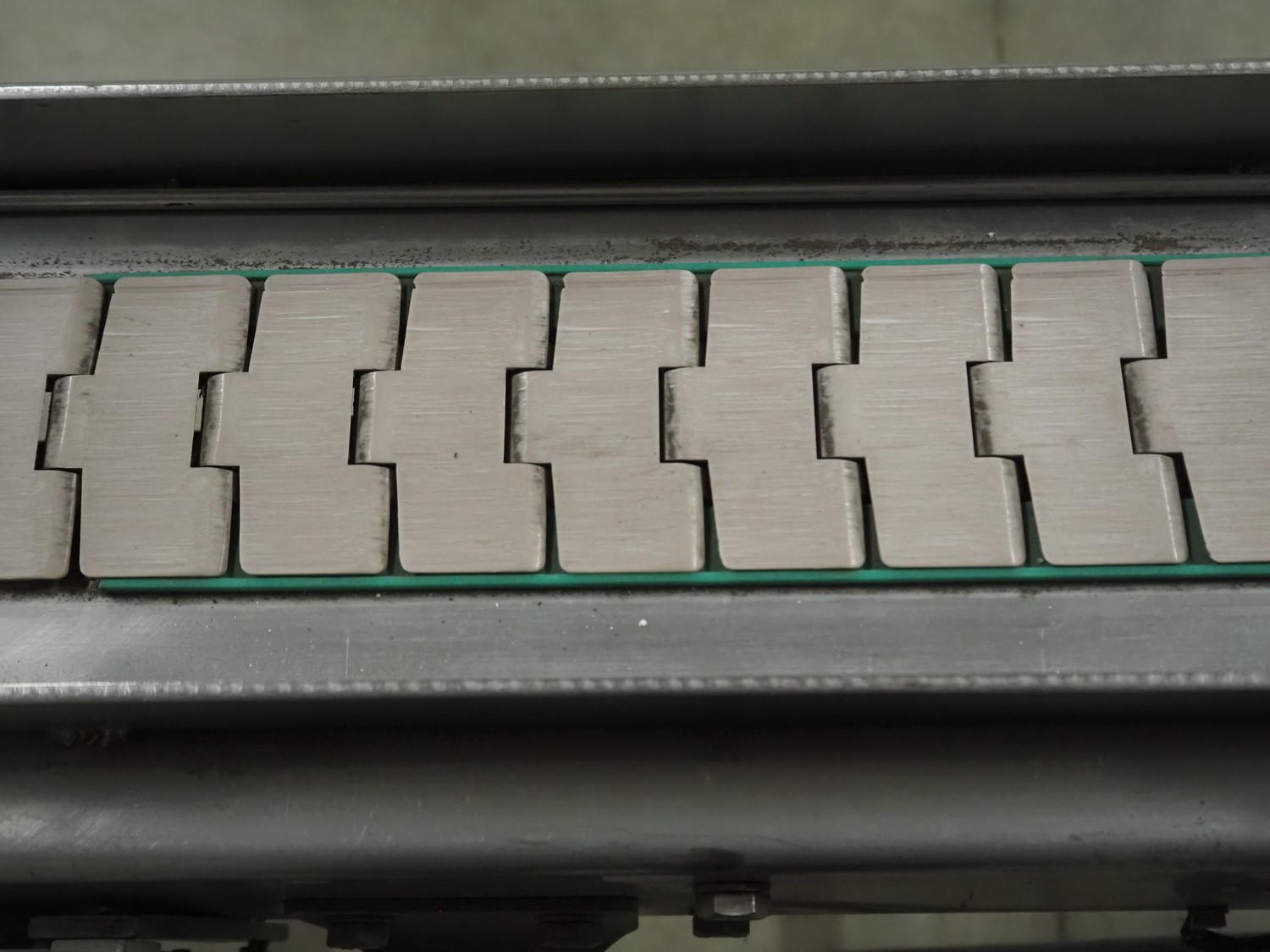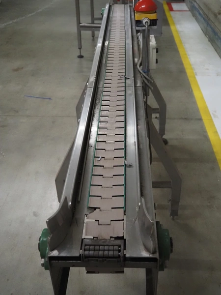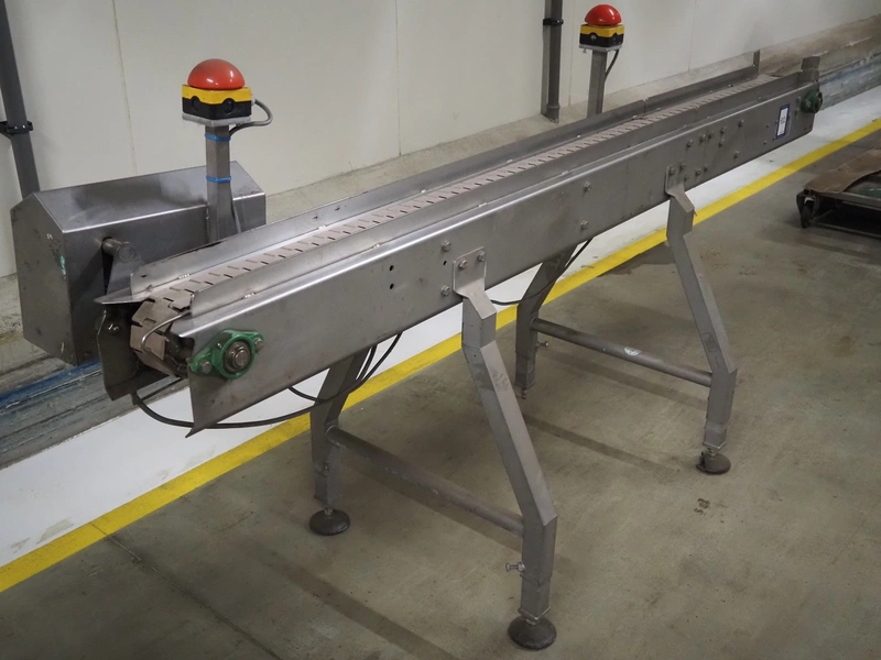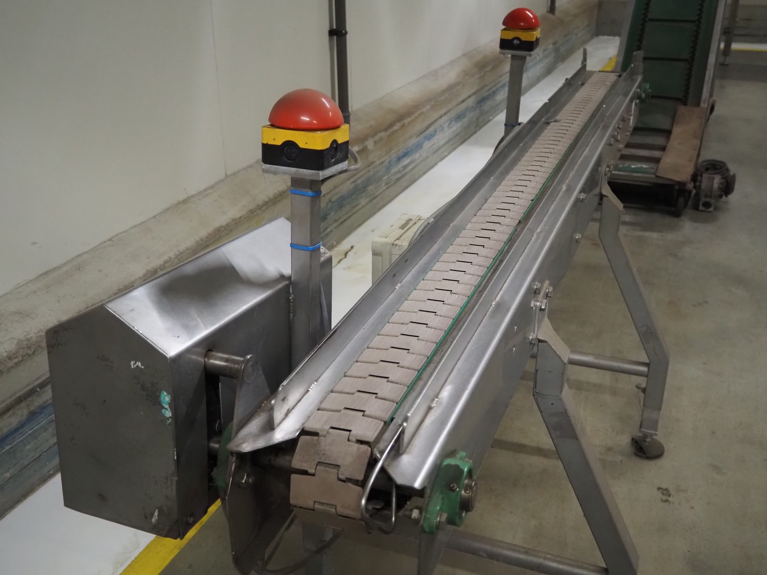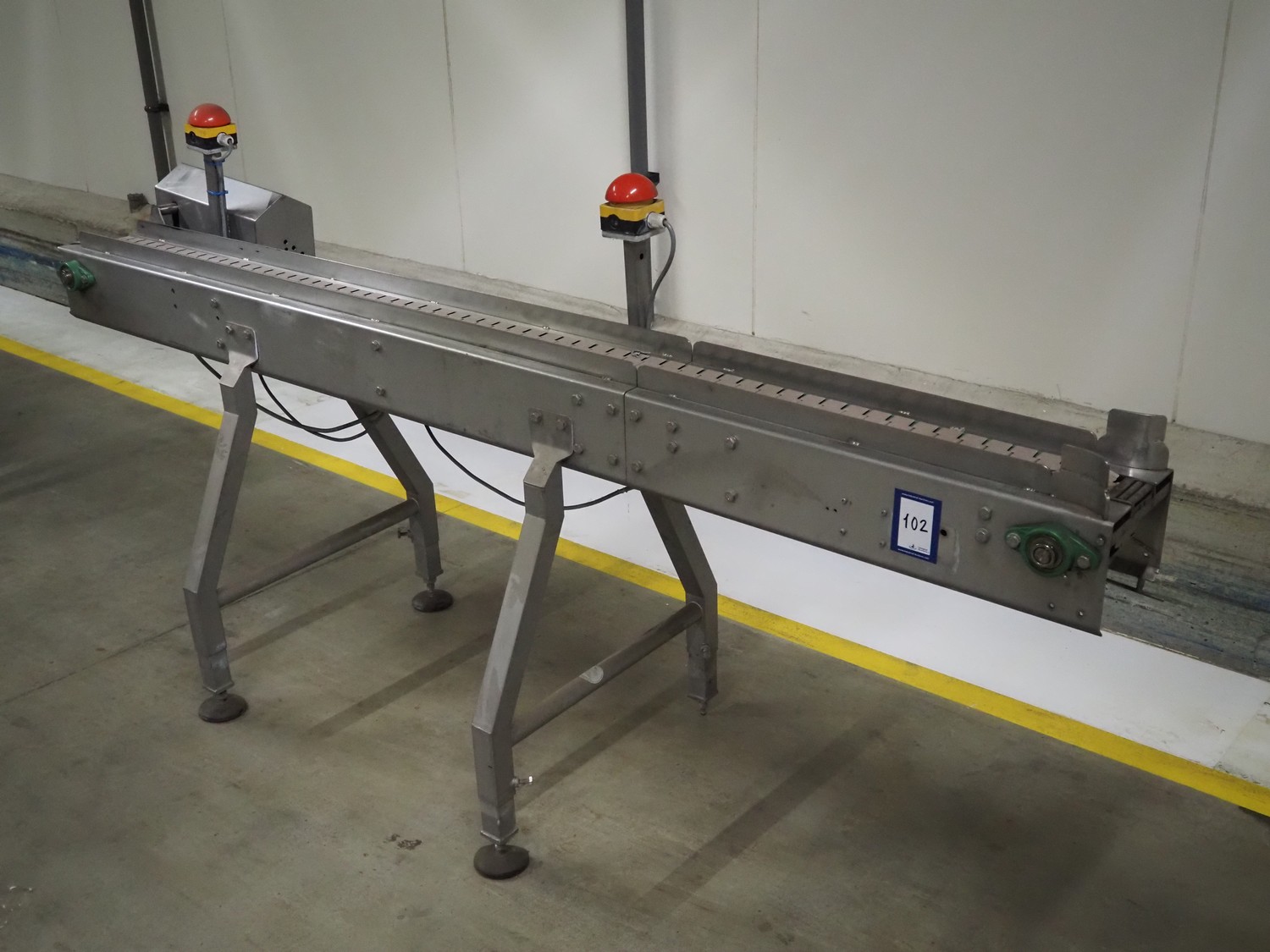 Transport belt, s/s frame, plastic belt, belt width: 85 mm, total dimensions: 2530 mm x 690 mm x 1200 mm.