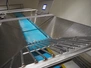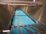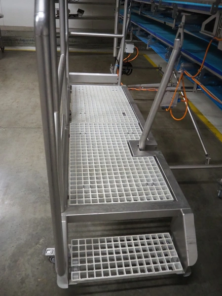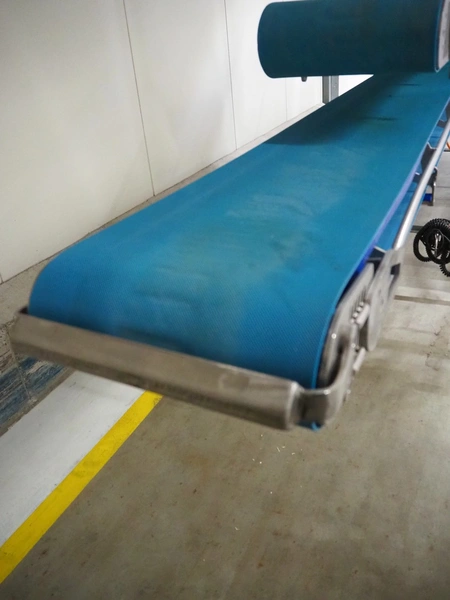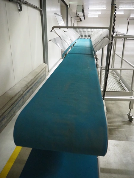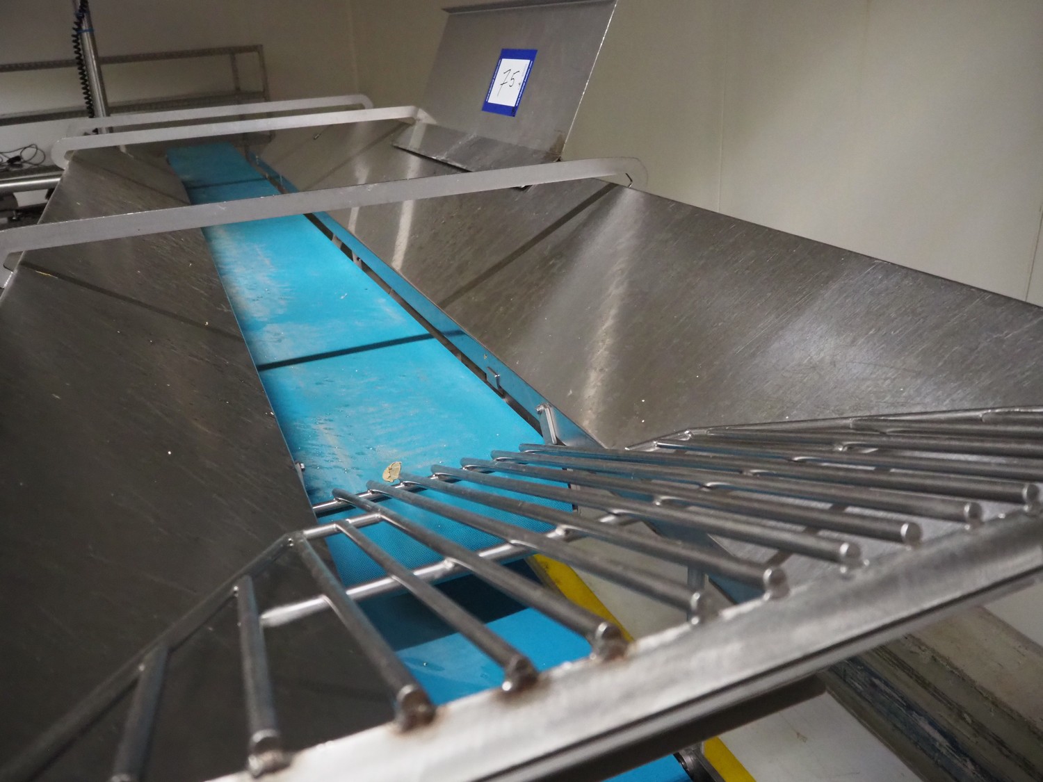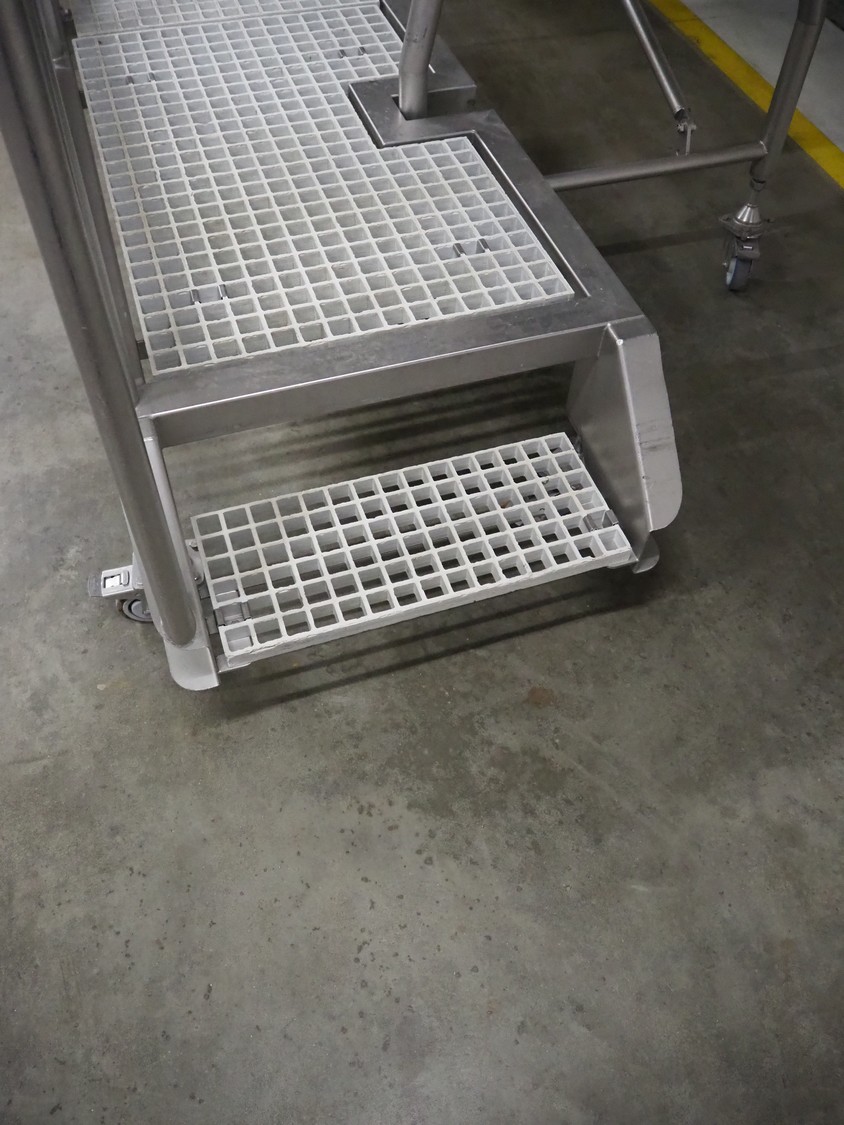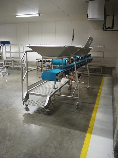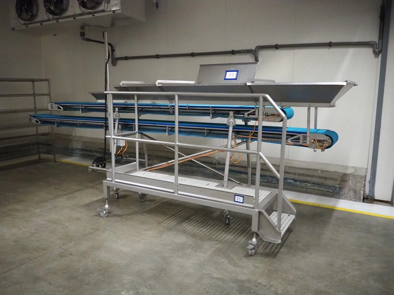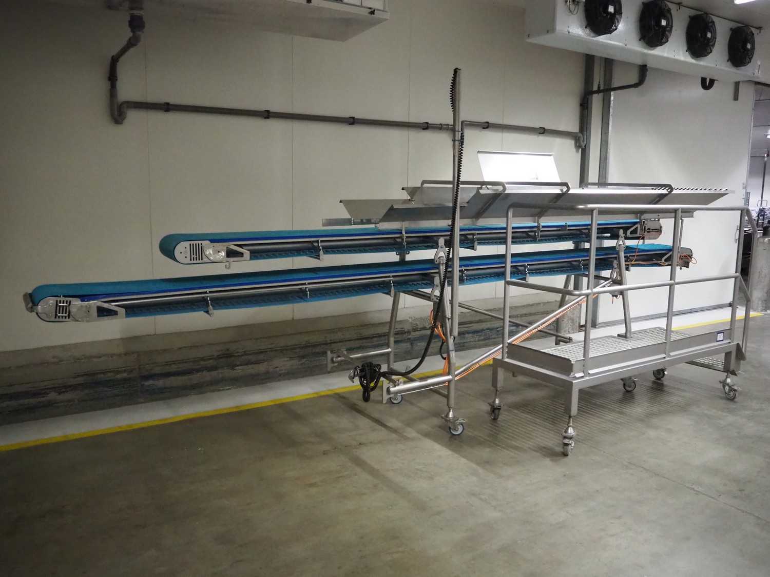 Hitec double transport belt with mobile working platform, type: In-feed conveyor / Afvalband, year of construction: 2014, s/s frame, plastic belt, belt width: 320 mm, total dimensions: 5500 mm x 960 mm x 2400 mm, s/s mobile working platform with plastic gratings, dimensions platform: 2200 mm x 730 mm x 1530 mm.