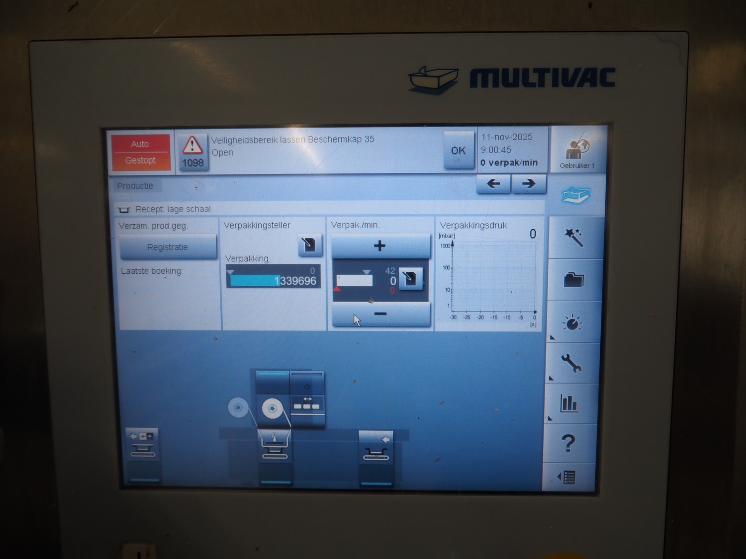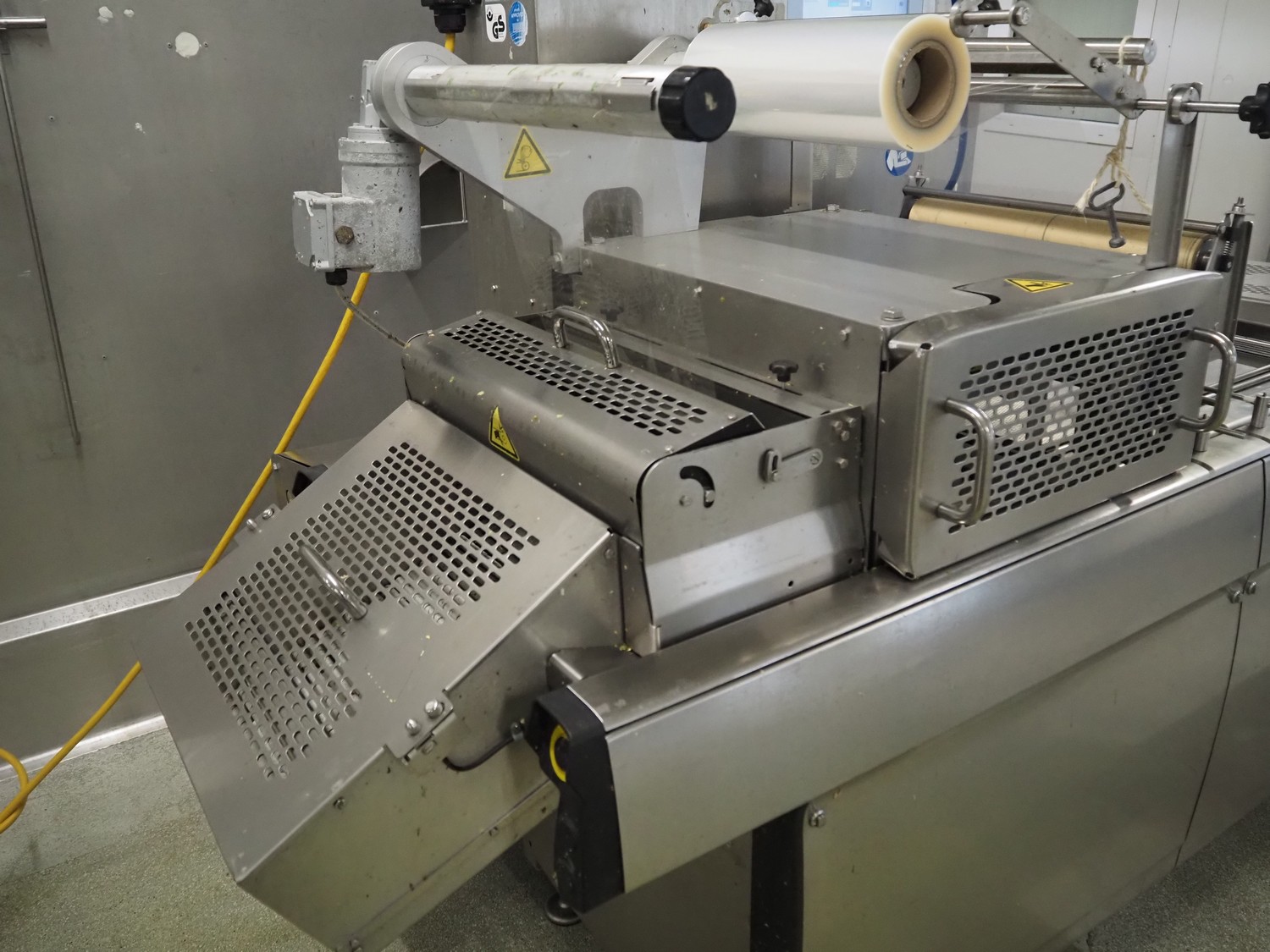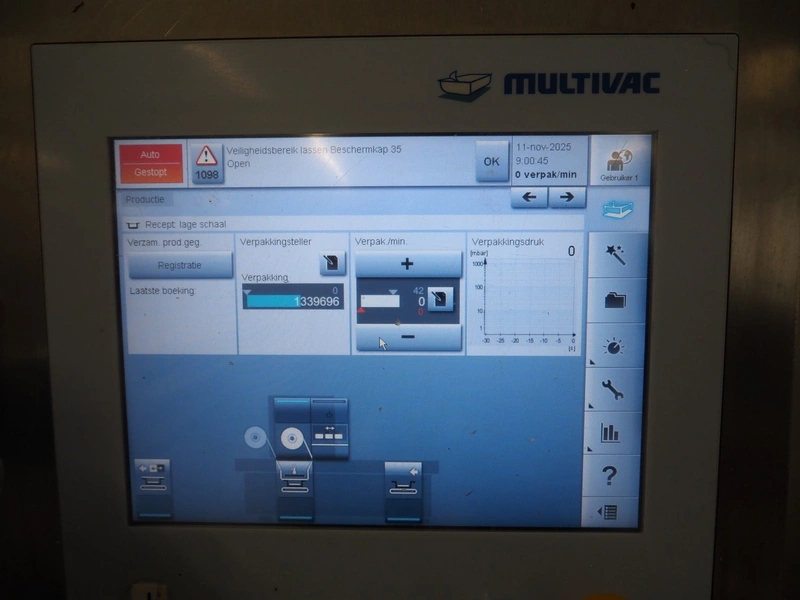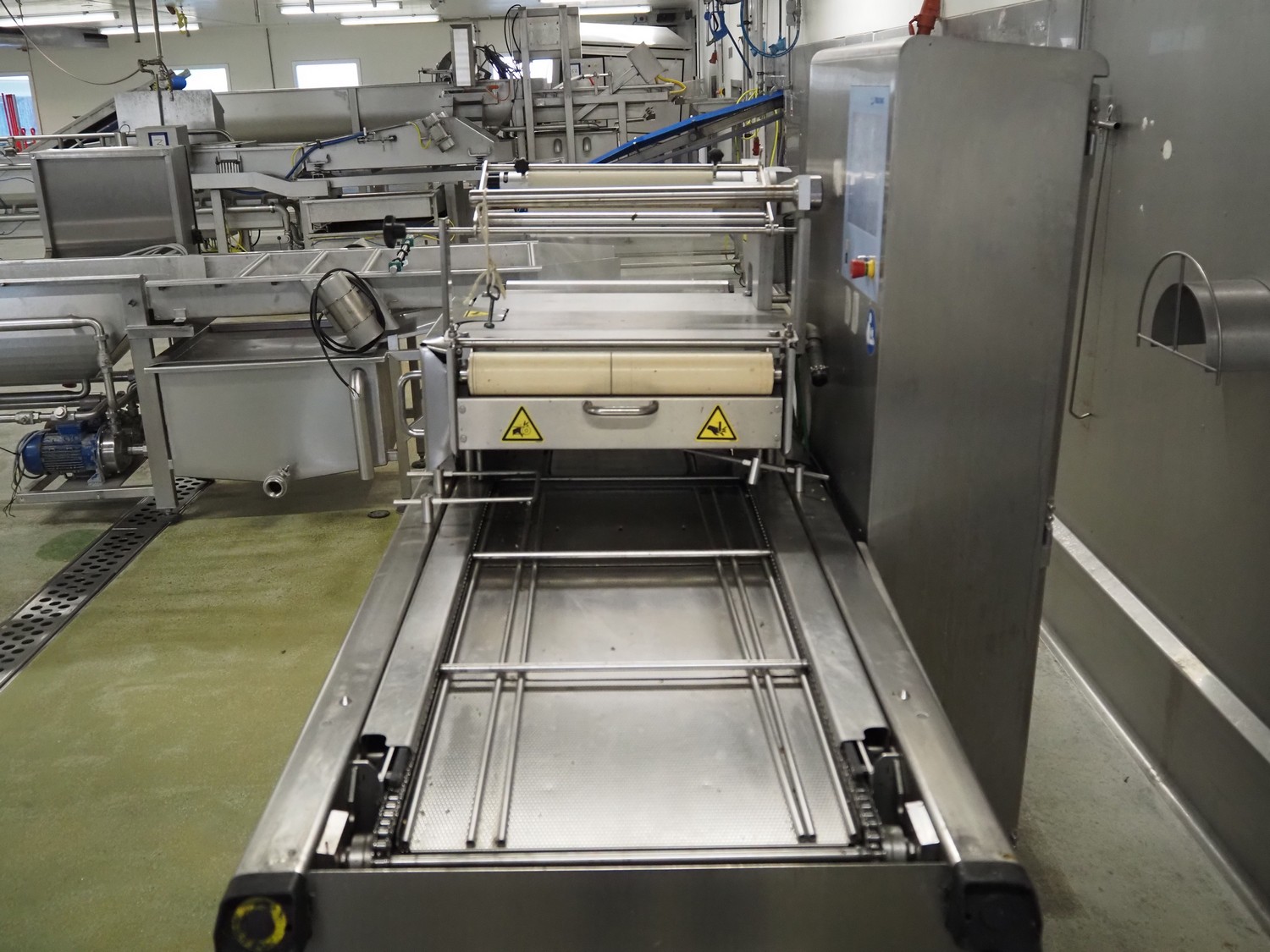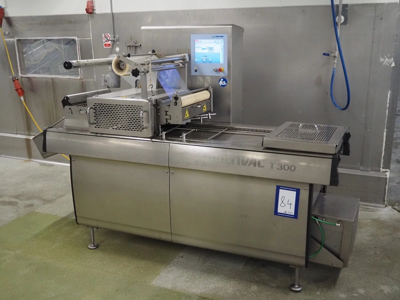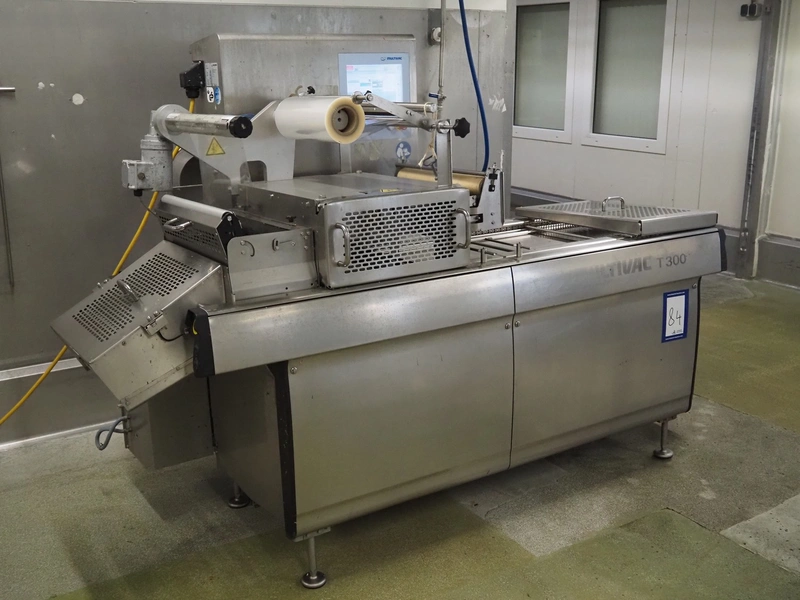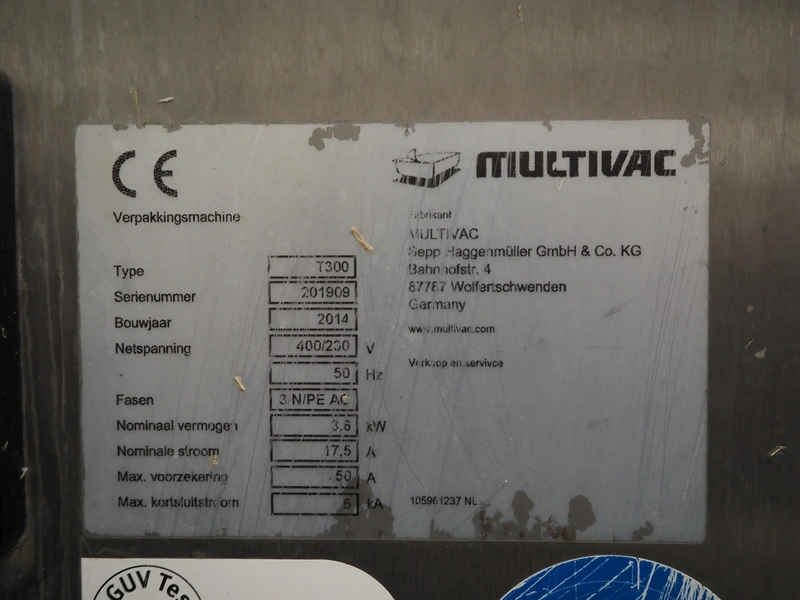 Multivac traysealer, type: T300, serial number: 201909, year of construction: 2014, 400/230 V, 3 Ph, 50 Hz, 17.5 A, 3.6 kW, film width: 360 mm, dye: 290 mm x 220 mm, plastic rollers, roller width: 460 mm, total dimensions: 2700 mm x 1250 mm x 1800 mm. Without vacuum pump.