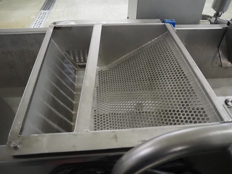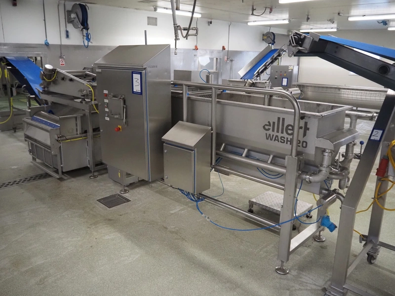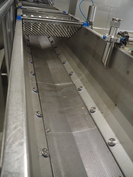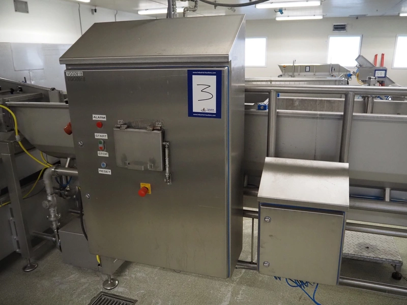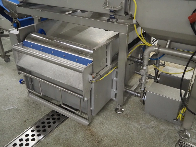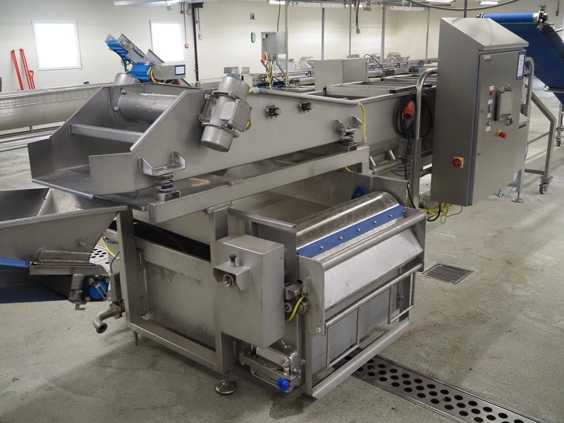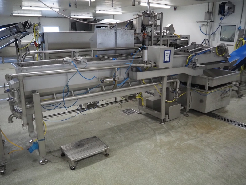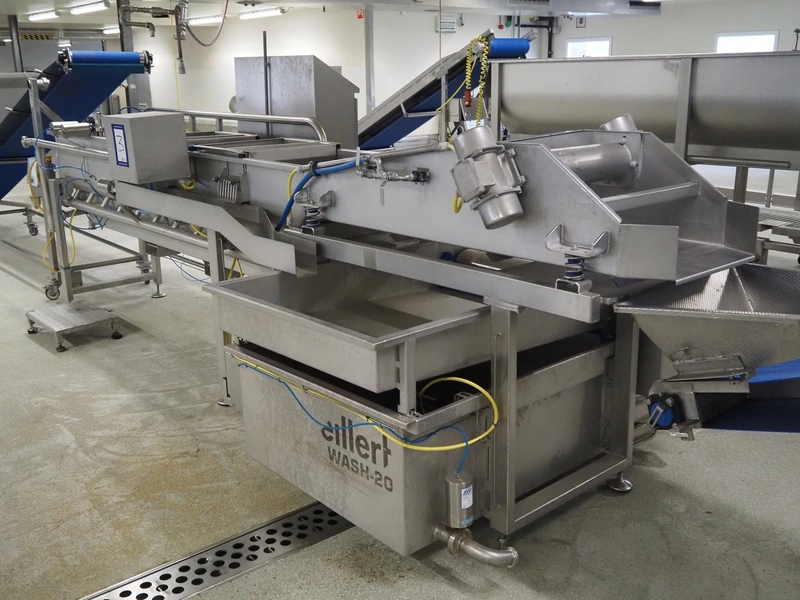 Eillert vegetable washer with outfeed vibrating gutter, model: WASH-20, year of construction: 2015, gutter width: 600 mm, sieve width: 900 mm, sieve: 0.5 mm, 2 Packo Inox centrifugal pumps, total dimensions: 4900 mm x 1500 mm x 1850 mm.