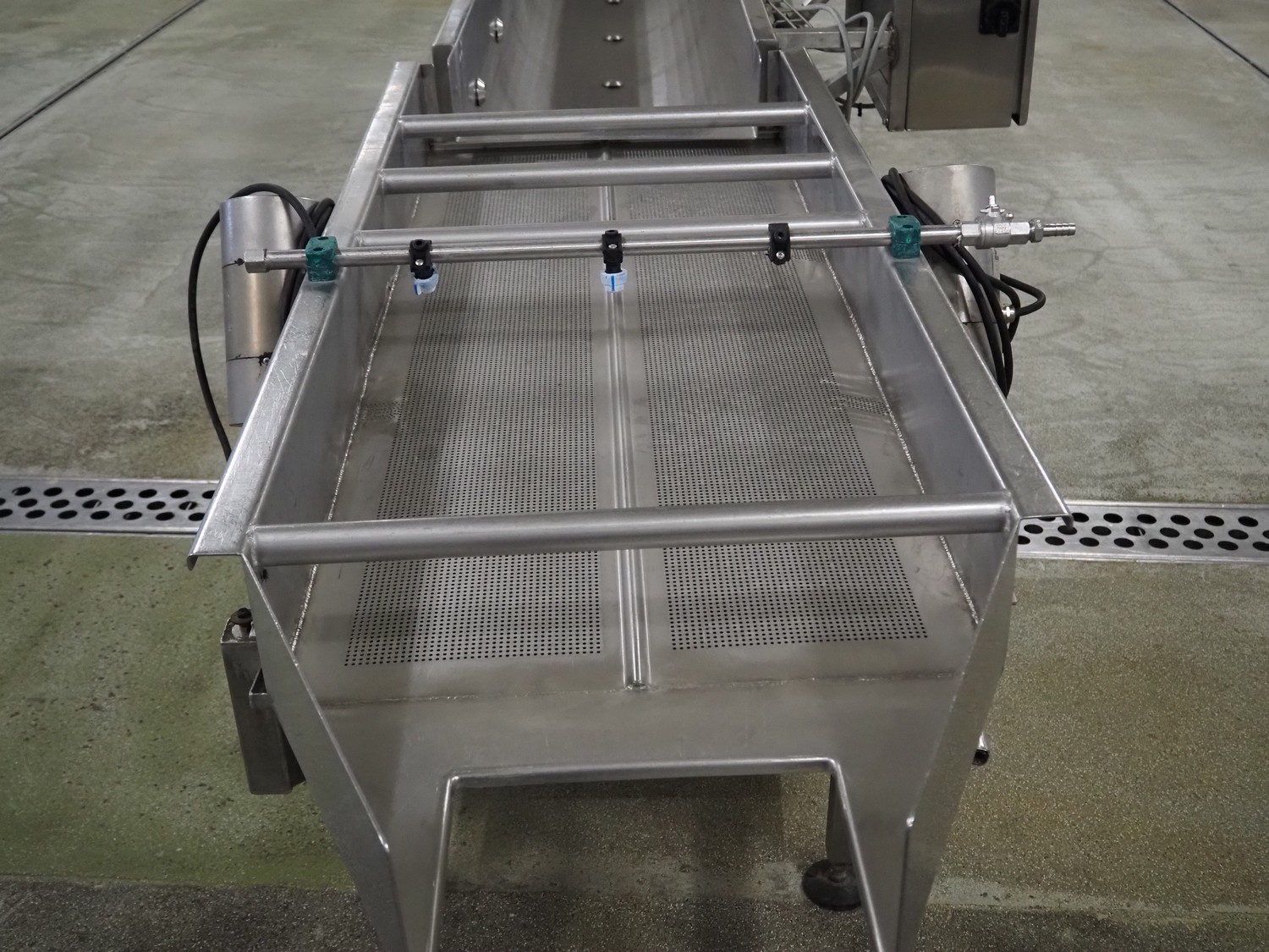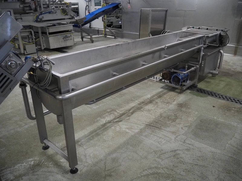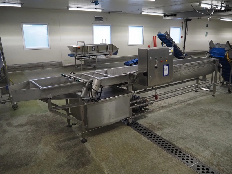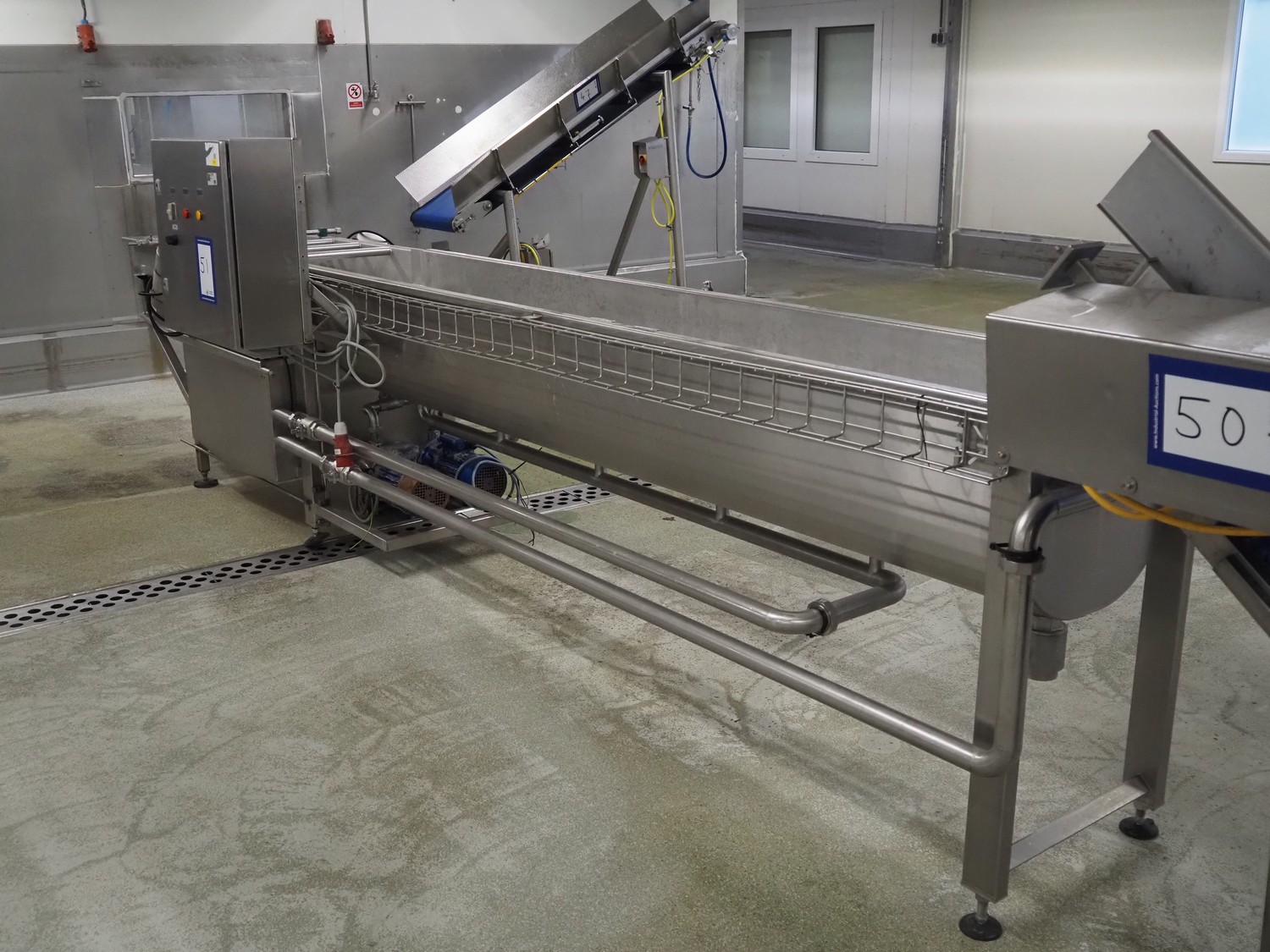 Eillert vegetable washer with outfeed vibrating gutter, gutter width: 600 mm, total dimensions: 5000 mm x 1300 mm x 1450 mm.