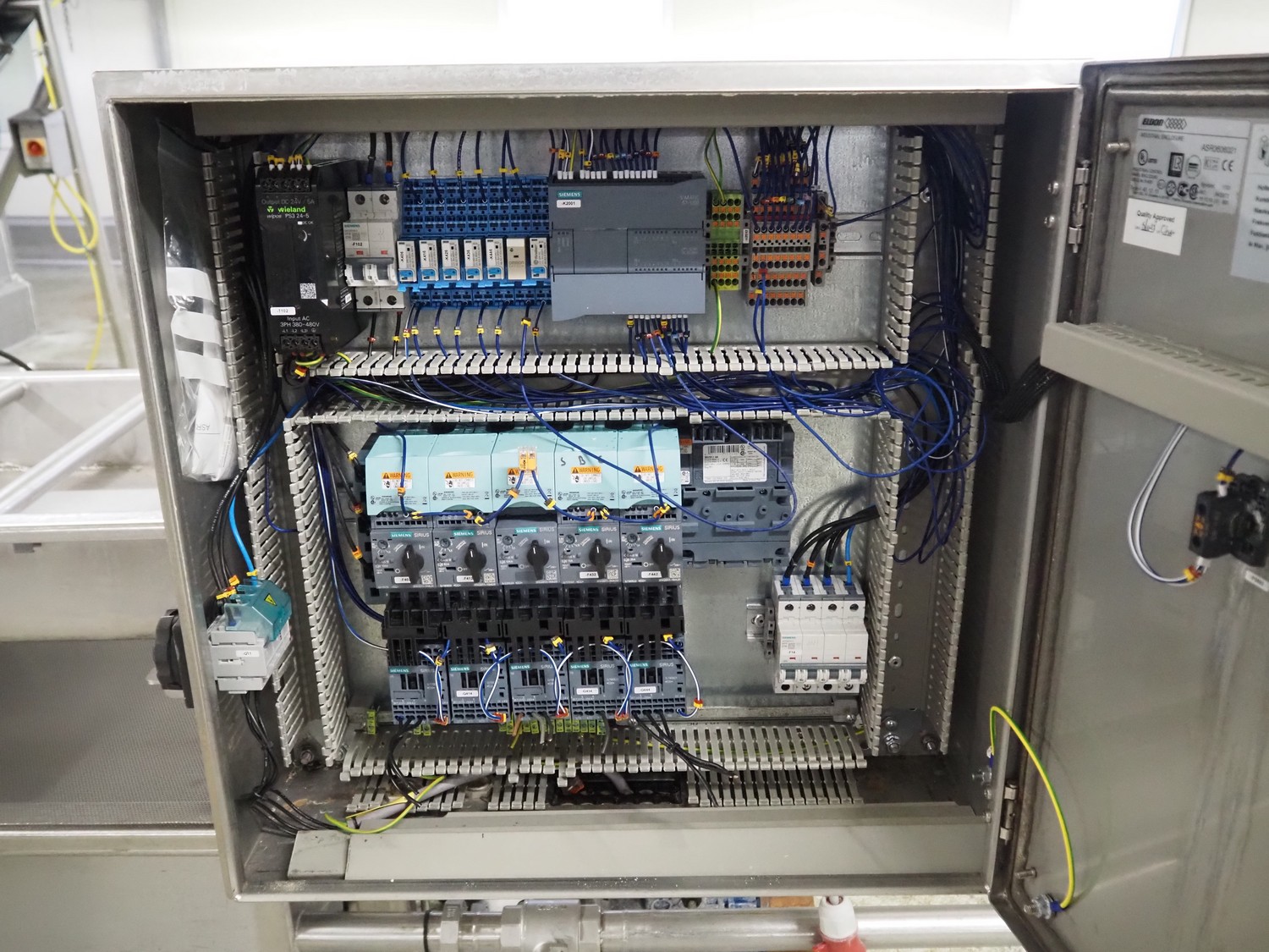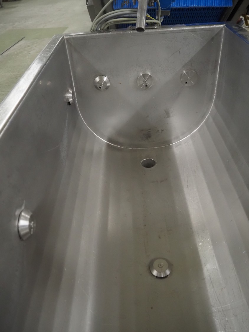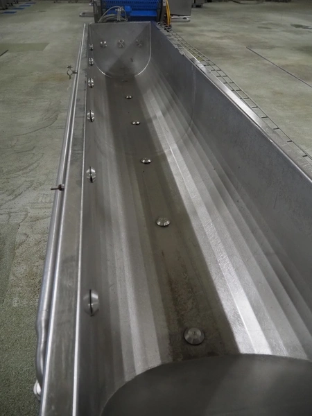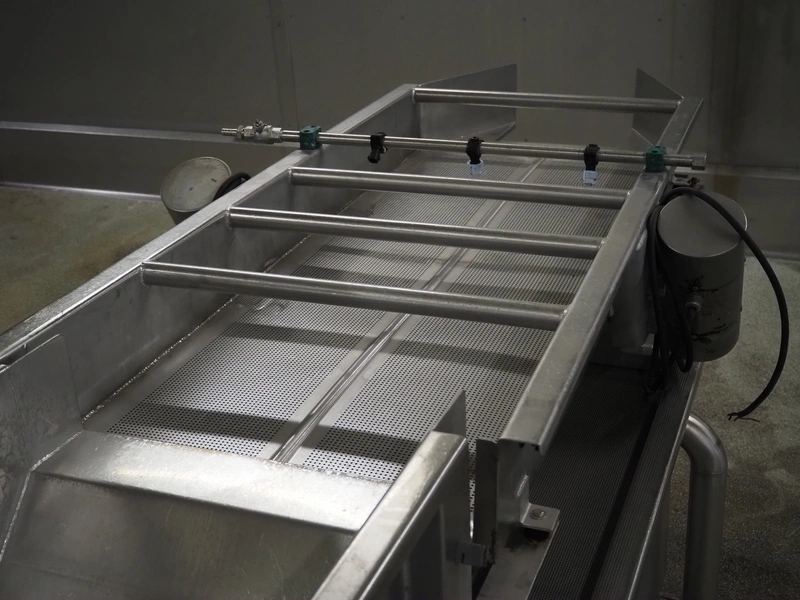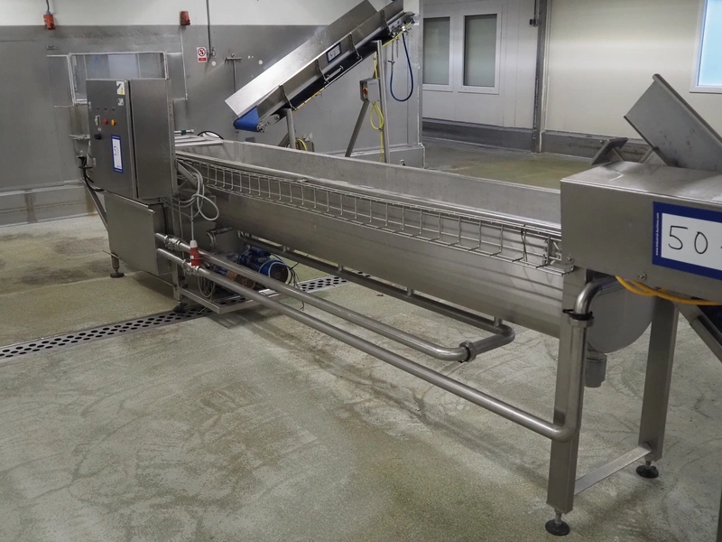 Eillert vegetable washer with outfeed vibrating gutter, gutter width: 600 mm, total dimensions: 5000 mm x 1300 mm x 1450 mm.
