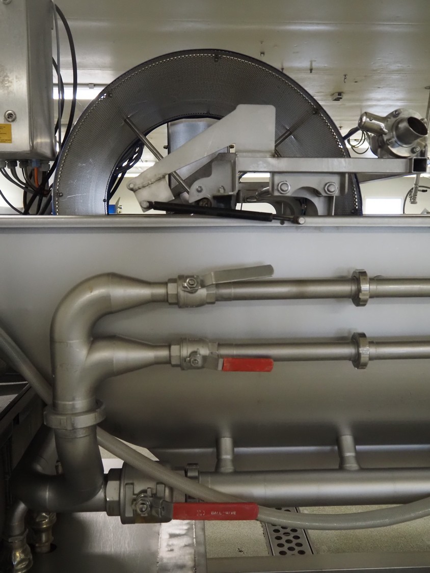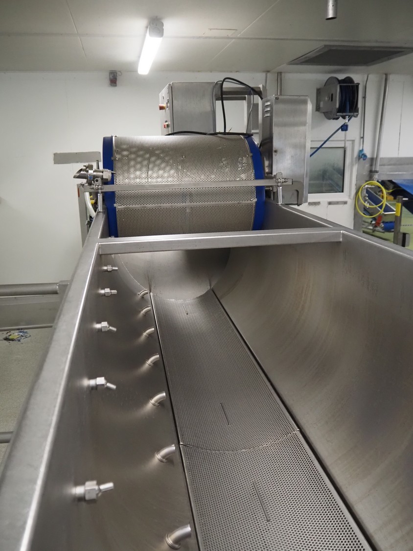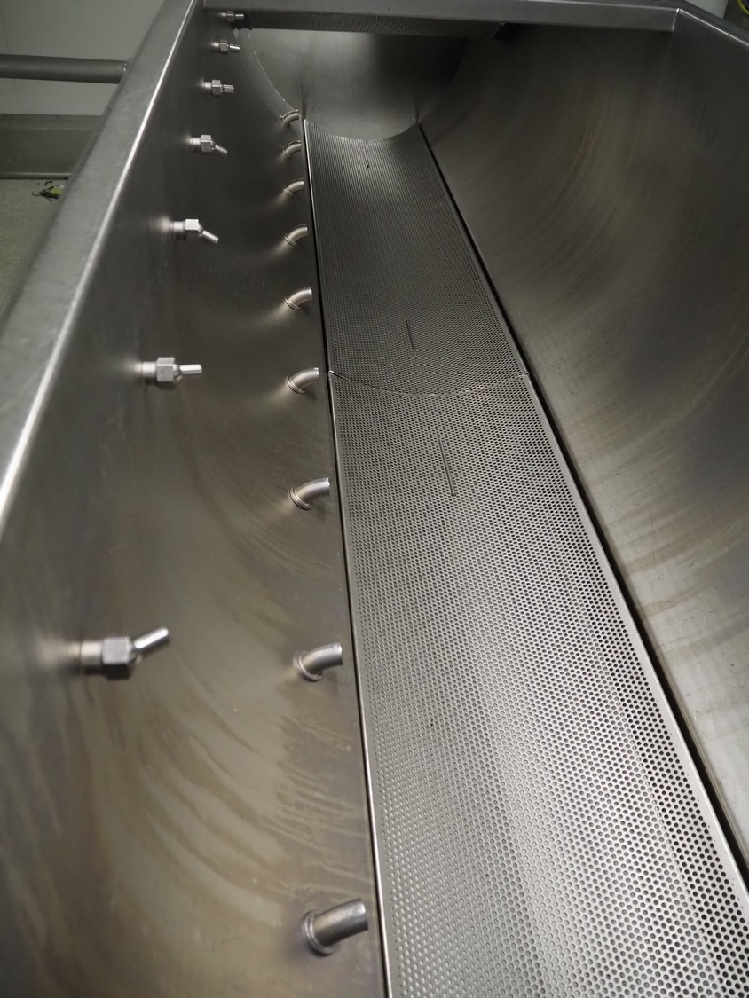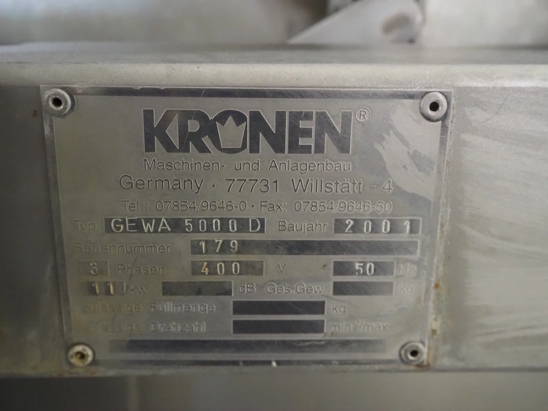 Kronen vegetable washer with outfeed vibrating gutter, type: GEWA 5000 D, serial number: 179, year of construction: 2001, 400 V, 3 Ph, 50 Hz, 11 kW, gutter width: 800 mm, total dimensions: 5200 mm x 1400 mm x 2400 mm.