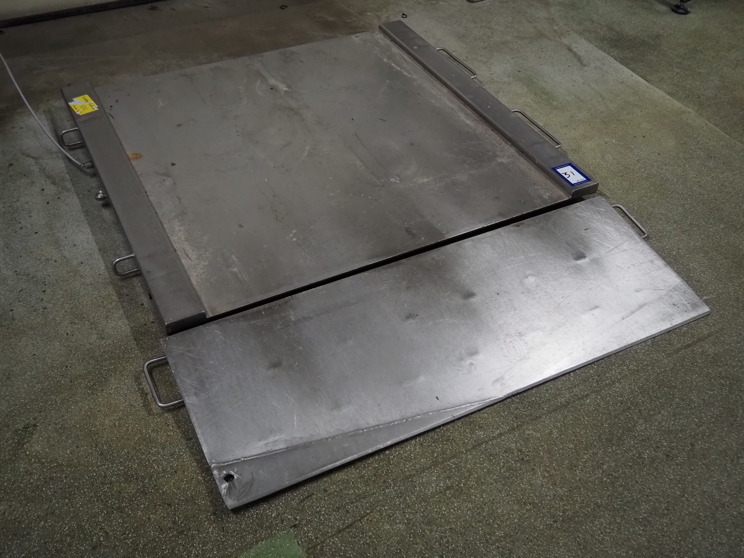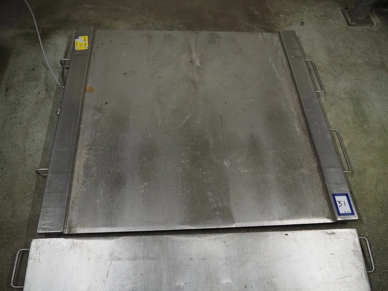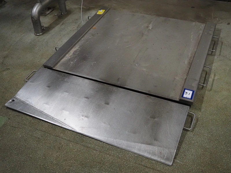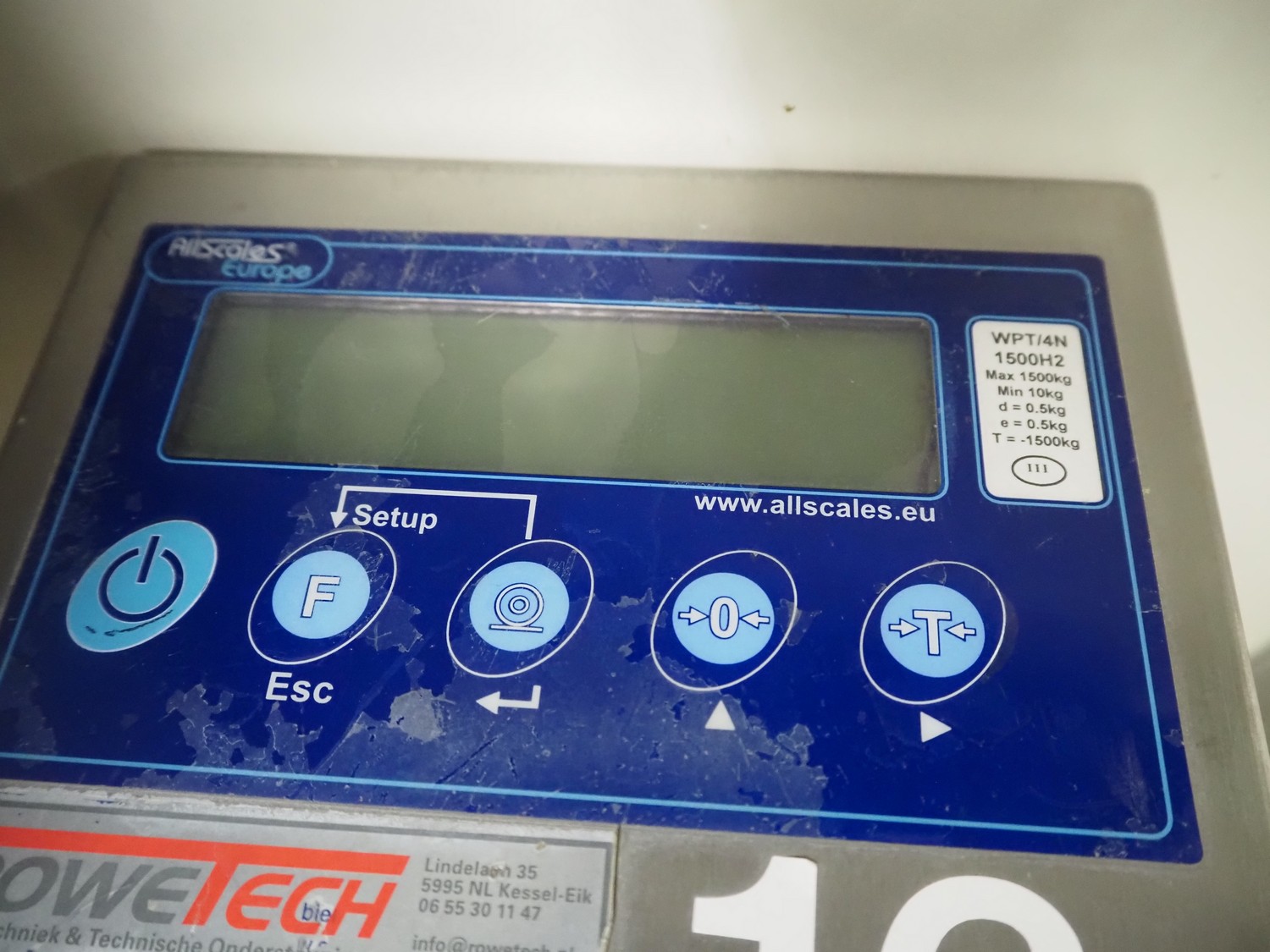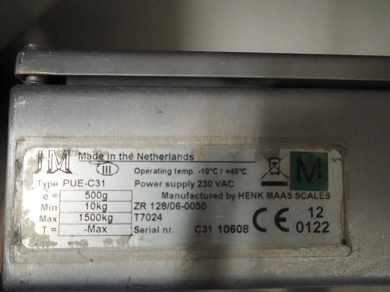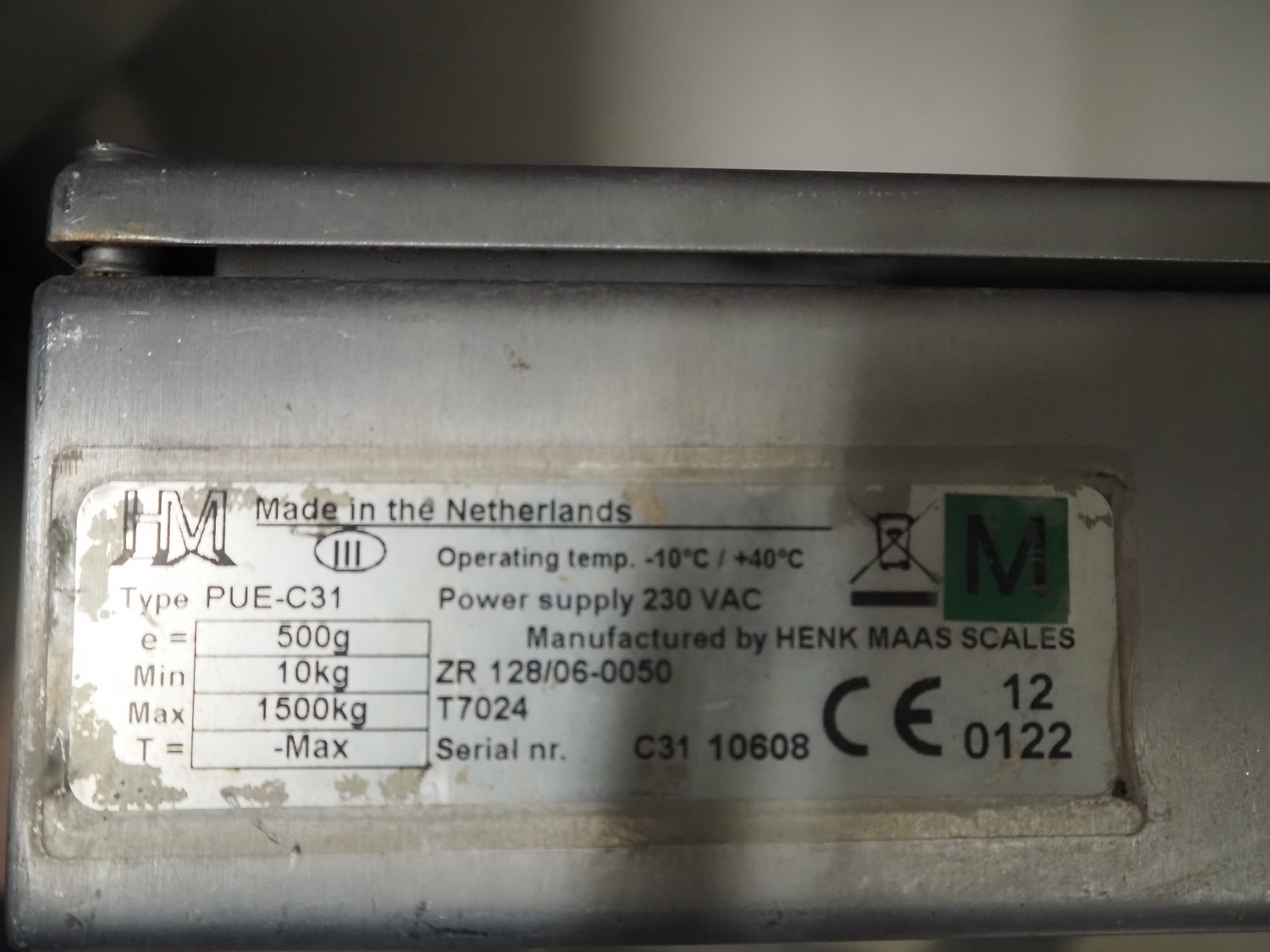 Henk Maas Scales floor weighing scale with indicator, type: PUE-C31, serial number: C31 10608, maximum: 1500 kg, minimum: 10 kg,e = 500 gram, dimensions scale: 1400 mm x 1200 mm.