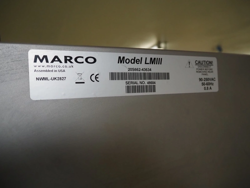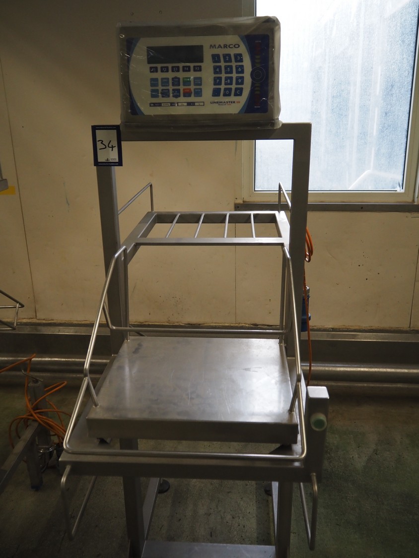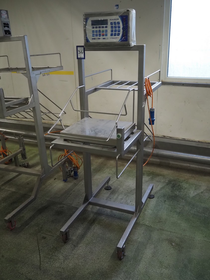 Marco weighing scale for crates on s/s mobile frame, model: LMIII, serial number: 49584, 90-250 V, 50-60 Hz, 0.8 A, maximum: 20000 gram, minimum: 20 gram, e= 1 gram, dimensions scale: 440 mm x 400 mm, total dimensions: 1280 mm x 550 mm x 1780 mm.