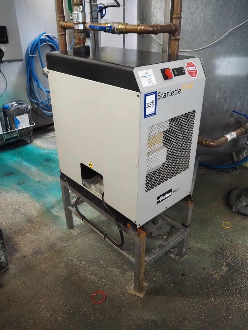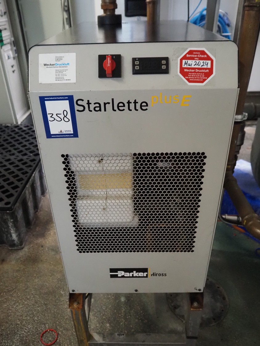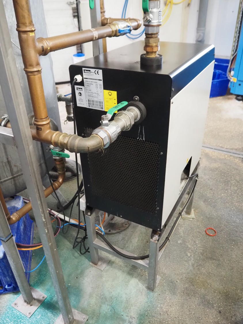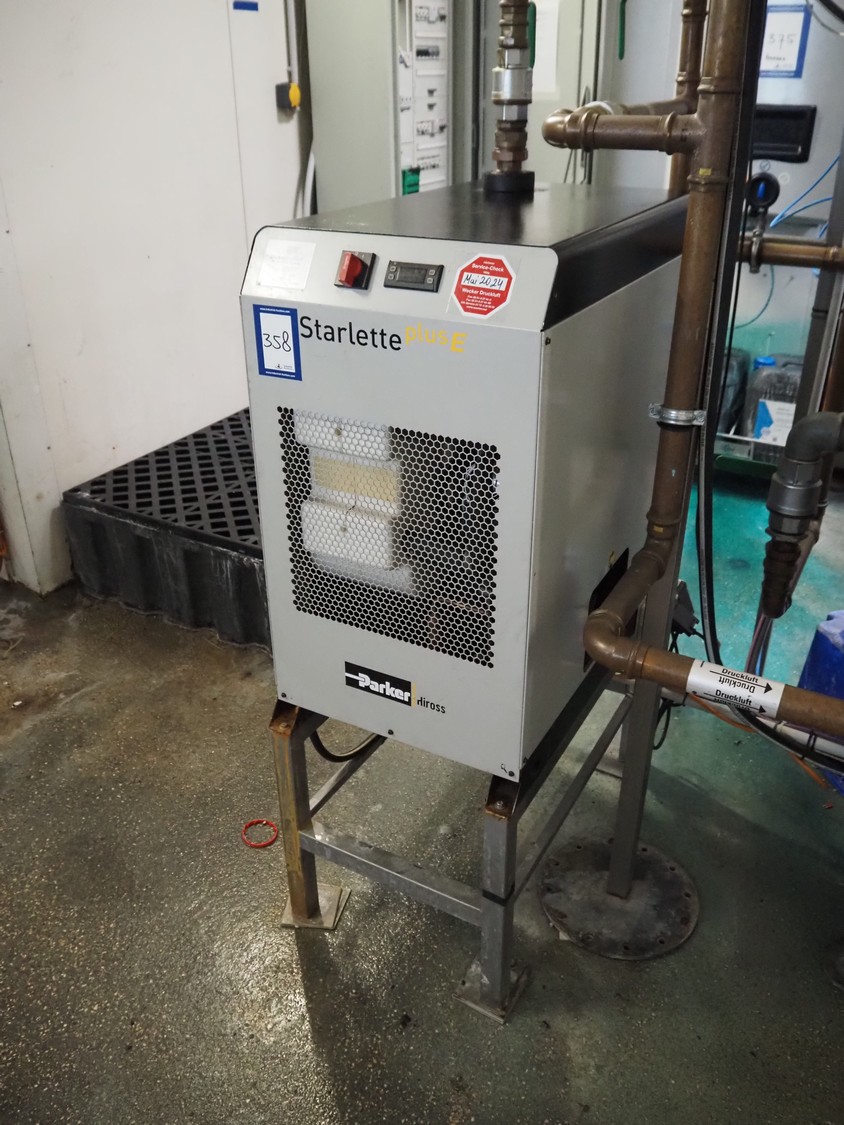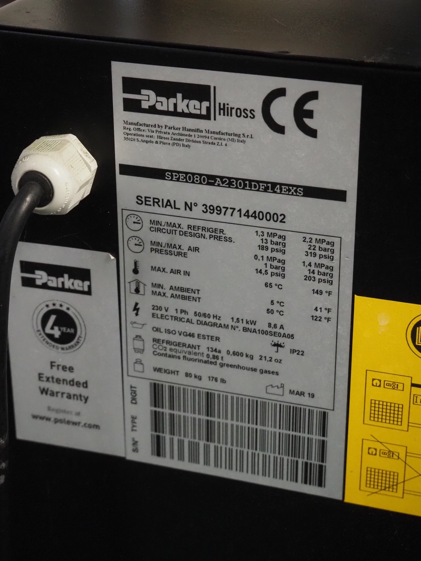 Parker Hiross air dryer on s/s frame, model: SPE080-A2301DF14EXS, serial number: 399771440002, 230 V, 1 Ph, 50/60 Hz, 8.6 A, 1.51 kW, refrigerant: R134a, 0.600 kg, dimensions: 450 mm x 750 mm x 1300 mm. Including 2 Parker Zander filters, model: GL11A / GL11XLH, year of construction: 2014, volume: 2.0 dm³ and Airleader Easy switch cabinet.