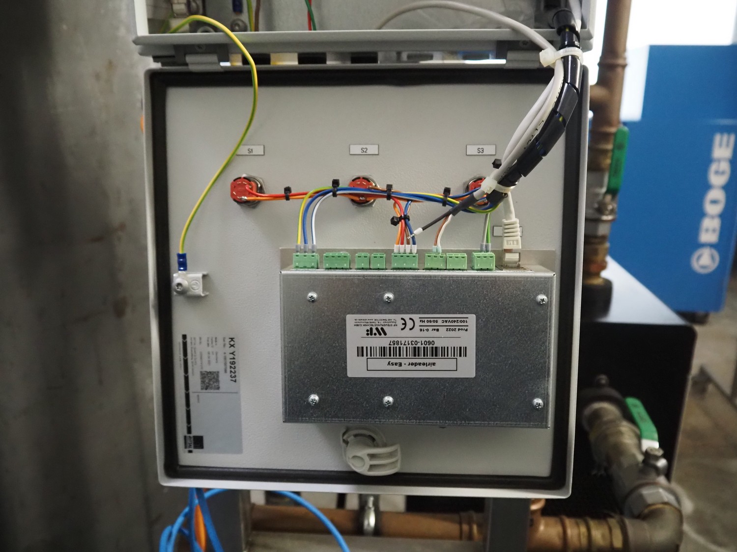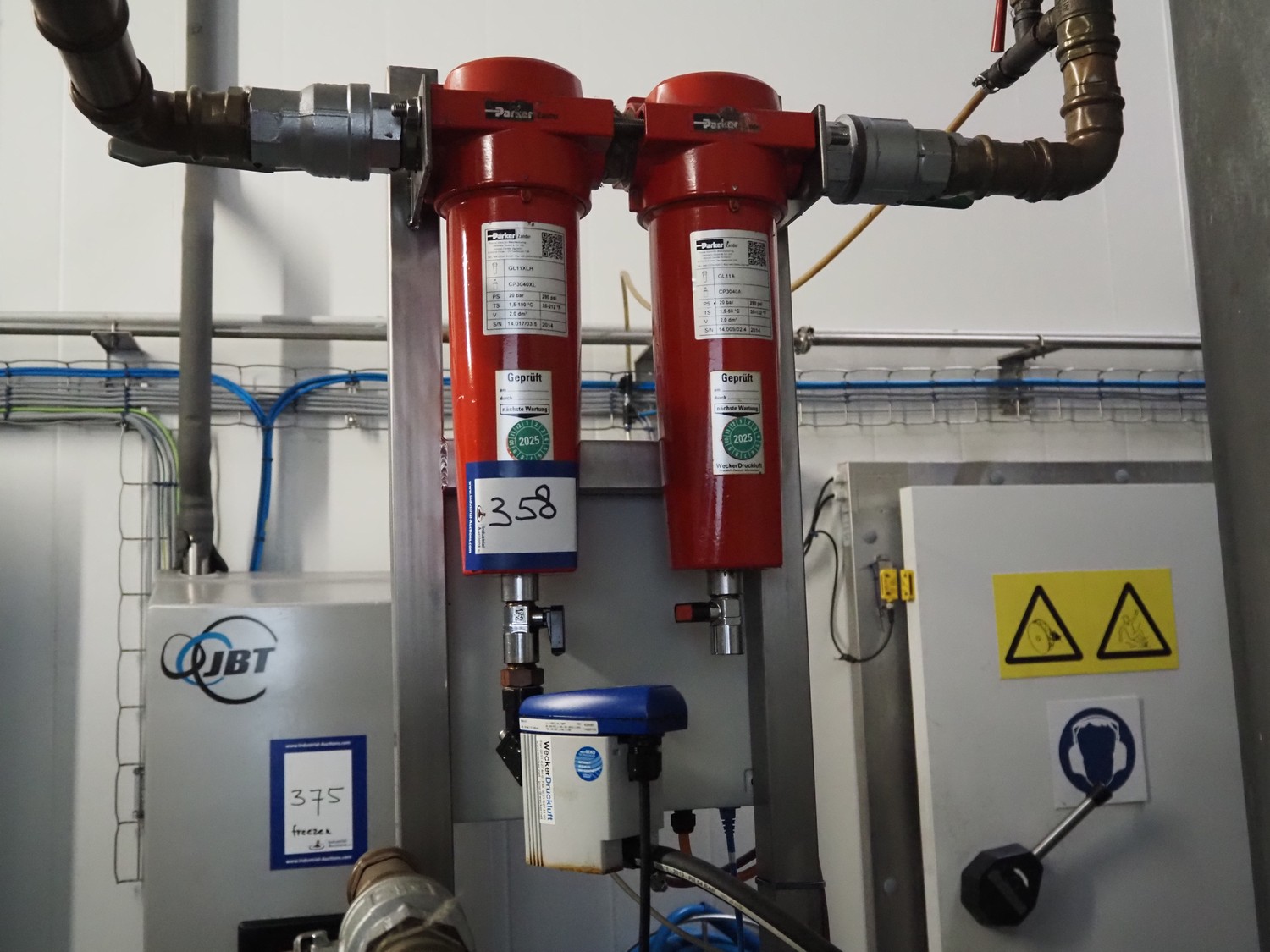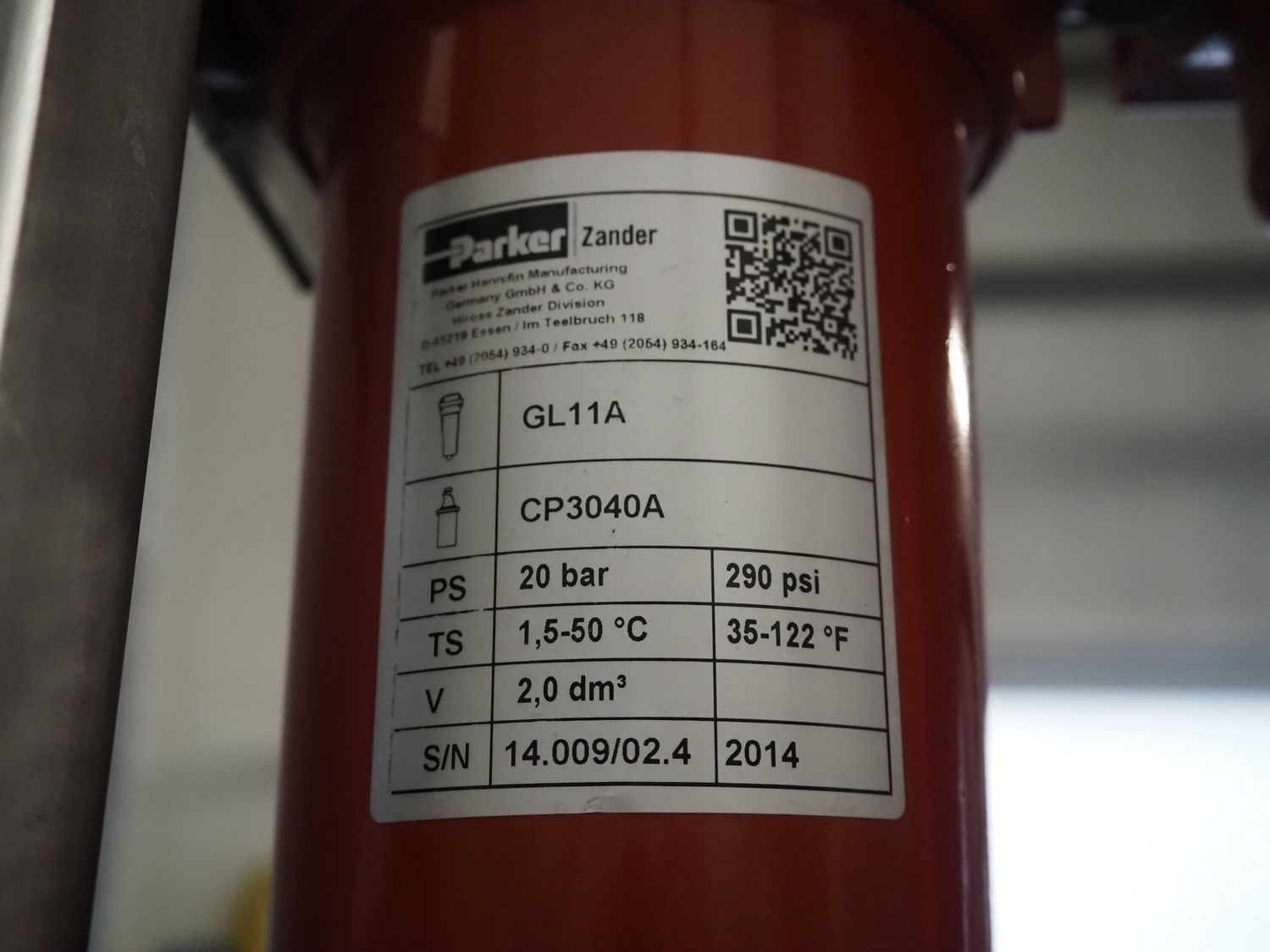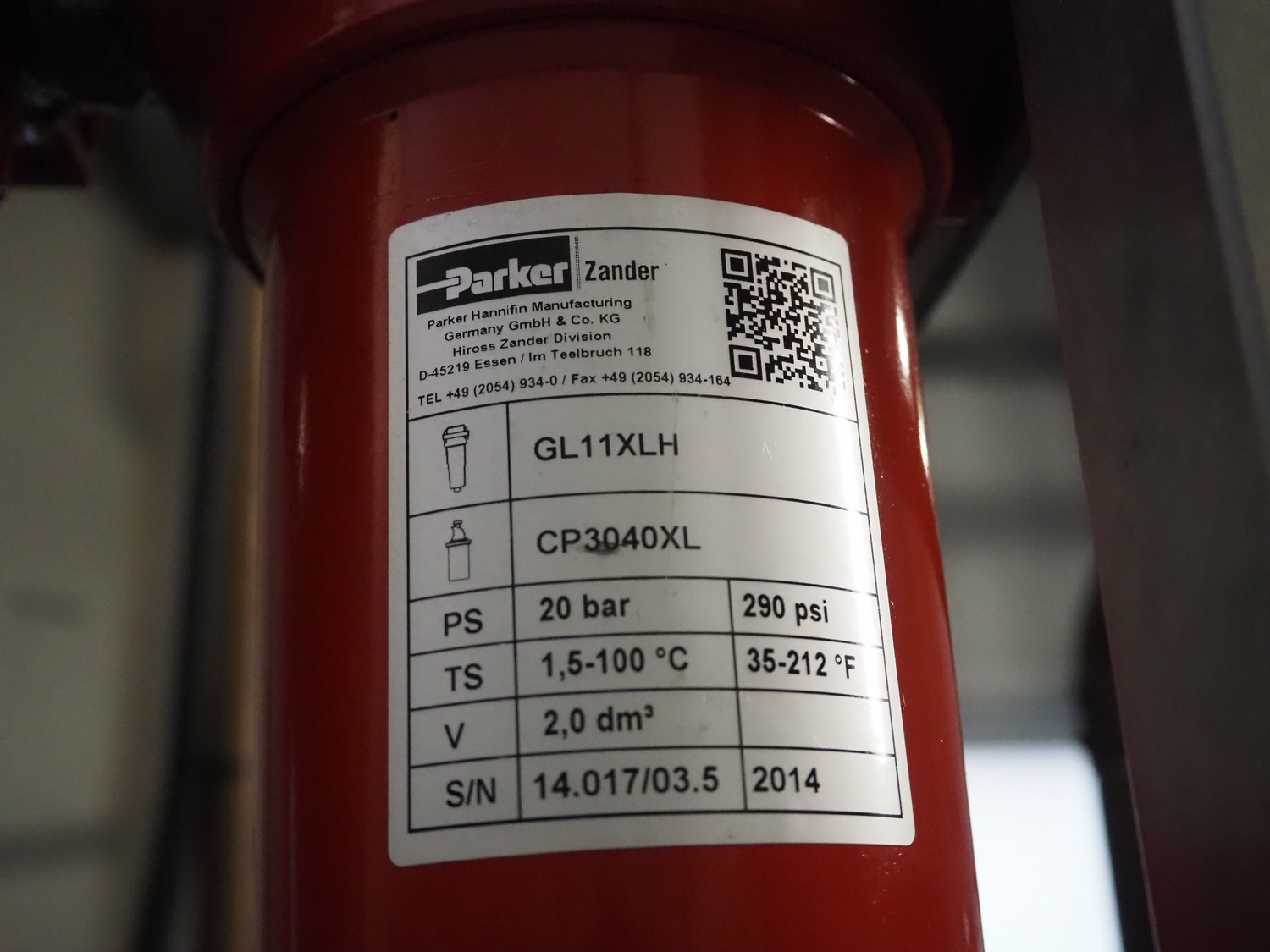 Parker Hiross air dryer on s/s frame, model: SPE080-A2301DF14EXS, serial number: 399771440002, 230 V, 1 Ph, 50/60 Hz, 8.6 A, 1.51 kW, refrigerant: R134a, 0.600 kg, dimensions: 450 mm x 750 mm x 1300 mm. Including 2 Parker Zander filters, model: GL11A / GL11XLH, year of construction: 2014, volume: 2.0 dm³ and Airleader Easy switch cabinet.