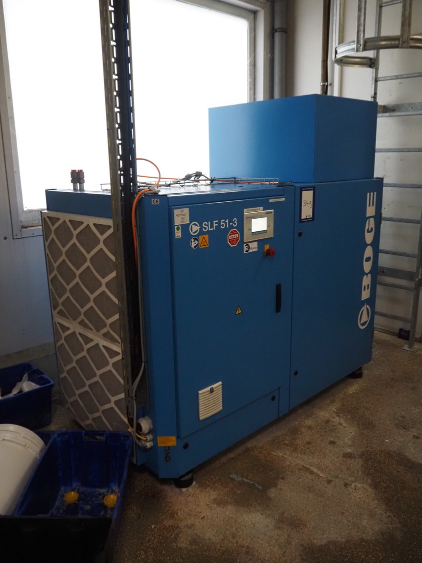 Boge Kompressoren screw air compressor, type: SLF 51-3, machine number: 5146873, year of construction: 01-2020, volume: 2.30 - 7.16 m³ / minute, 8 bar, 2520 rates per minute, motor power: 37 + 1.10 kW, total dimensions: 2000 mm x 1100 mm x 1950 mm.
