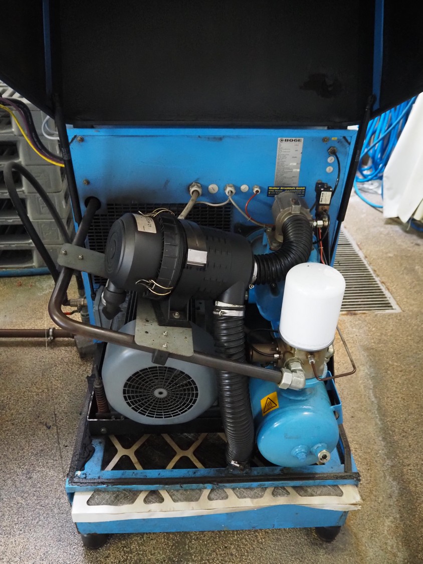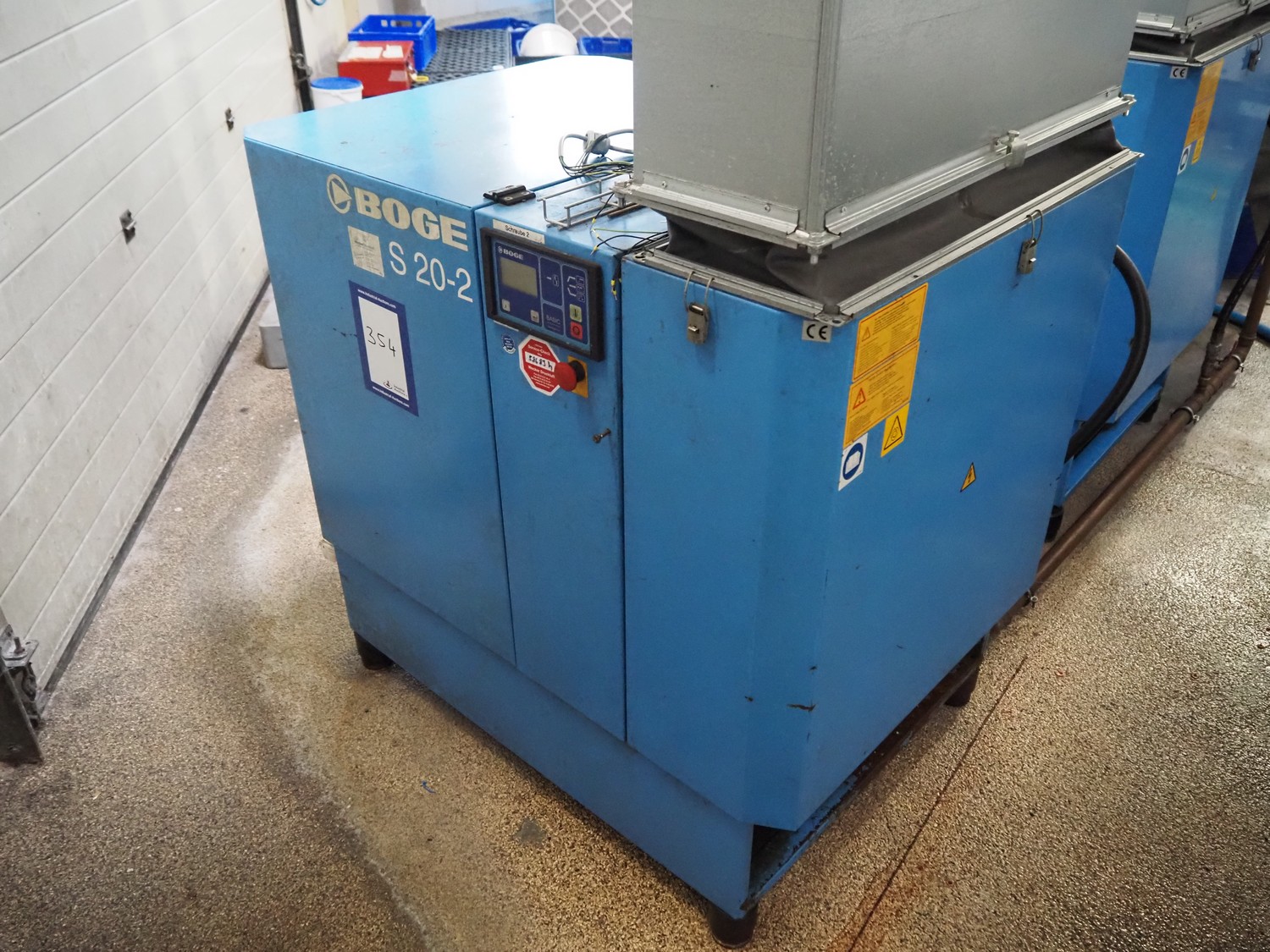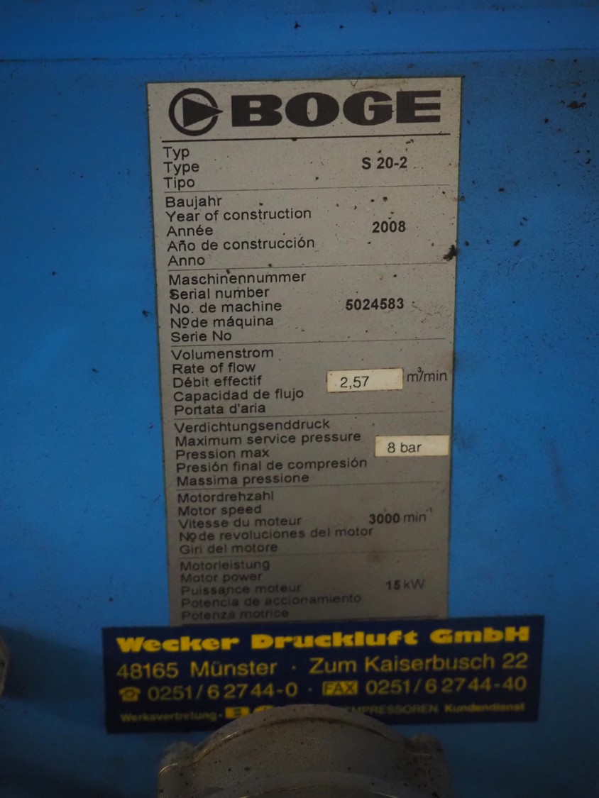 Boge Kompressoren screw air compressor, type: S 20-2, machine number: 5024583, year of construction: 2008, volume: 2.57 m³ / minute, 8 bar, 3000 rates per minute, motor power: 15 kW, total dimensions: 1200 mm x 900 mm x 1160 mm.