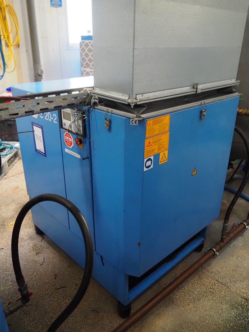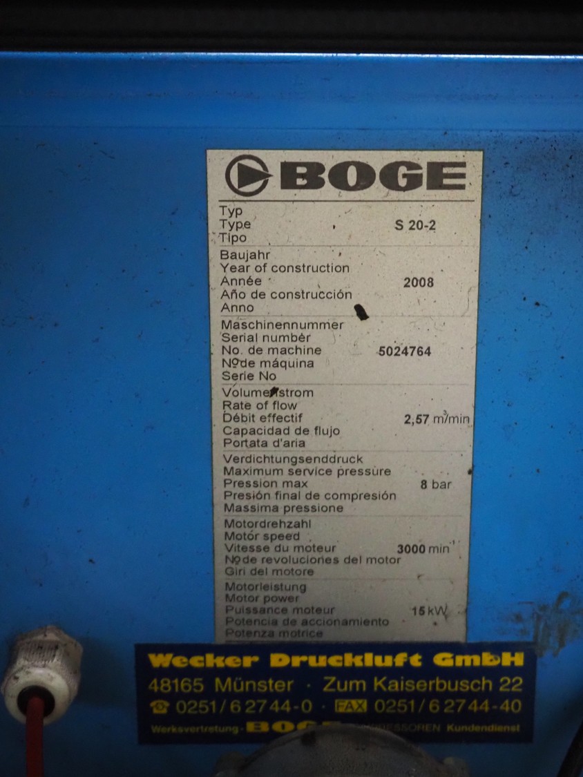 Boge Kompressoren screw air compressor, type: S 20-2, machine number: 5024764, year of construction: 2008, volume: 2.57 m³ / minute, 8 bar, 3000 rates per minute, motor capacity: 15 kW, total dimensions: 1200 mm x 900 mm x 1160 mm.