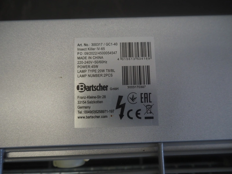 Bartscher GmbH insect killer, model: IV-65, serial number: 4500054547, year of construction: 09/2022, 220-240 V, 50-60 Hz, 45 W, dimensions: 650 mm x 100 mm x 370 mm.