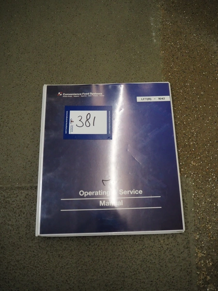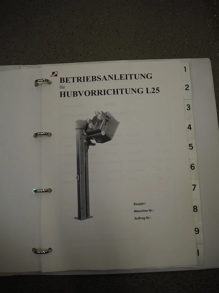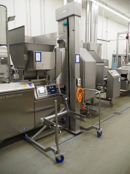 CFS mobile lifter for 200 liter meat bins, machine type: LFT ( R ), machine number: 1642, 400 V, 3 Ph, 50 Hz, 1.8 A, 0.55 kW, 310 kg, elevating height: 2200 mm (adjustable), total dimensions: 1200 mm x 1300 mm x 3000 mm.