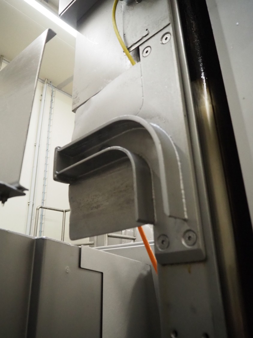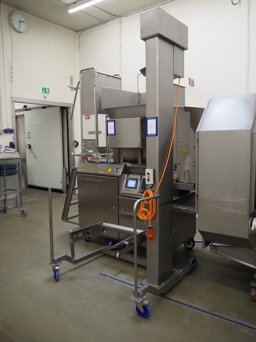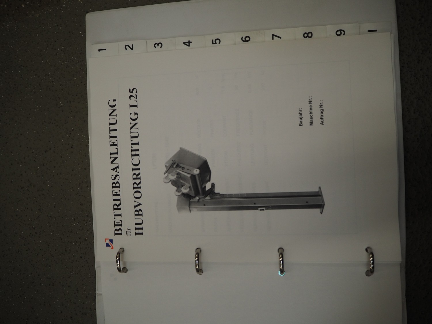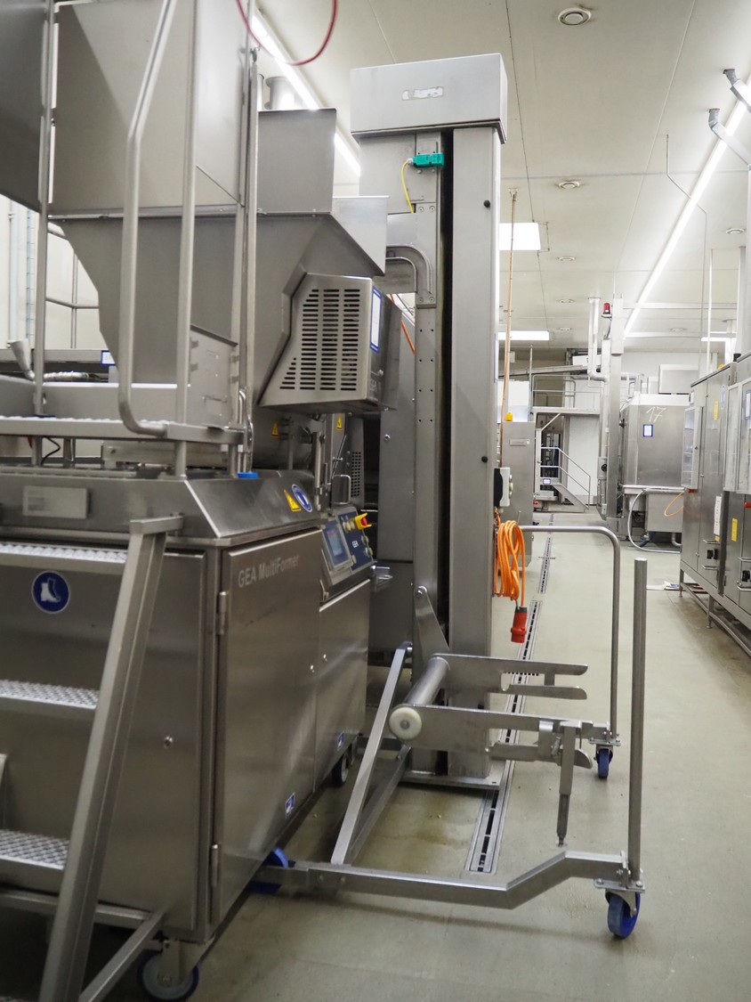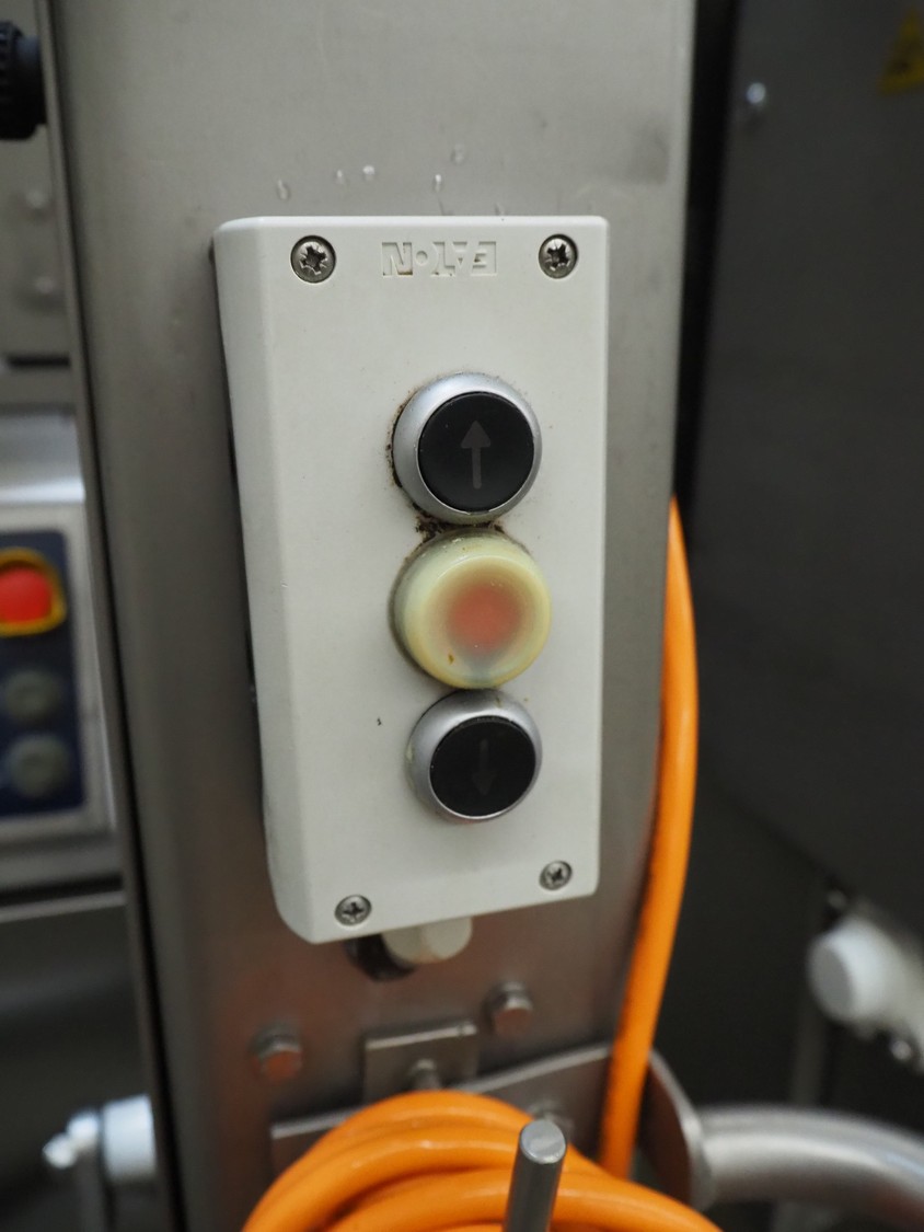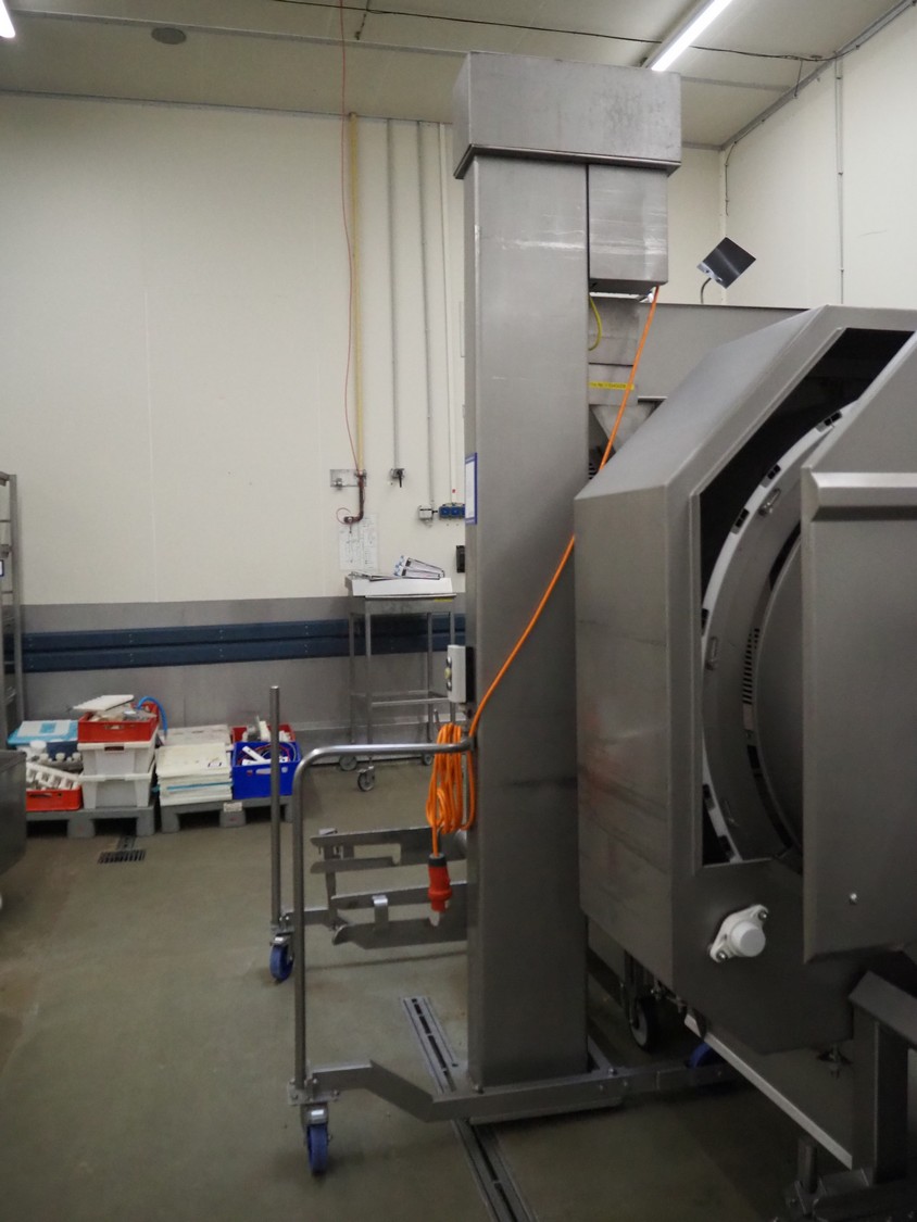 CFS mobile lifter for 200 liter meat bins, machine type: LFT ( R ), machine number: 1642, 400 V, 3 Ph, 50 Hz, 1.8 A, 0.55 kW, 310 kg, elevating height: 2200 mm (adjustable), total dimensions: 1200 mm x 1300 mm x 3000 mm.