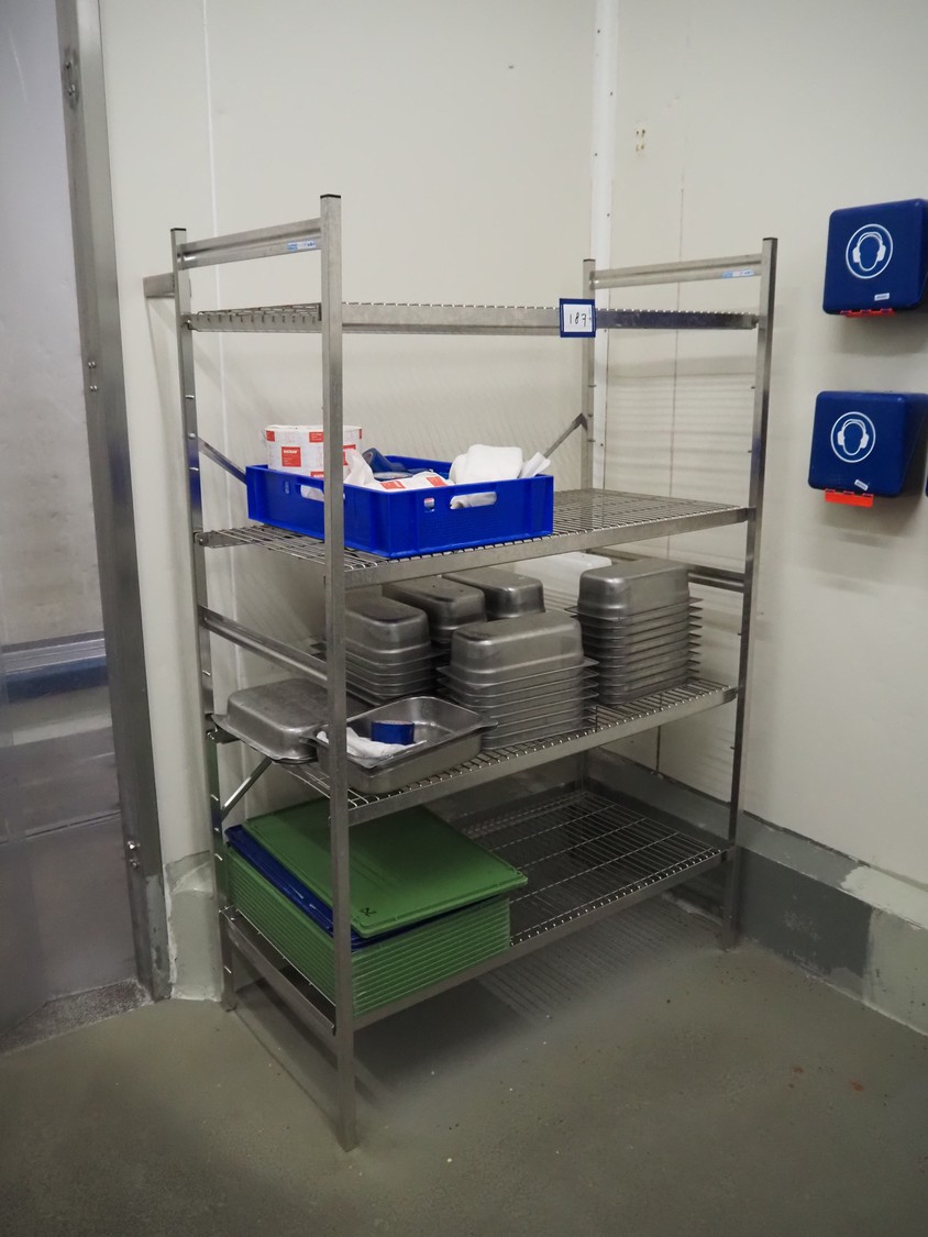 S/s rack with various s/s bins, plastic lids and hygiene material, dimensions rack: 1200 mm x 750 mm x 1800 mm.
