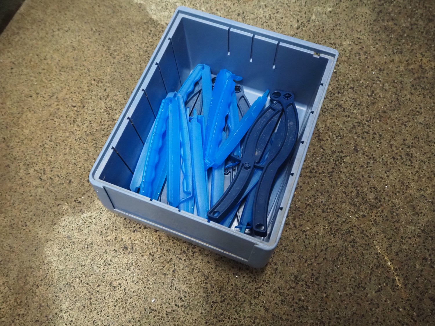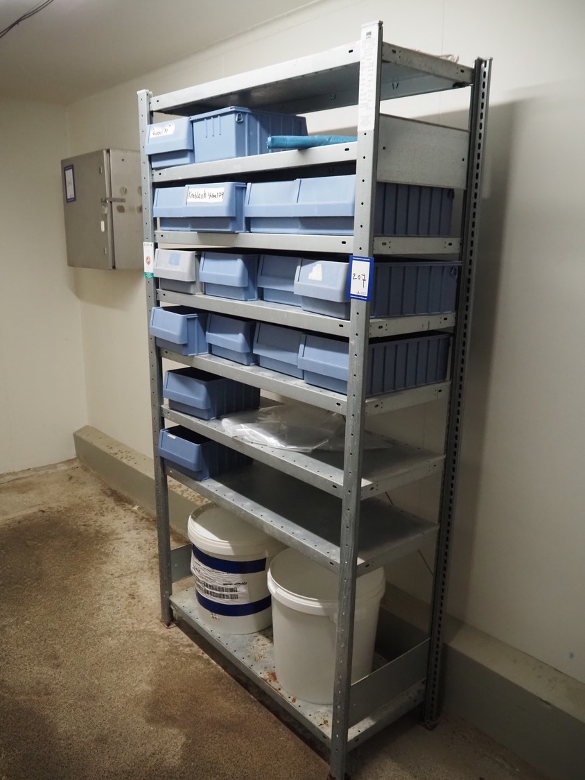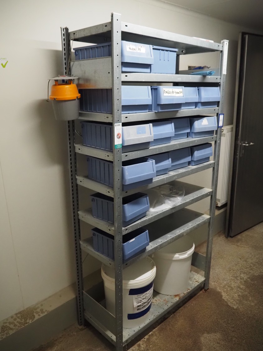 Steel rack with 16 plastic storage bins, dimensions rack: 1050 mm x 450 mm x 2010 mm.