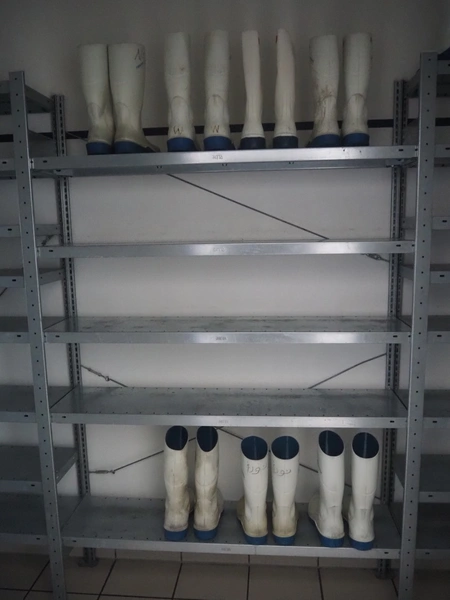 Aluminium rack, 8 floors, total dimensions: 4360 mm x 360 mm x 2010 mm. Including some shoes and boots.
