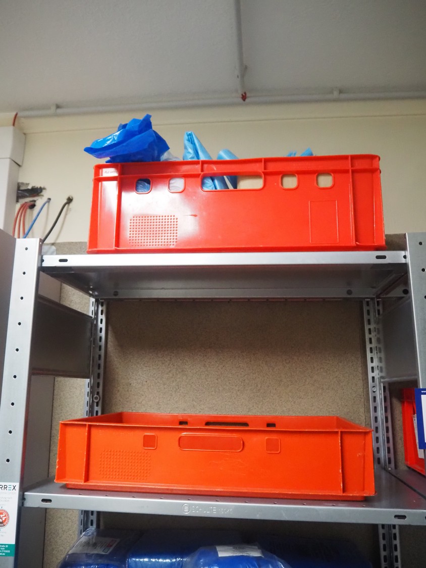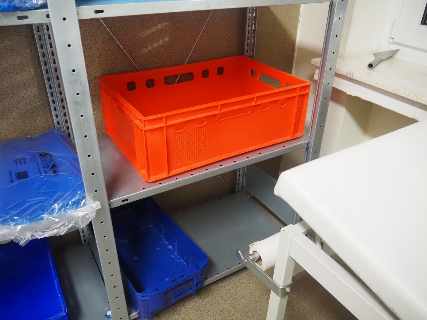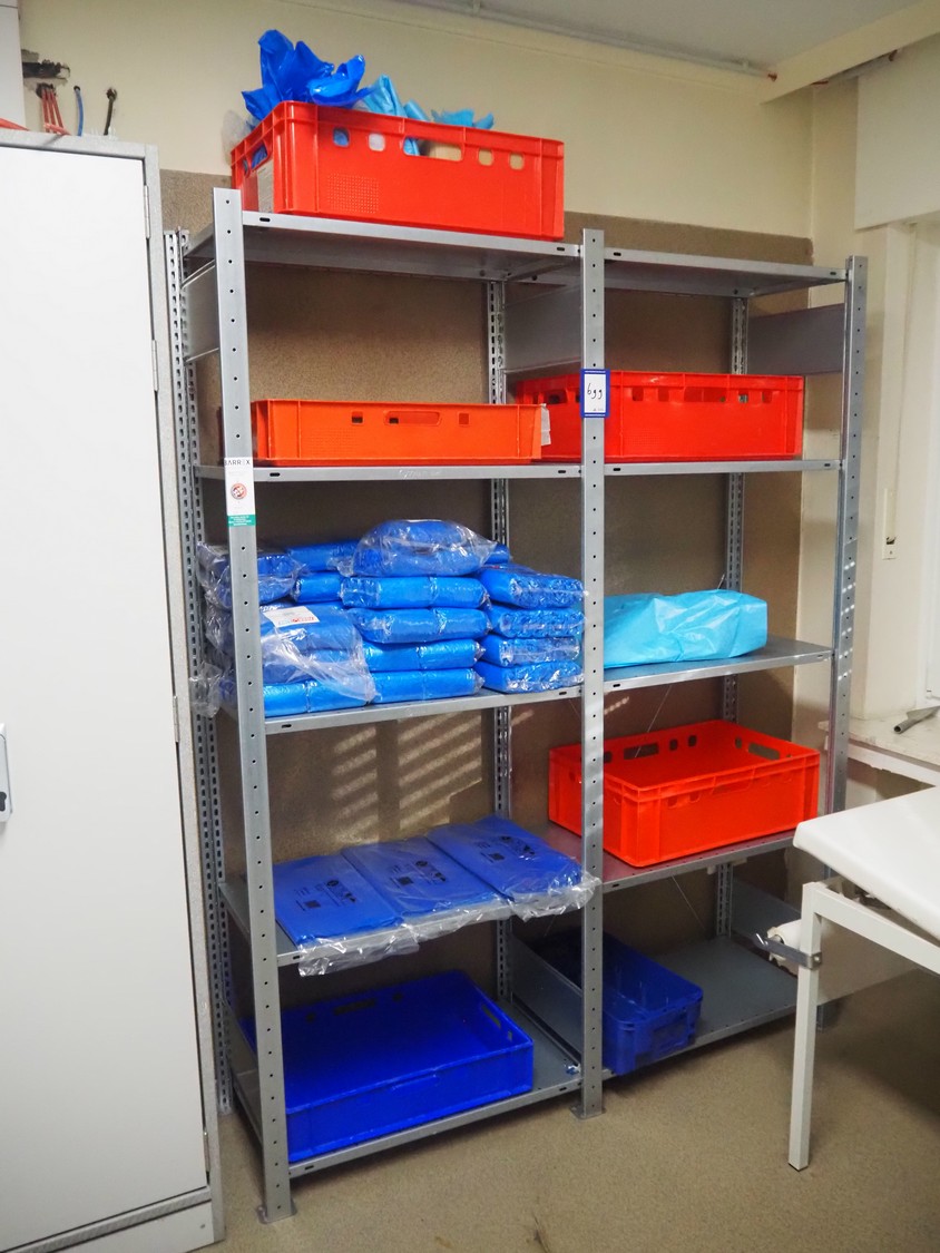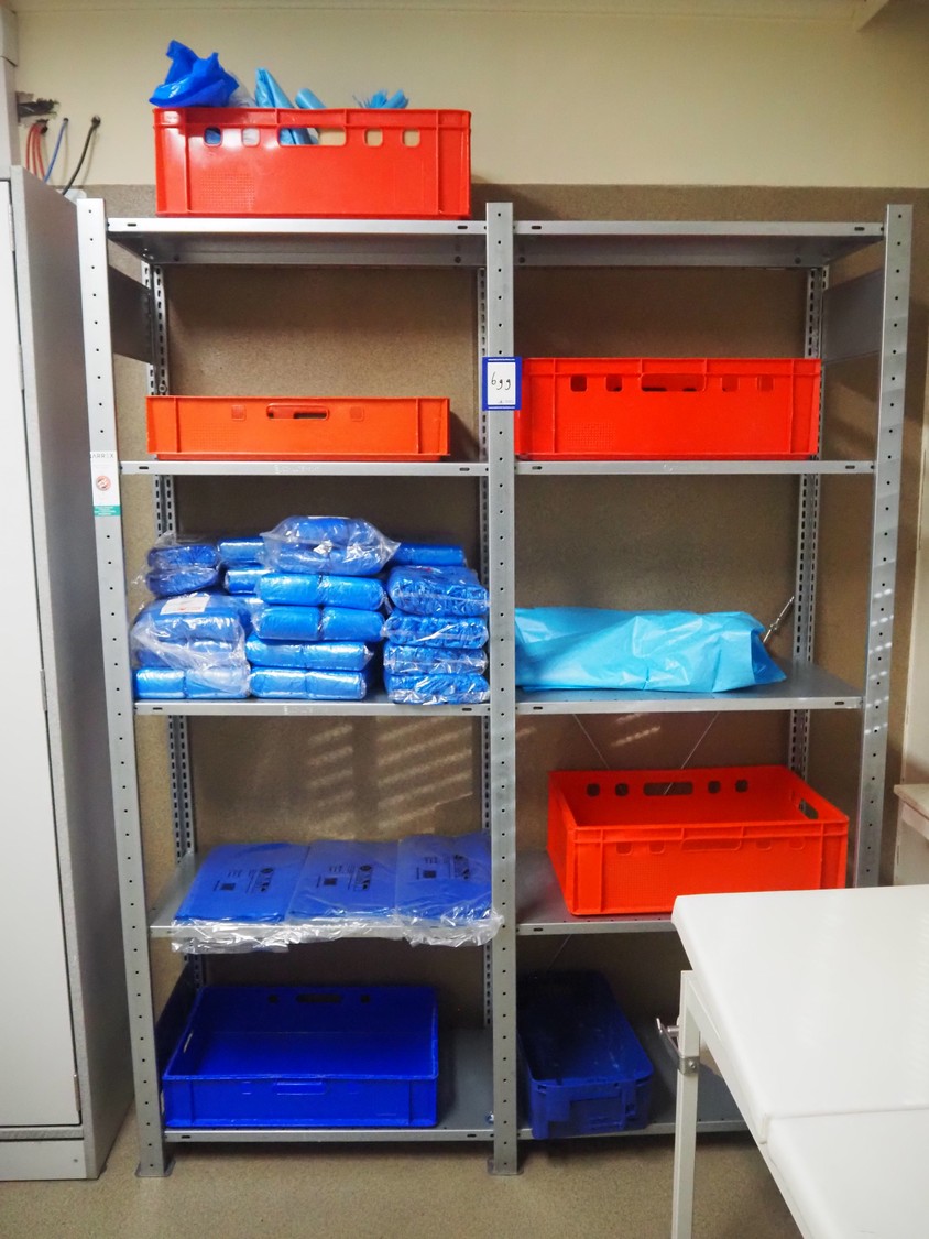 Barrex Lagertechnik GmbH galvanized rack, 5 floors, dimensions: 1600 mm x 440 mm x 2000 mm. Including content, amongst other: Foodline EW-Armstulpen.