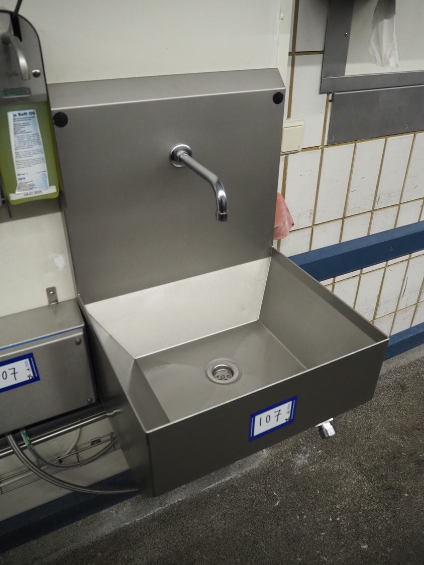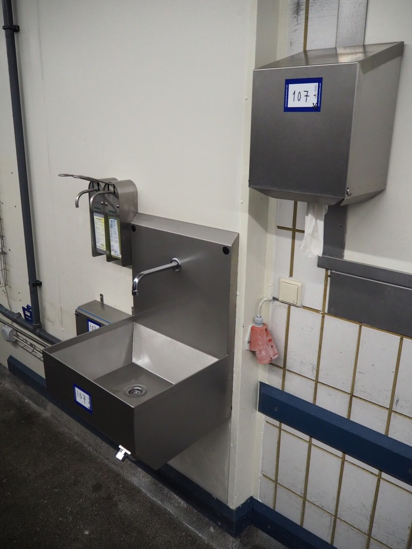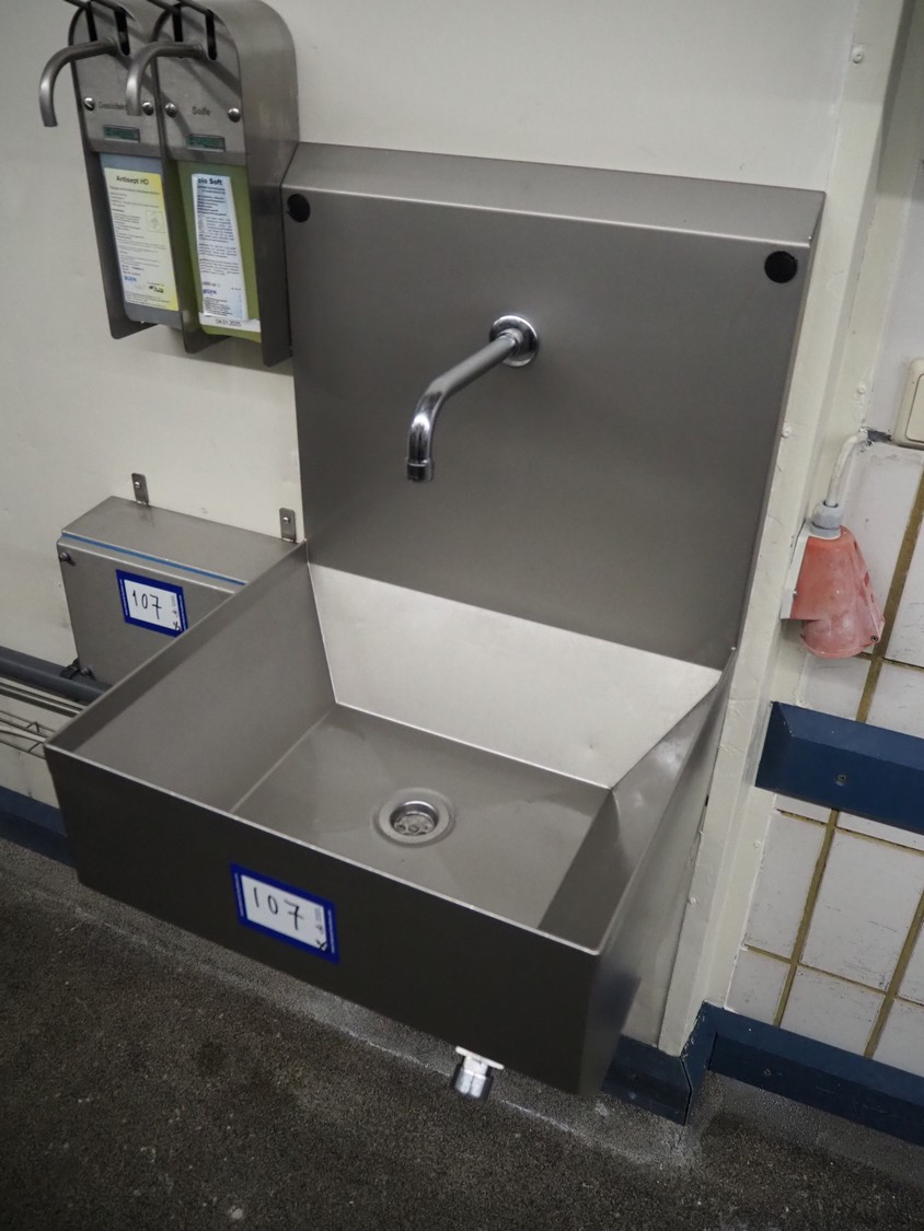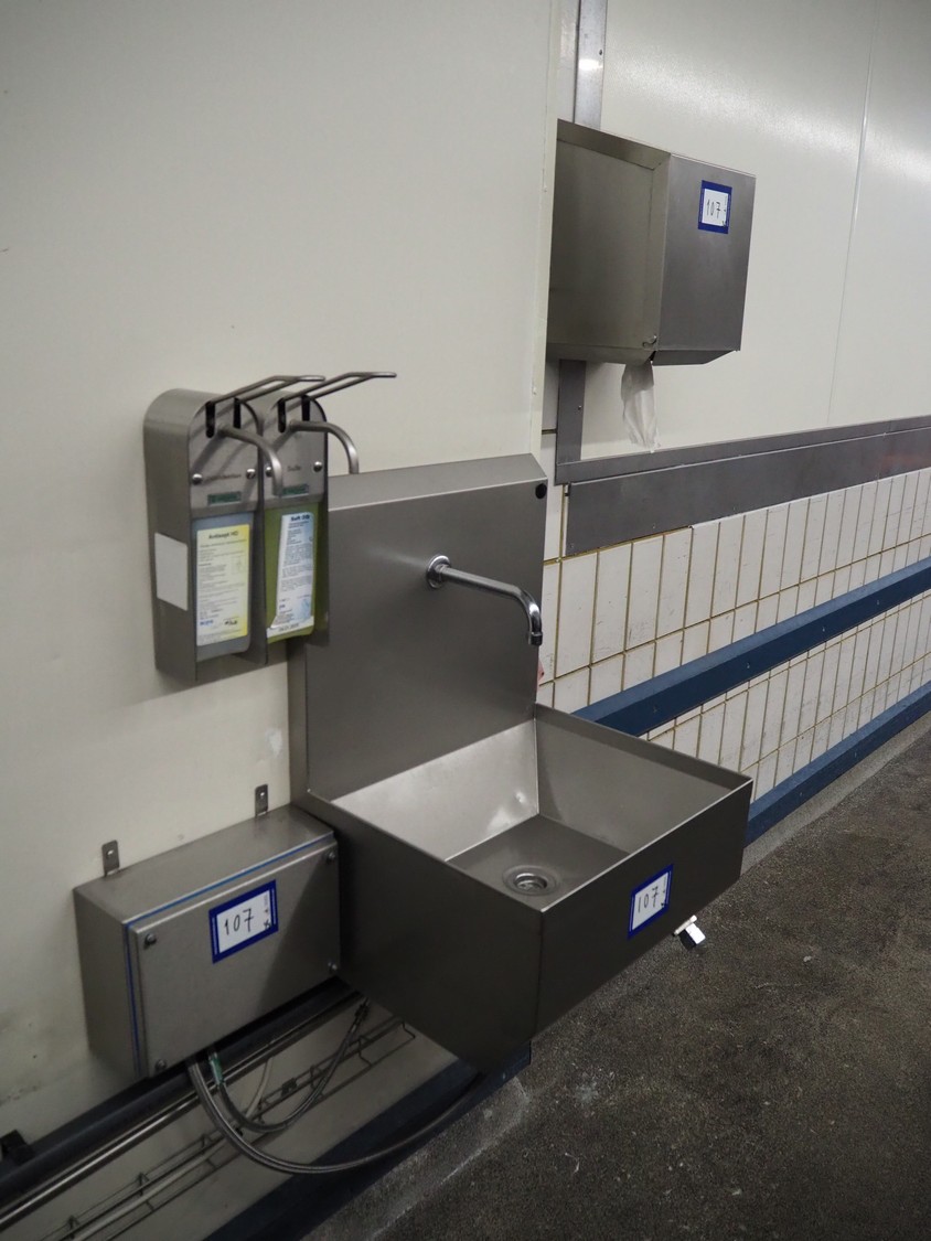 S/s sink, knee control, dimensions: 500 mm x 450 mm x 700 mm, s/s paper dispenser, dimensions: 280 mm x 250 mm x 580 mm, 2 Mohn s/s soap dispensers.