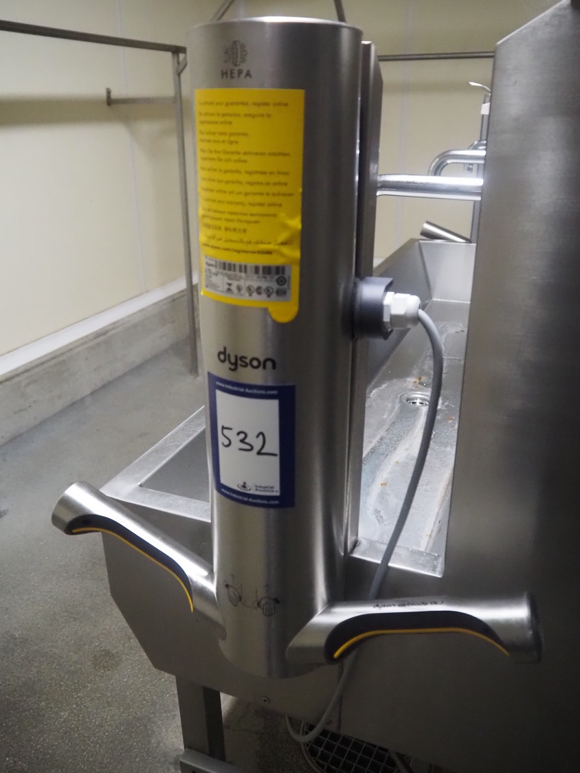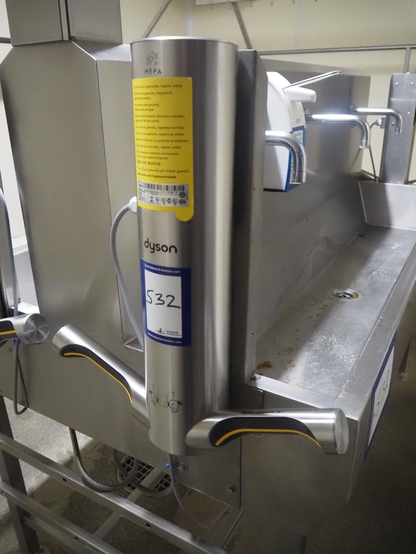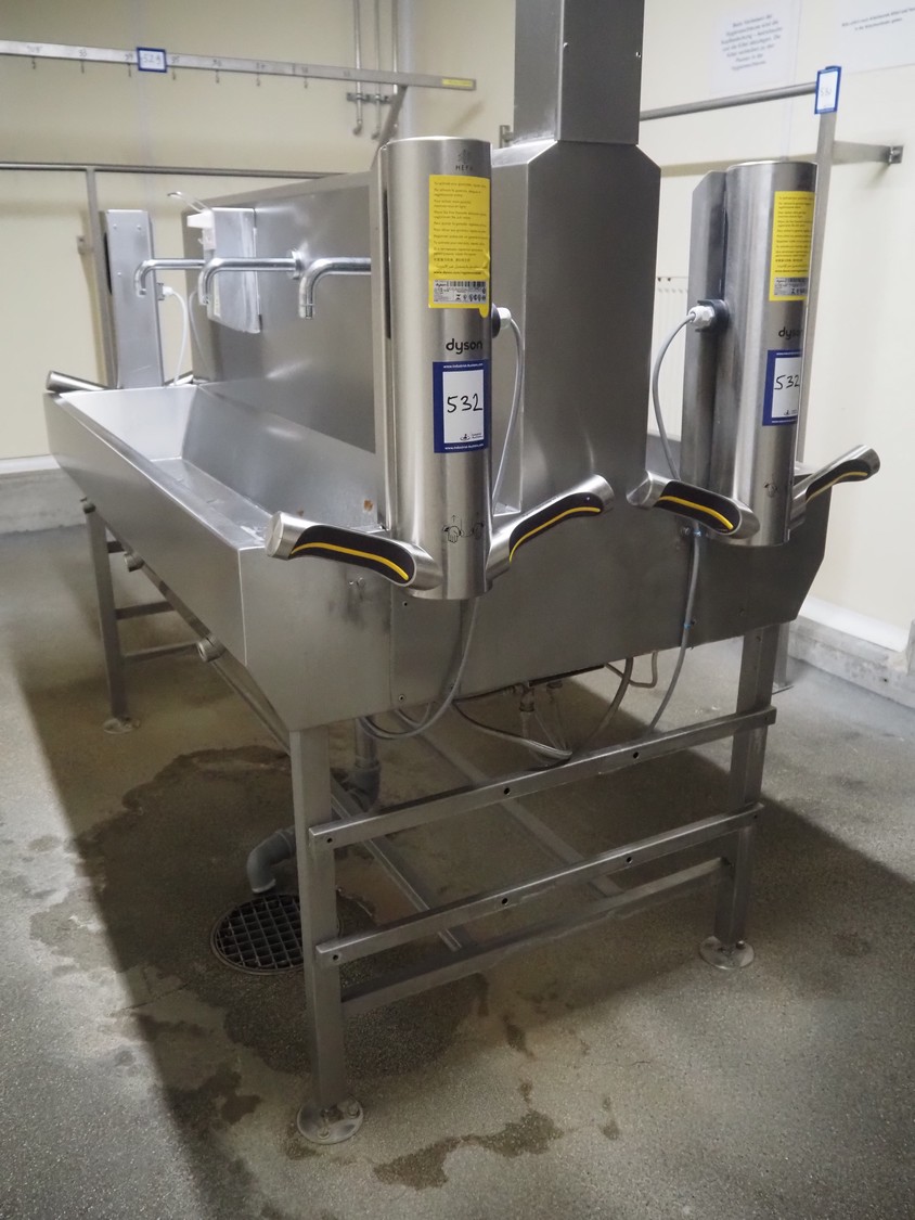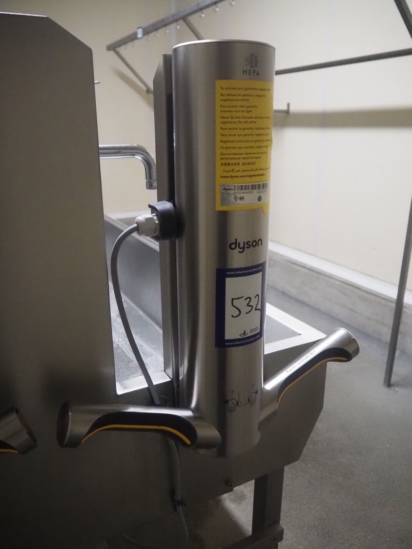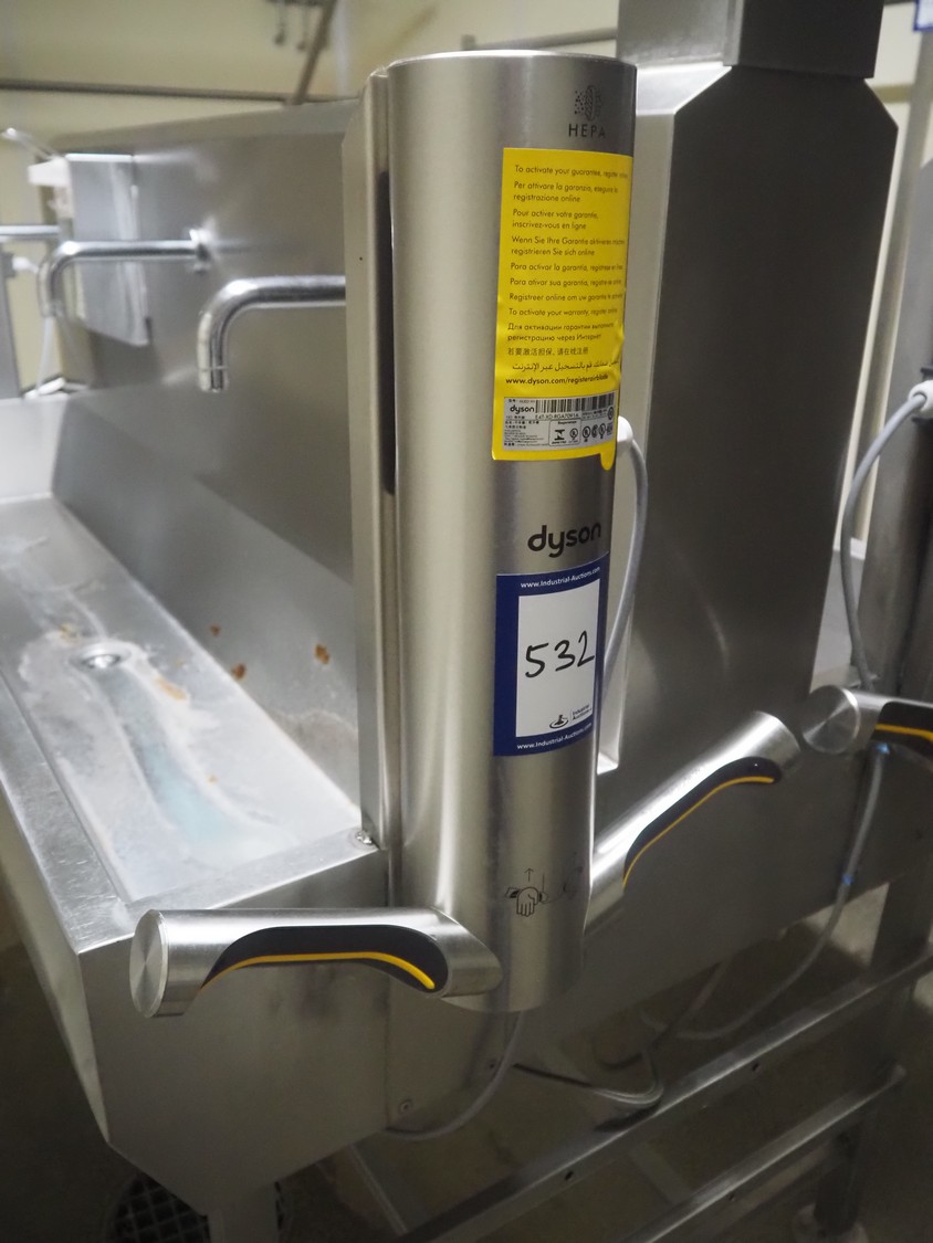 S/s sink with 6 faucets and 4 Dyson hand dryers, type hand dryers: (4x) HU03 HV, number: E4T-XD-MMA0335A, E4T-XD-RAA3200A, E4T-XD-NGA0334A, E4T-XD-RGA7091A, 200/240 V, 50/60 Hz, 900 W, 24 Ip, total dimensions: 1850 mm x 980 mm x 1360 mm.
