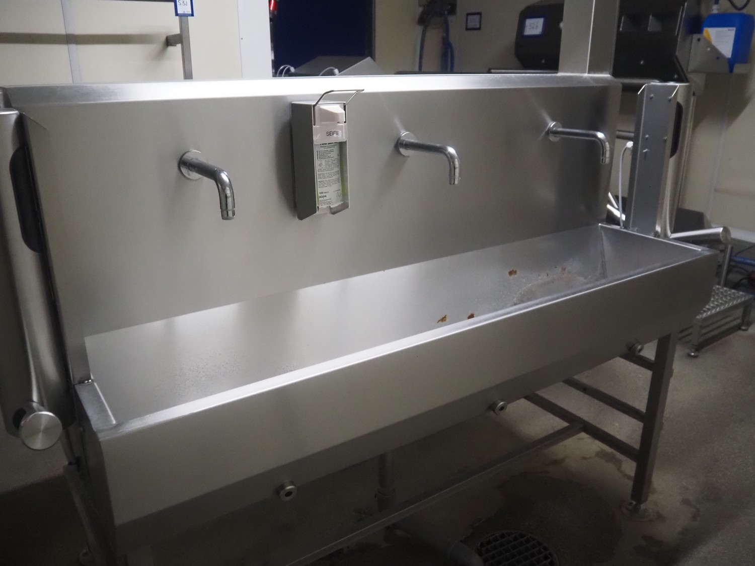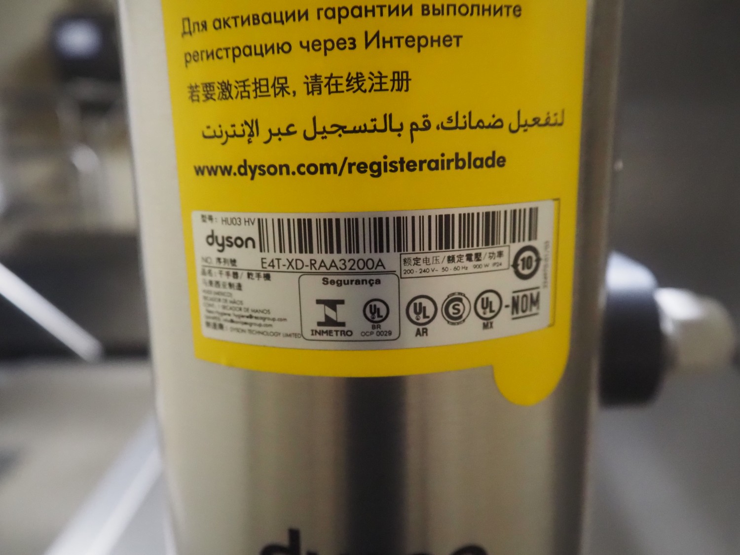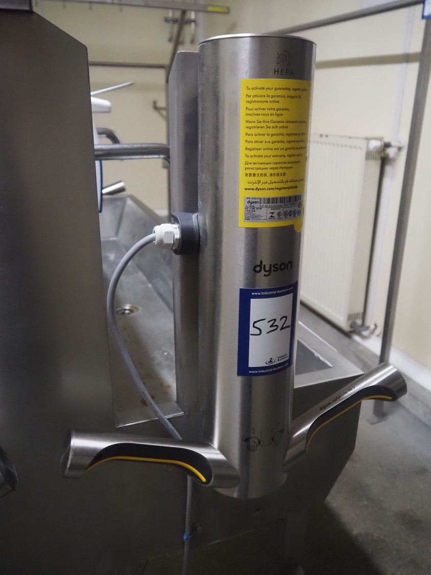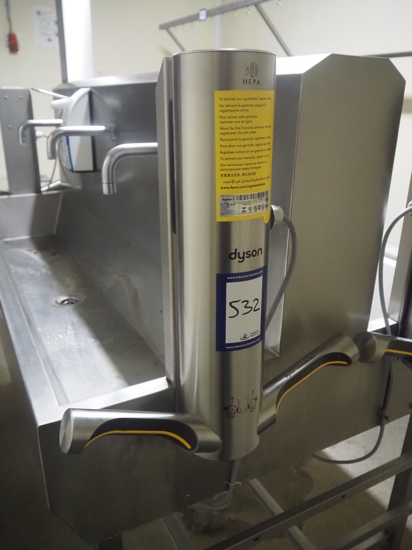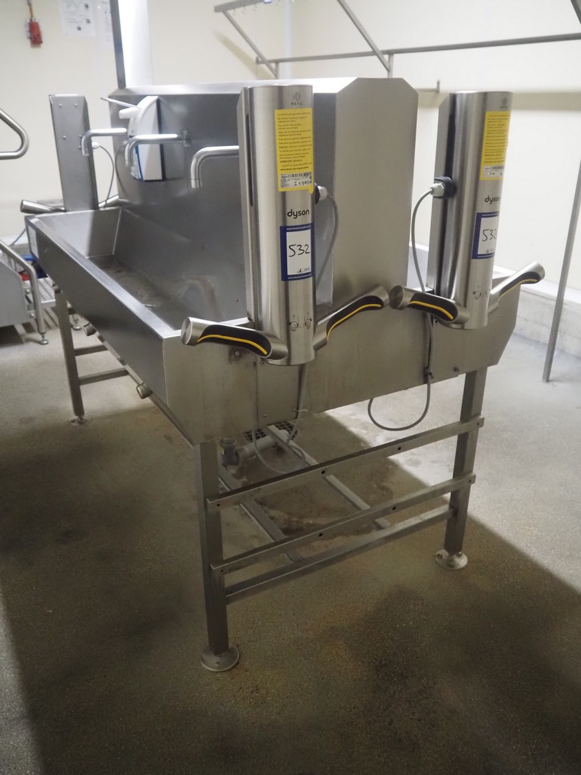S/s sink with 6 faucets and 4 Dyson hand dryers, type hand dryers: (4x) HU03 HV, number: E4T-XD-MMA0335A, E4T-XD-RAA3200A, E4T-XD-NGA0334A, E4T-XD-RGA7091A, 200/240 V, 50/60 Hz, 900 W, 24 Ip, total dimensions: 1850 mm x 980 mm x 1360 mm.
