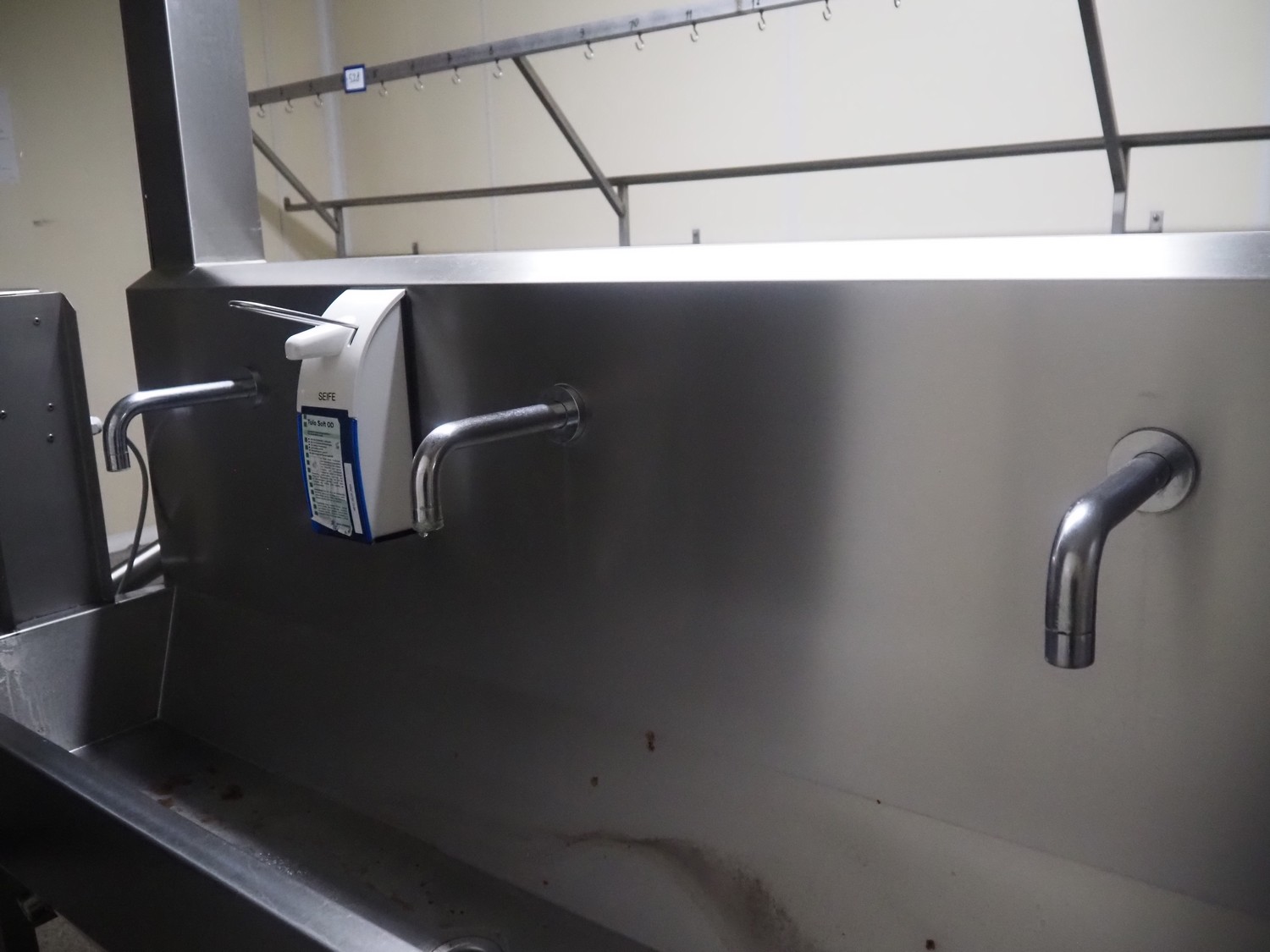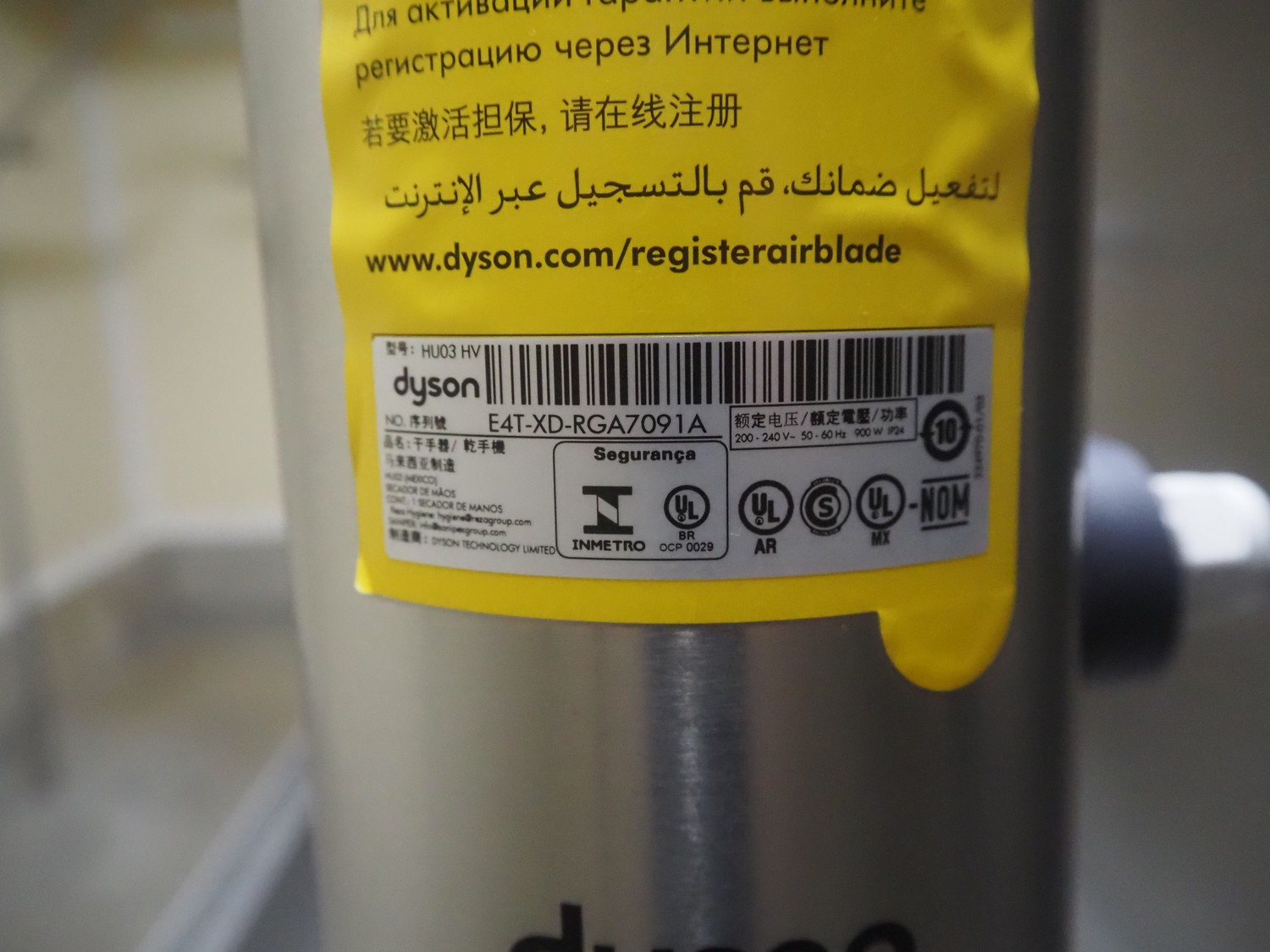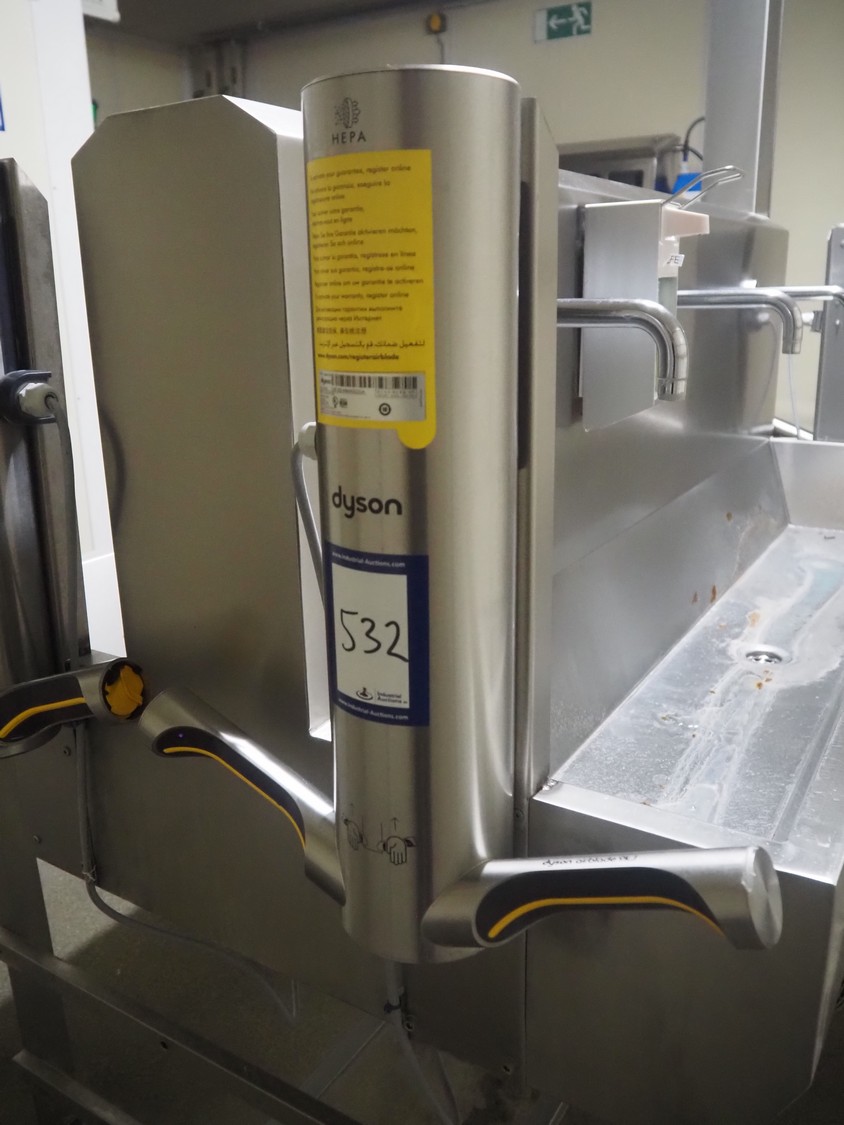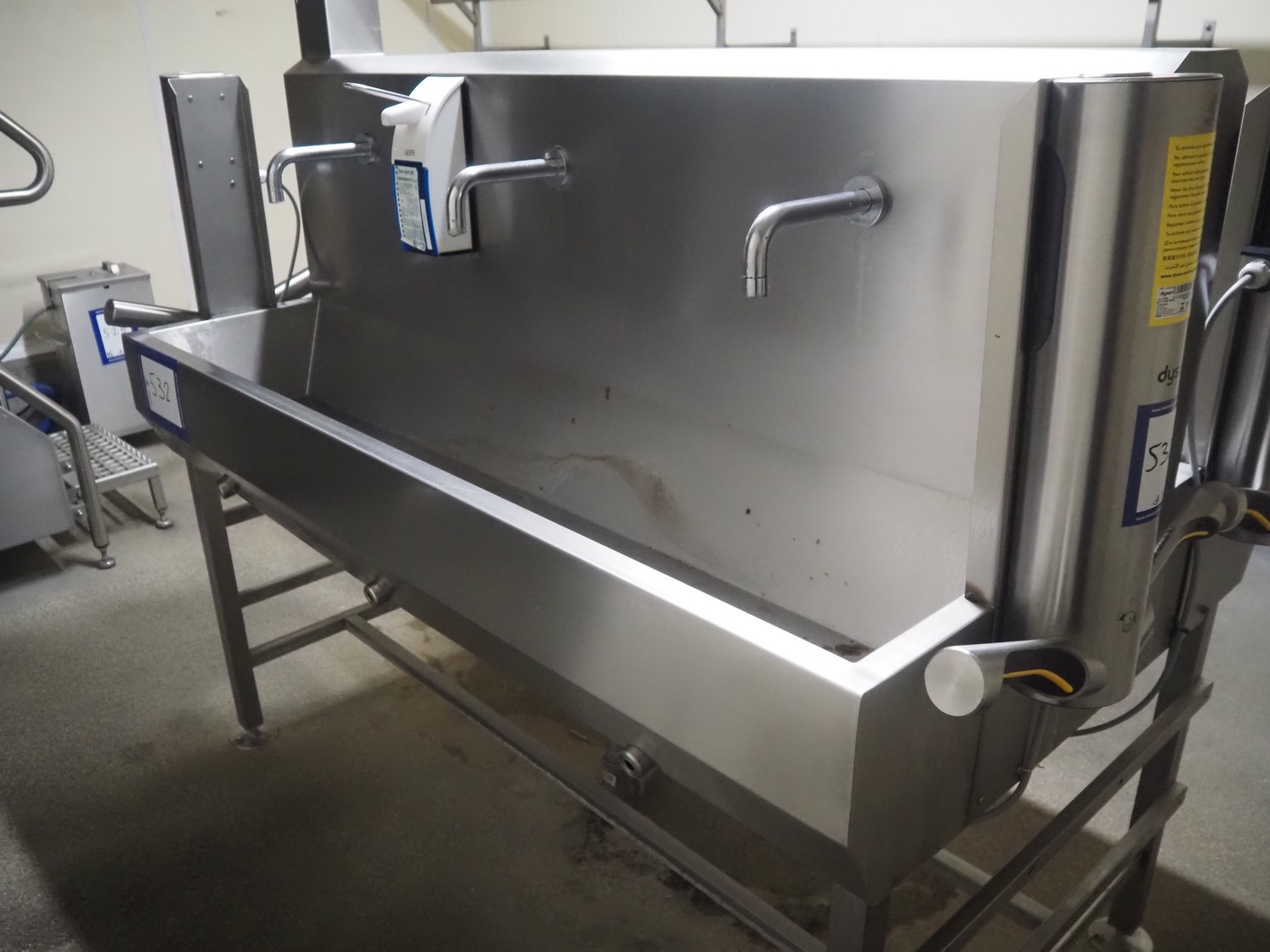 S/s sink with 6 faucets and 4 Dyson hand dryers, type hand dryers: (4x) HU03 HV, number: E4T-XD-MMA0335A, E4T-XD-RAA3200A, E4T-XD-NGA0334A, E4T-XD-RGA7091A, 200/240 V, 50/60 Hz, 900 W, 24 Ip, total dimensions: 1850 mm x 980 mm x 1360 mm.